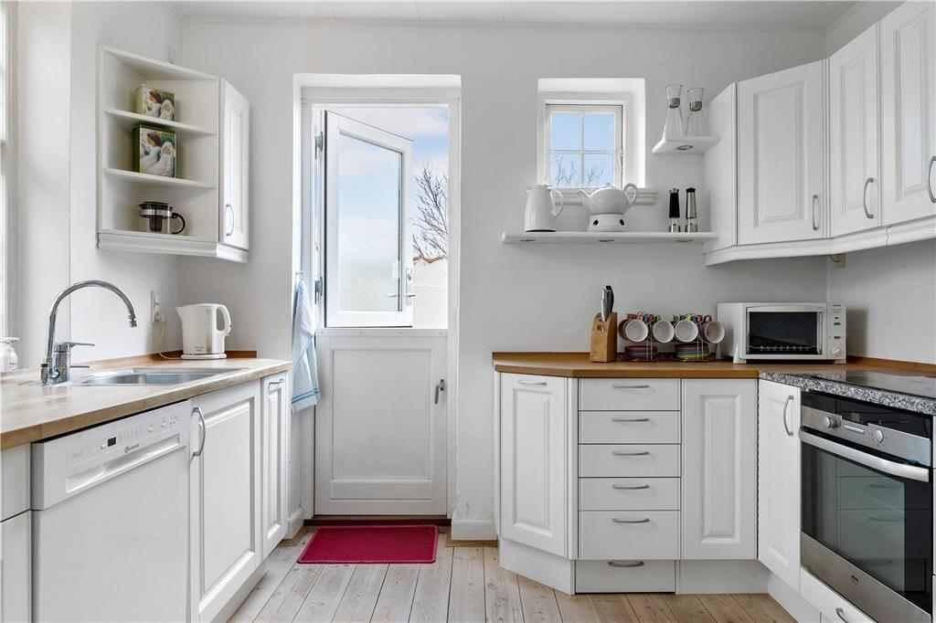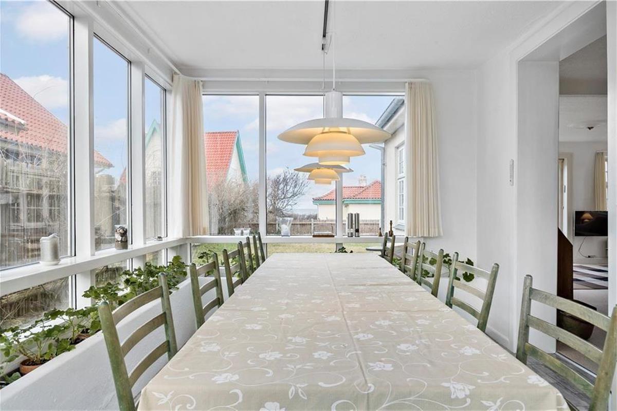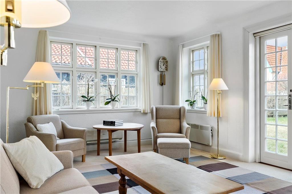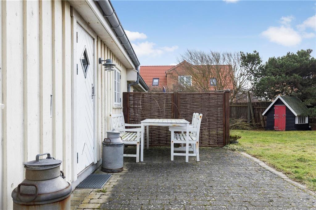 Die Außenbereiche sind darauf ausgelegt, das dänische Sommerleben in vollen Zügen zu genießen. Von der Terrasse zwischen Wohnzimmer und Wintergarten können Sie den Blick über die Wellen des Meeres schweifen lassen, während Sie eine Tasse Kaffee oder ein Glas Wein genießen. Beim Anbau gibt es eine große, südwestlich ausgerichtete Terrasse, auf der die Sonne von spätem Vormittag bis zum Sonnenuntergang scheint, ideal zum Sonnenbaden oder für Abendessen im Freien. Von hier aus können Sie auch die Kinder im Auge behalten, während sie im Spielhaus spielen oder auf der Schaukel im Garten schaukeln.
