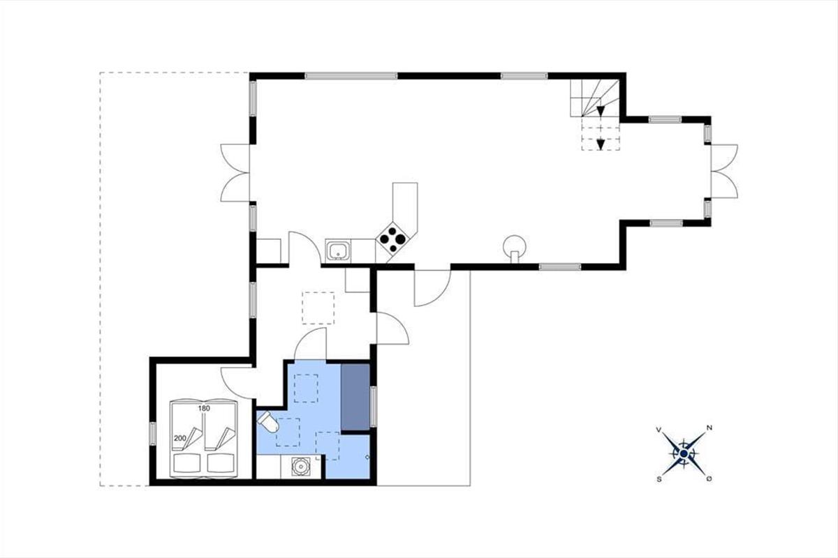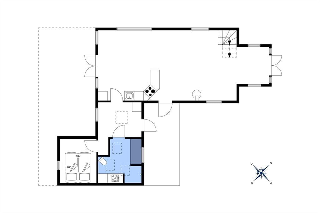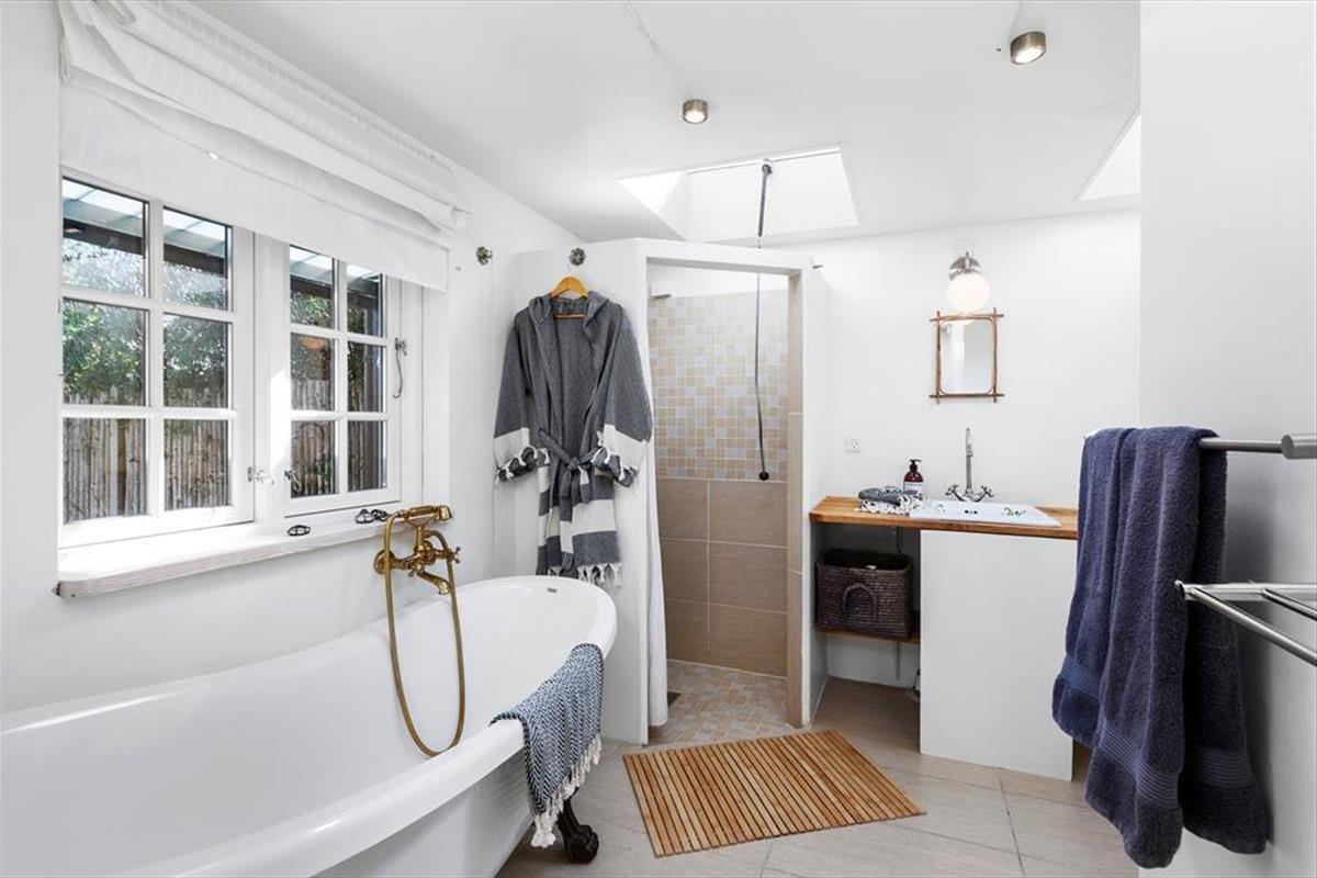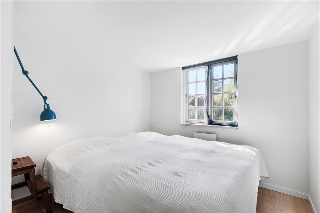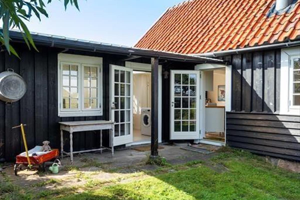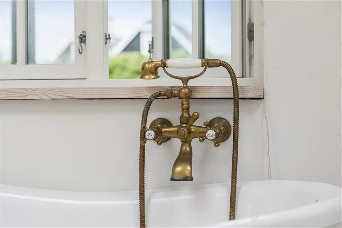 Ved siden af køkkenet finder man en praktisk indgang til bryggerset, hvor der også er adgang til badeværelset og et soveværelse med to enkeltsenge. Badeværelset er rummeligt og har et dejligt badekar.