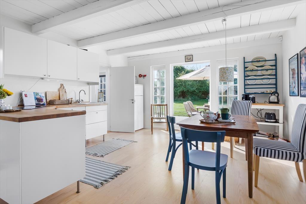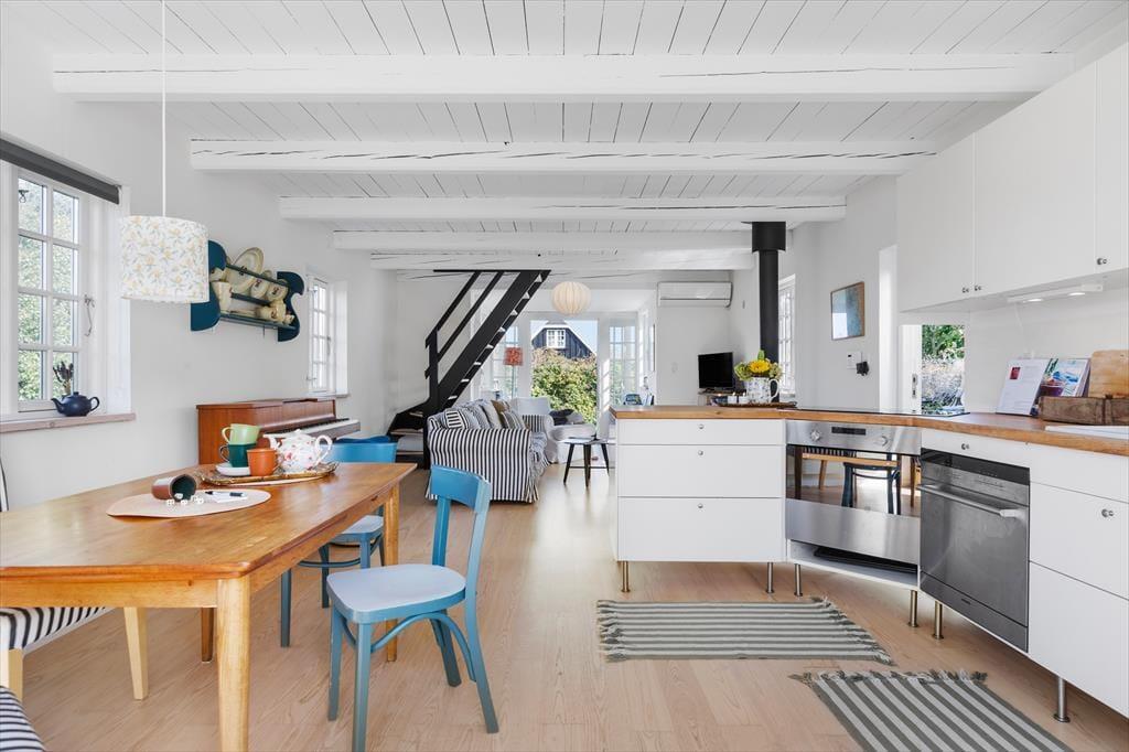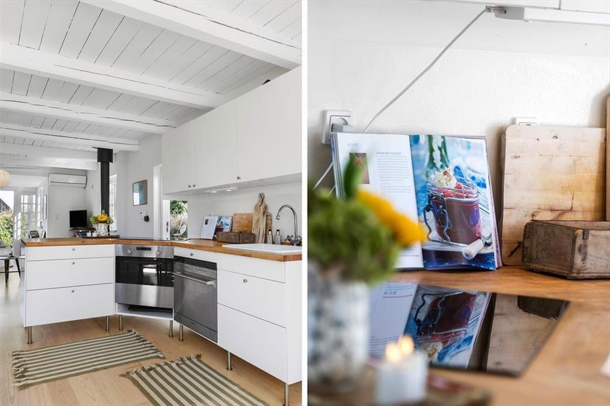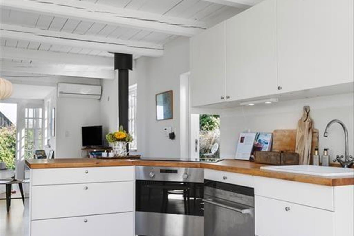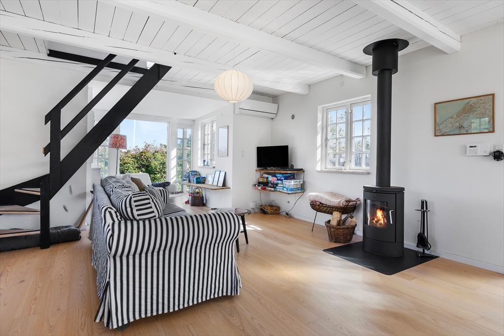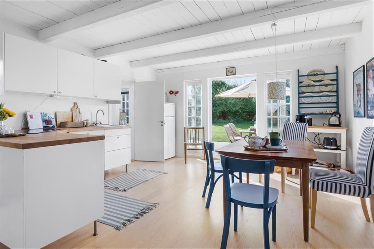 Sommerhuset byder på en indbydende og charmerende indretning, hvor køkkenalrummet med spiseplads åbner op til en hyggelig stue med brændeovn, der skaber en varm atmosfære.