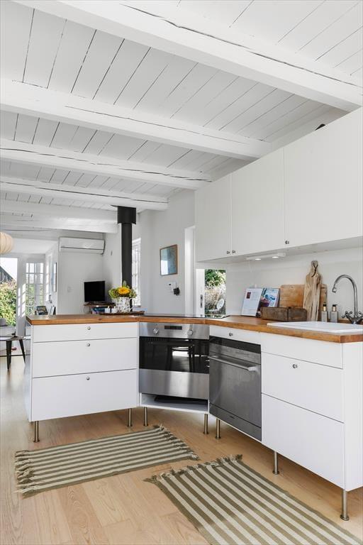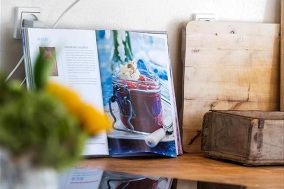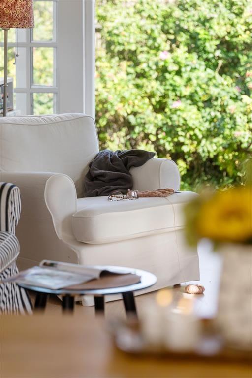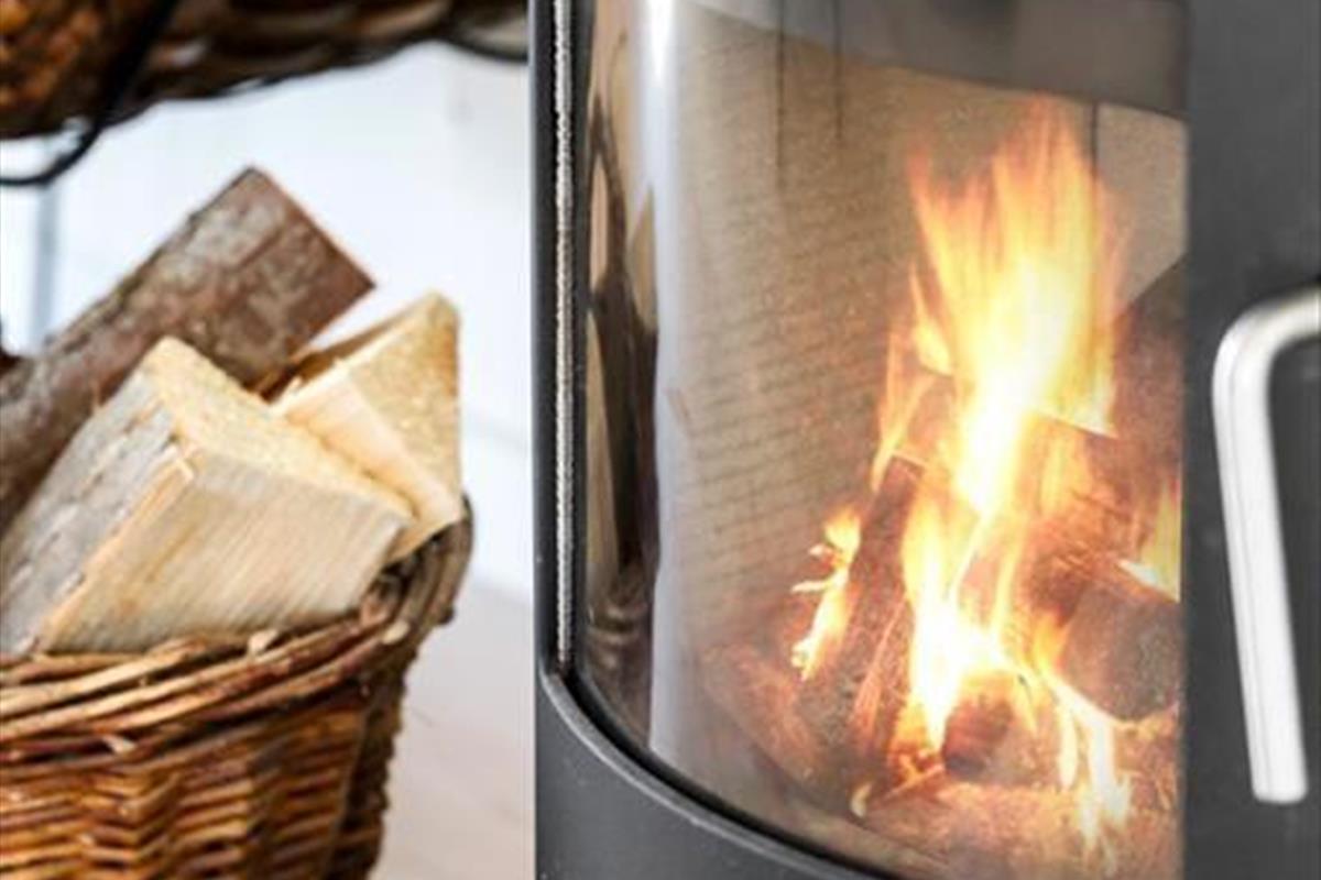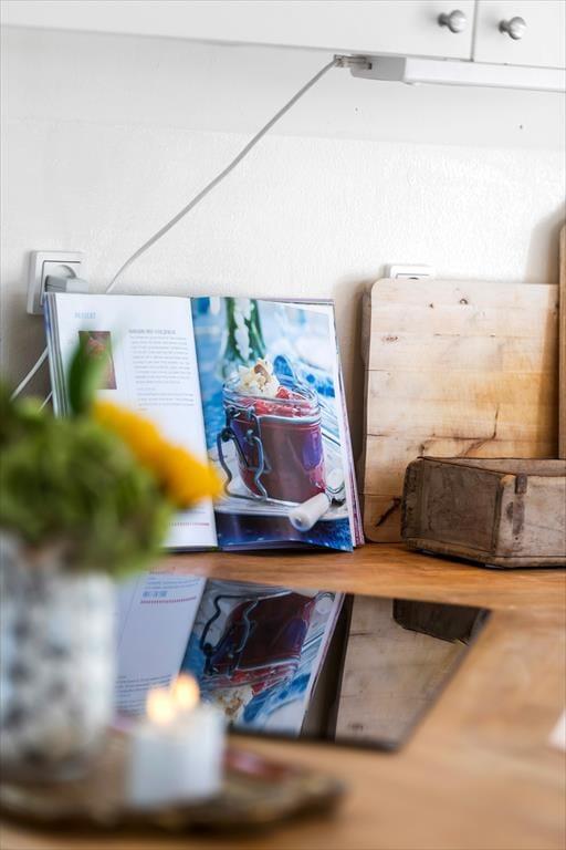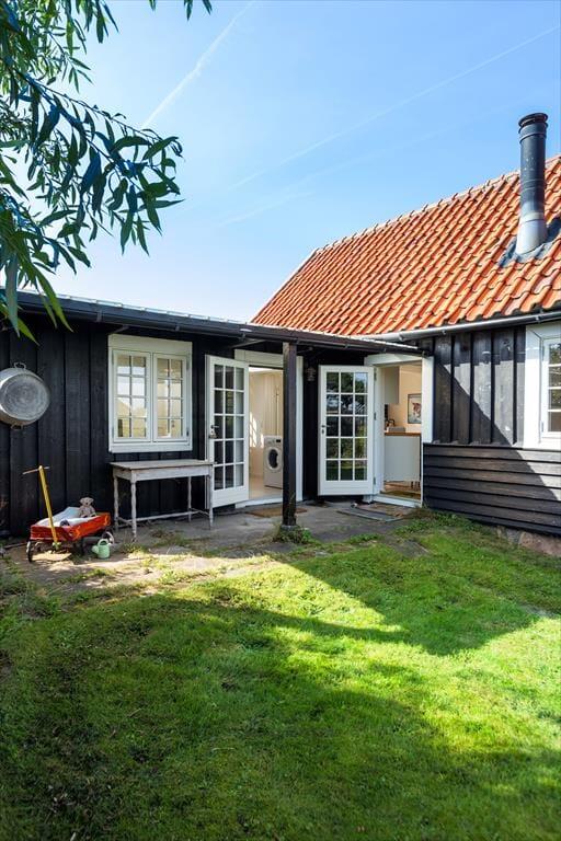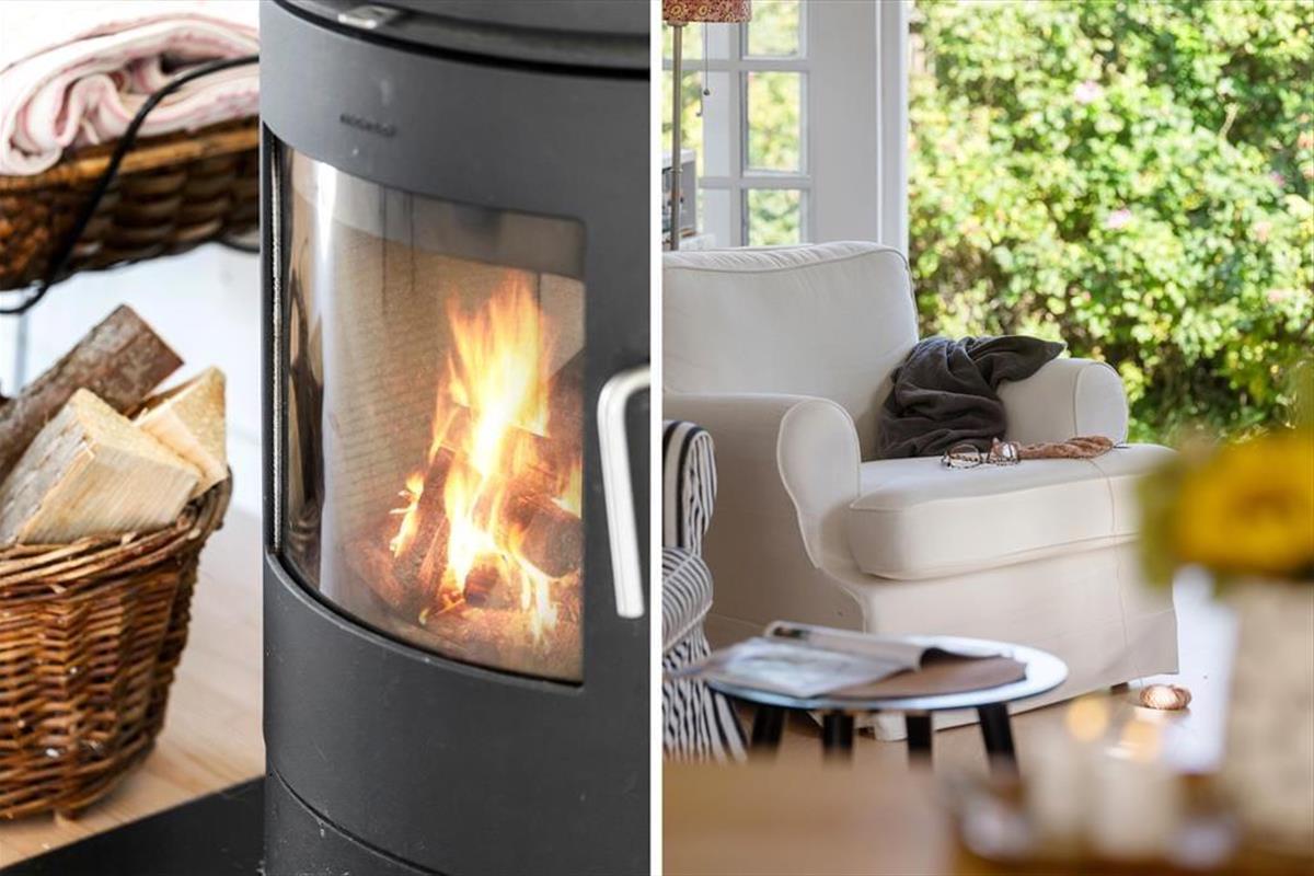 Sommerhuset byder på en indbydende og charmerende indretning, hvor køkkenalrummet med spiseplads åbner op til en hyggelig stue med brændeovn, der skaber en varm atmosfære.