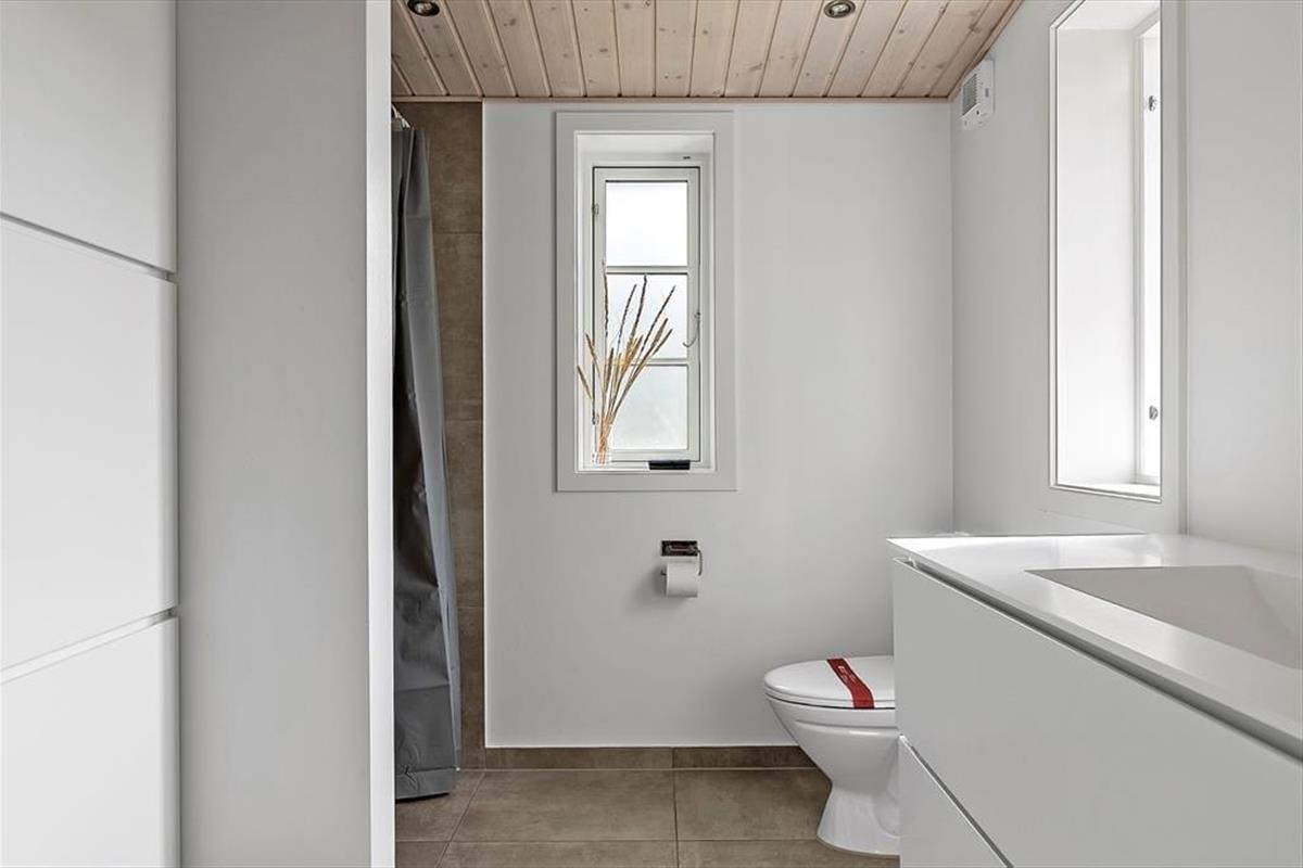 Der neuere Teil des Hauses öffnet sich hell und freundlich – mit einem modernen Wohnraum, in dem das Doppelbett im natürlichen Tageslicht steht, und einem stilvollen Badezimmer. Die schlichte, luftige Gestaltung bildet einen ruhigen Kontrast zum traditionellen Bereich, und gemeinsam verleihen die beiden Stile dem Haus eine besondere, fast filmreife Atmosphäre – wie eine dänische Version von „High Chaparral“.