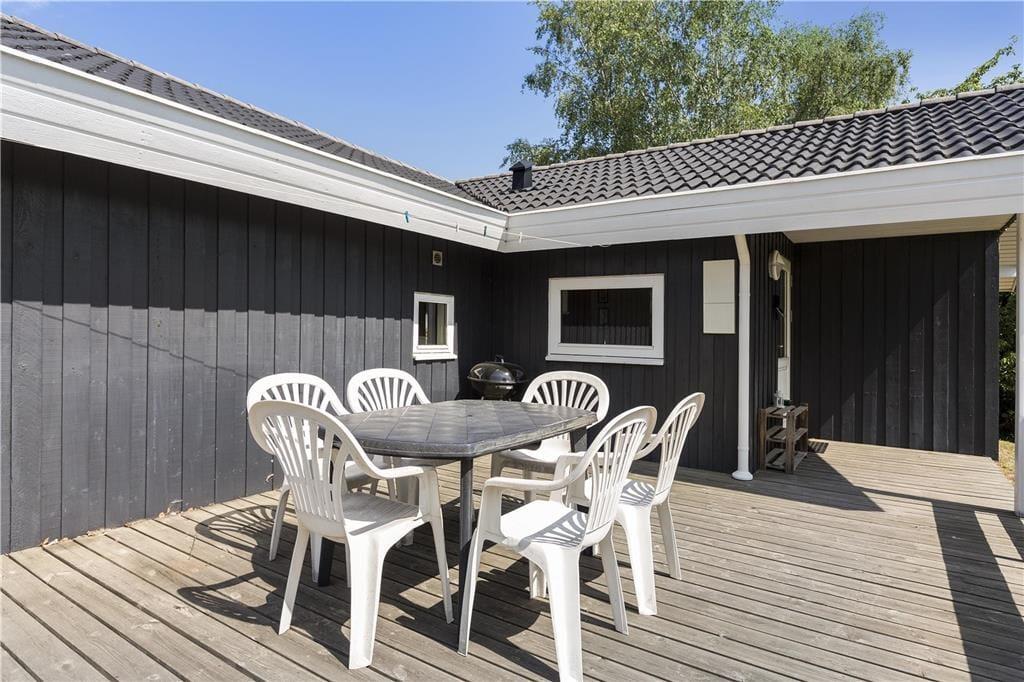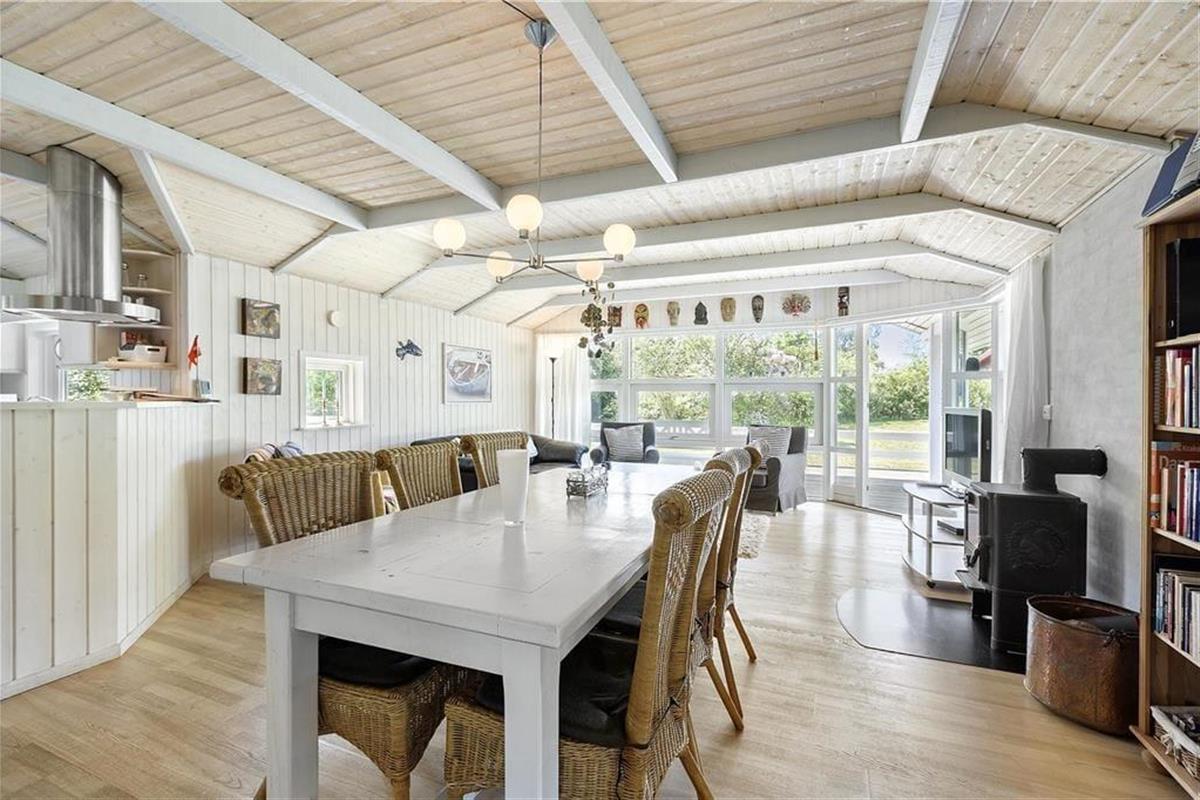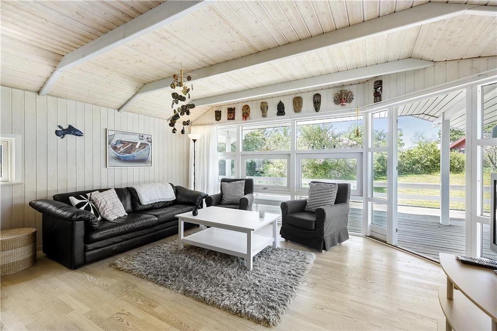 In diesem Ferienhaus ist Platz für gemütliche Stunden mit der Familie. Die offene Küche ist direkt mit dem Wohnzimmer verbunden, wo es sowohl einen Essbereich für gemeinsame Mahlzeiten oder Brettspiele als auch eine gemütliche Sofaecke zur Entspannung und für geselliges Beisammensein vor dem Fernseher oder mit einem guten Buch gibt. Vom Wohnzimmer aus führt ein direkter Zugang auf eine teilweise überdachte Terrasse, auf der Sie Ihren Morgenkaffee oder die Abendsonne genießen können – bei jedem Wetter.