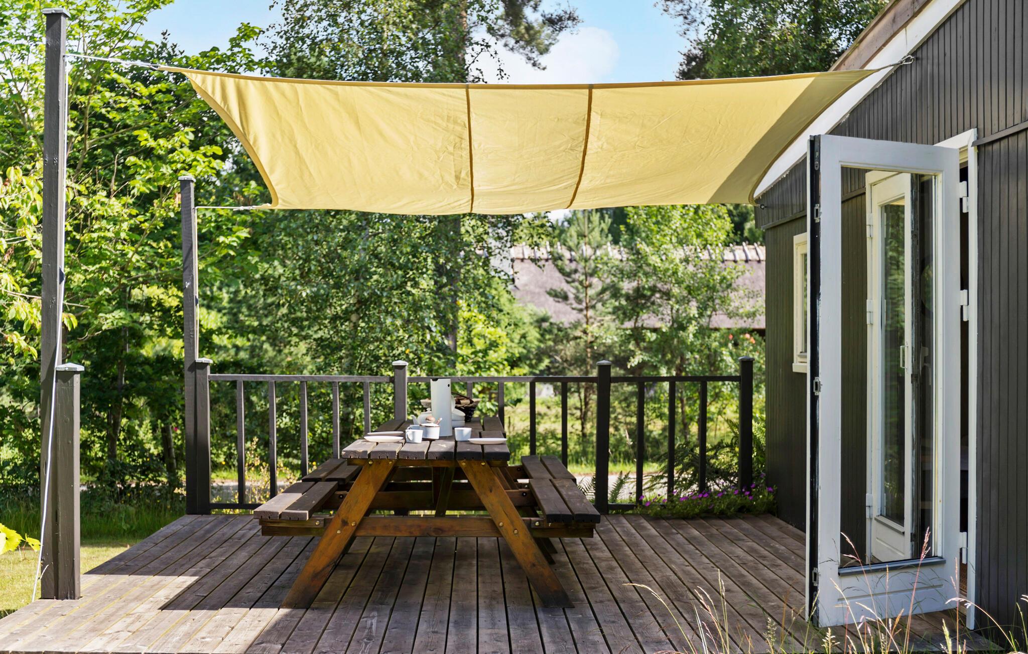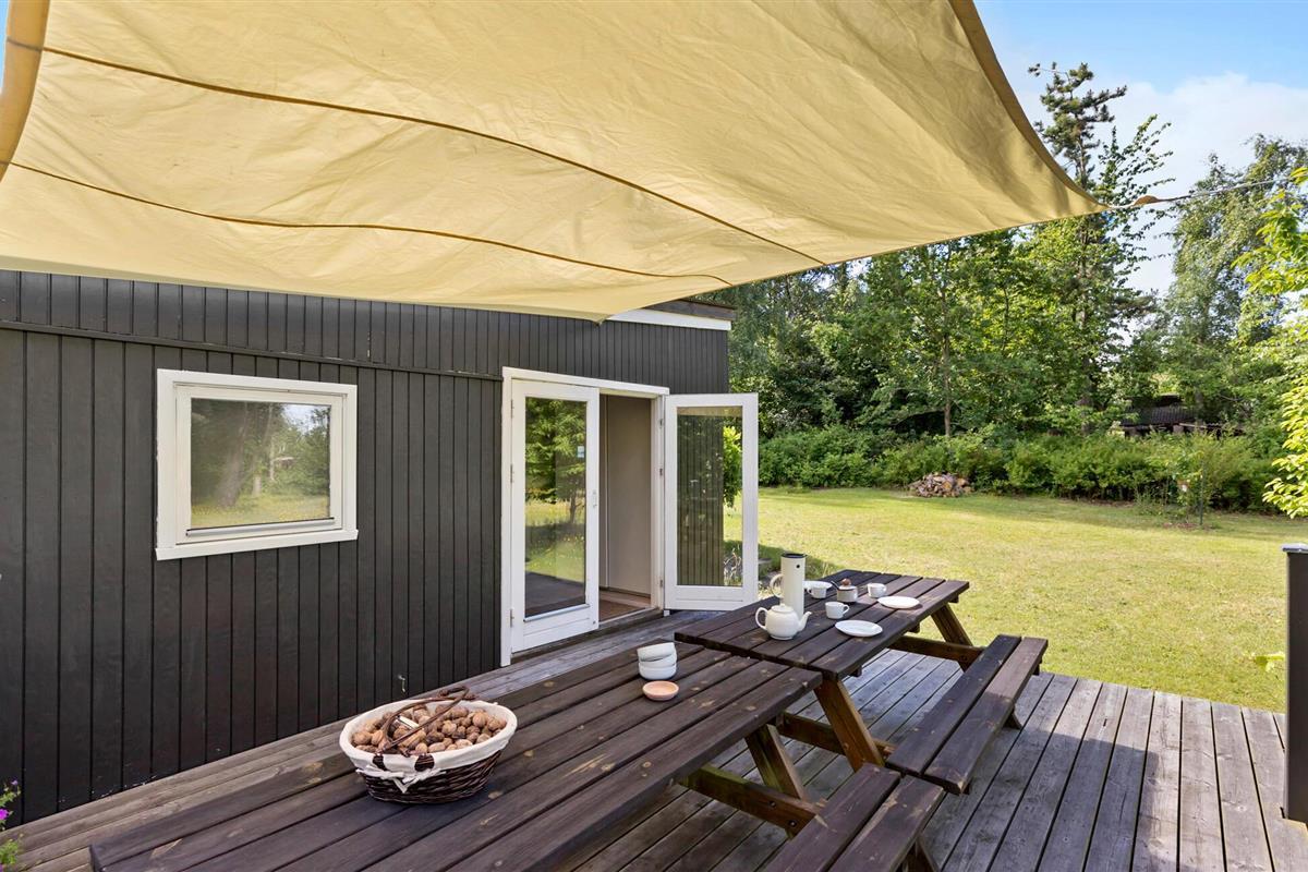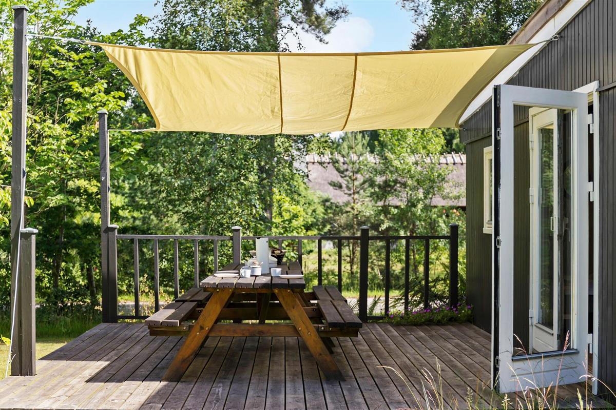 Het terras met schaduwrijke luifel is de ideale plek voor het ontbijt of een ontspannen diner in de buitenlucht. De grote tuin biedt volop ruimte voor buitenactiviteiten en je kinderen kunnen zich naar hartenlust uitleven. Kom 's avonds samen rond de gezellige vuurplaats en deel spannende verhalen rond het kampvuur.
