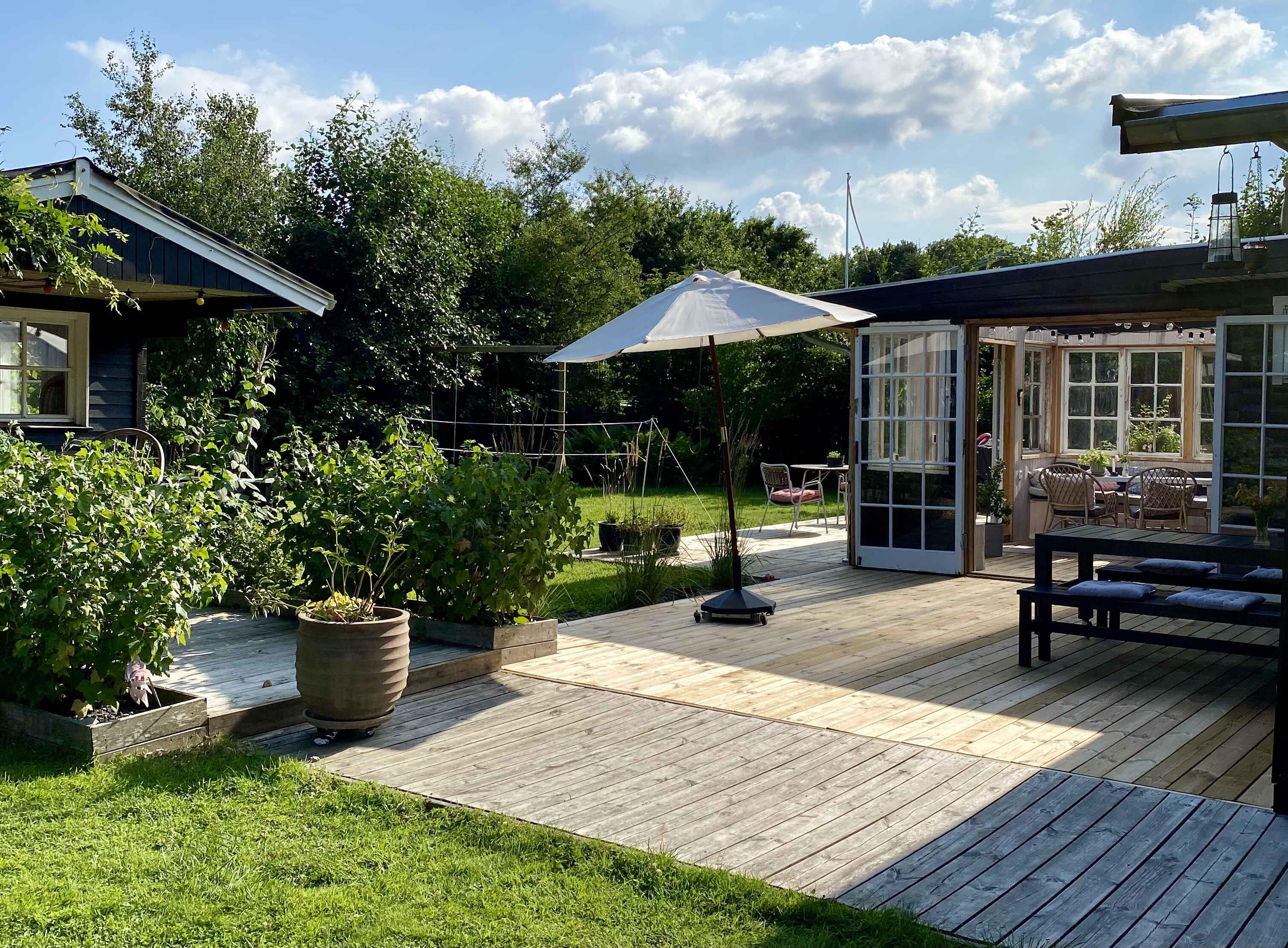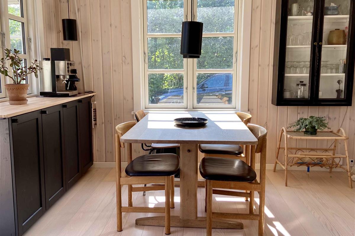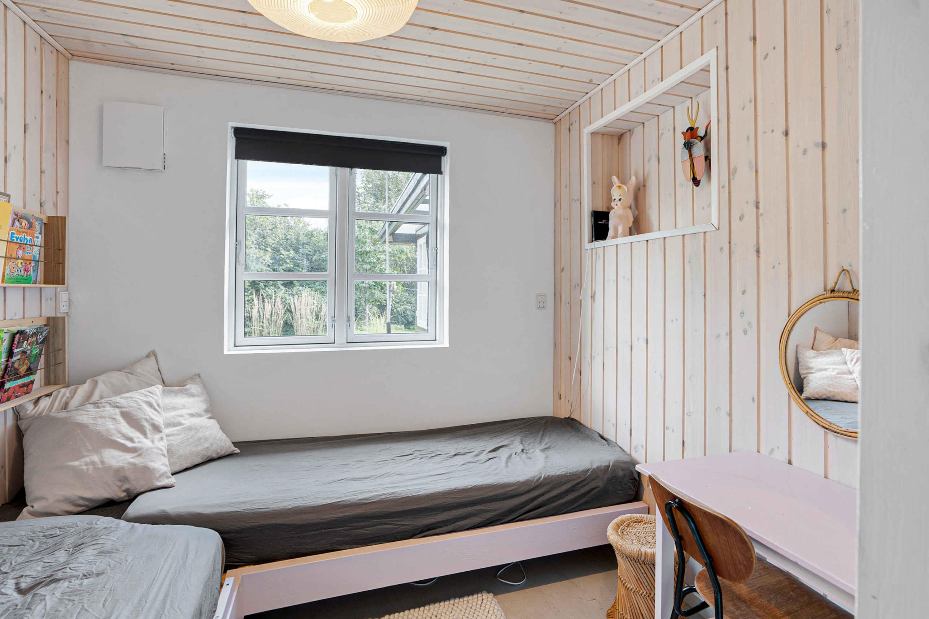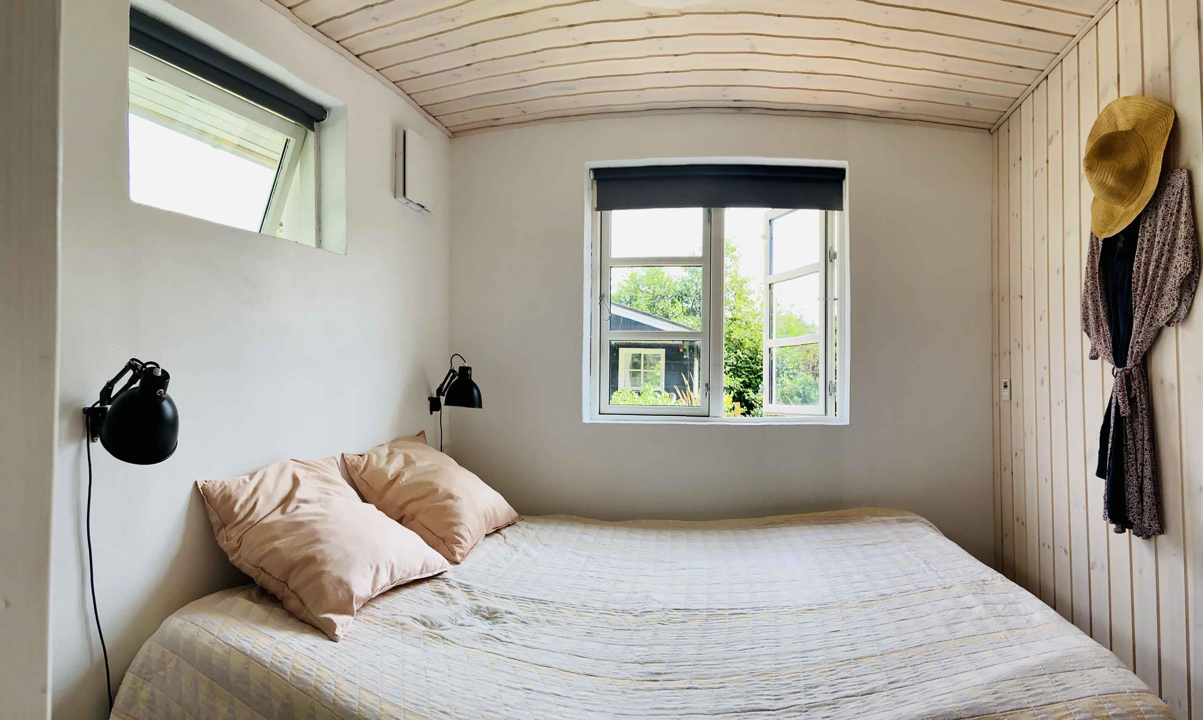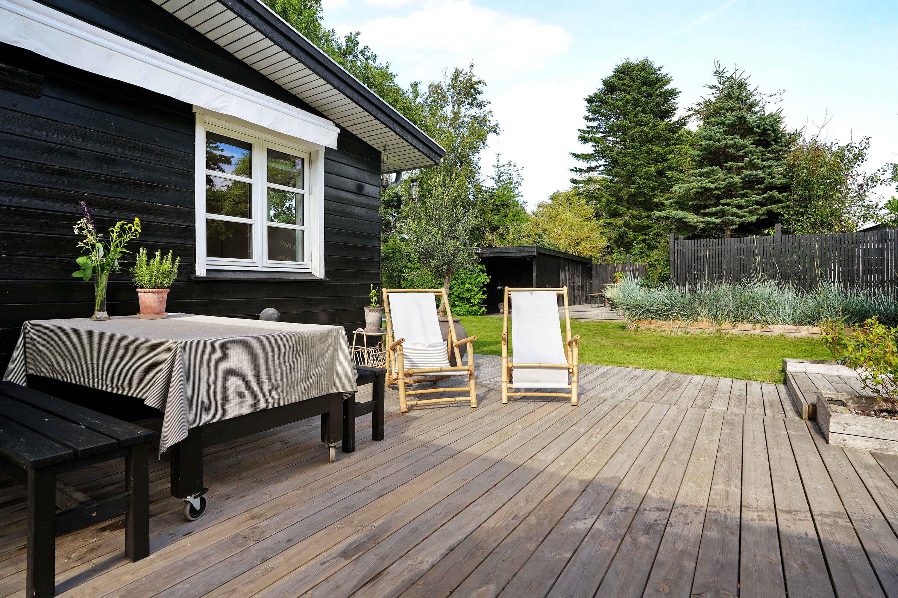 Klassiek Deens zomerhuis in zwart met wit geschilderde boerderijramen, dat de afgelopen jaren van binnen grondig is gerenoveerd met respect voor de identiteit van het huis. Het huis bevat een keuken/woonkamer en drie slaapkamers. In elk van de twee kamers zijn twee slaapplaatsen, terwijl in de derde een eenpersoonsbed staat dat over de gehele breedte van de kamer kan worden uitgetrokken tot een tweepersoonsbed. Het huis is gelegen in het oude Liseleje, waar alleen onverharde wegen en kleine paadjes zijn omringd door oude bomen. Het is slechts 250 meter naar een van de beste stranden van Denemarken en 7 minuten lopen naar het centrum van Liseleje. De tuin biedt veel privacy en er is geen autolawaai. U kunt vrij en ongestoord een warme douche nemen onder de buitendouche. Het zomerhuisleven is ook het terrasleven. Dat heb je hier in overvloed met een houten terras rondom het hele huis, zodat er altijd wel een plekje zon is, en als de zon te sterk is kan de luifel uitgerold worden. Daarnaast is er een mooie en rustieke oranjerie op het zuiden, waar 's avonds en koele dagen kunnen worden genoten met uitzicht op de natuur. De avondmaaltijd kan eventueel bereid worden in de buitenkeuken van het huis, waar een grote gasbarbecue aanwezig is en stromend koud/warm water bij de gootsteen. Voor de kinderen is er een schommel, speelhuisje en een ingegraven trampoline. Het gezellige centrum van Liseleje ligt op slechts 700 meter afstand, dus voor een wafelijsje van een van de vele ijssalons, shoppen, versgebakken brood of een kop koffie in een van de stadscafés is het niet ver. Let op: Niet te huur voor commercieel gebruik.