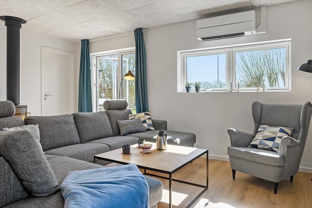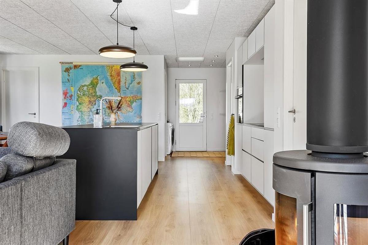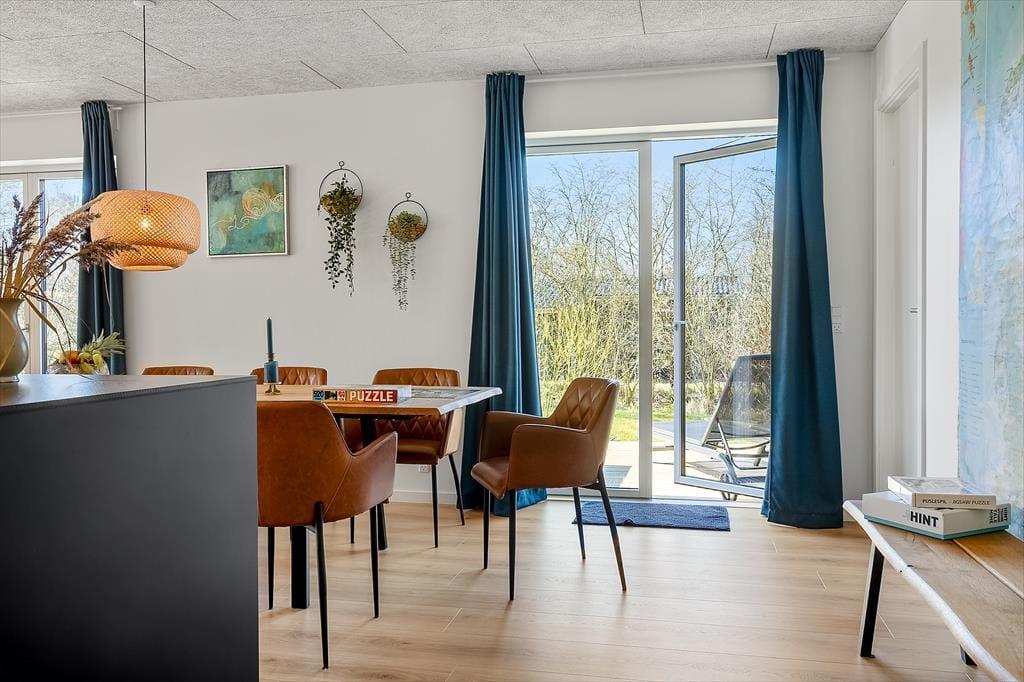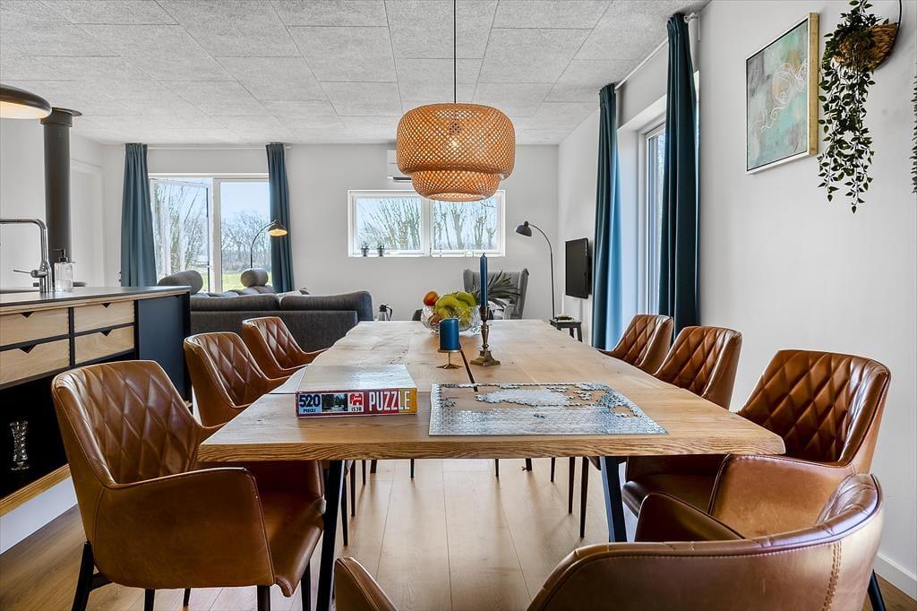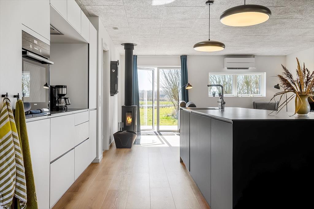 Innen erwartet dich eine helle und einladende Atmosphäre mit viel Platz für gemeinsame Zeit und Erholung. Die offene, moderne Küche ist mit dem Wohnbereich verbunden, sodass du beim Kochen ganz einfach Teil der Feriengemeinschaft bleibst. Vielleicht rührst du gerade im Topf, während die Kinder den Tisch decken oder sich mit einem Spiel auf dem Sofa entspannen? Der Holzofen wird an kühleren Tagen schnell zum Mittelpunkt für die ganze Familie – hier könnt ihr die Ruhe bei Decken und heißem Kakao genießen, während die Flammen knistern und der Regen gegen die Scheiben trommelt. Das Haus bietet insgesamt Platz für acht Erwachsene und zwei Kinder, und dank mehrerer Schlafzimmer ist es ideal für Familien oder Freundesgruppen, die gemeinsam Urlaub machen möchten. Alle Räume sind schlicht und gemütlich eingerichtet, sodass du dich vom ersten Moment an wie zu Hause fühlst.