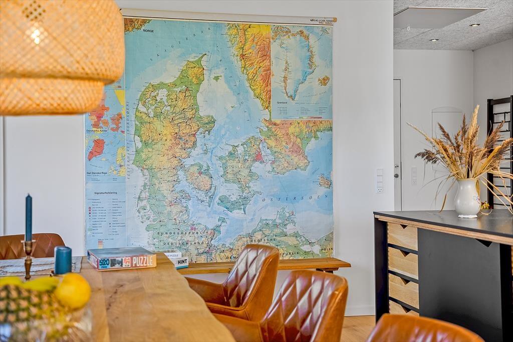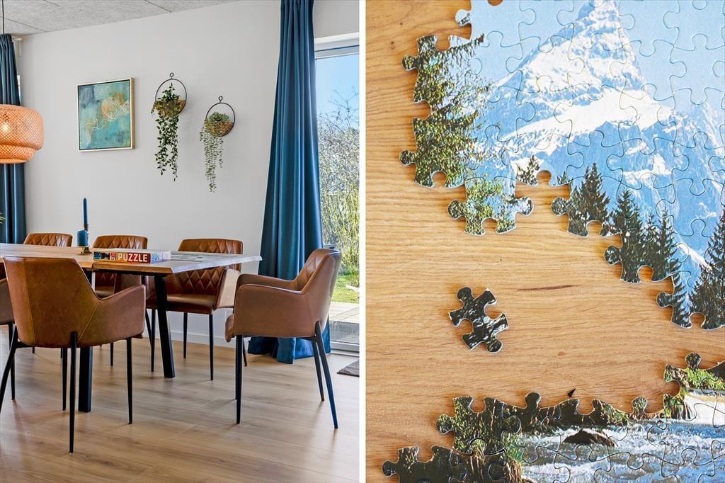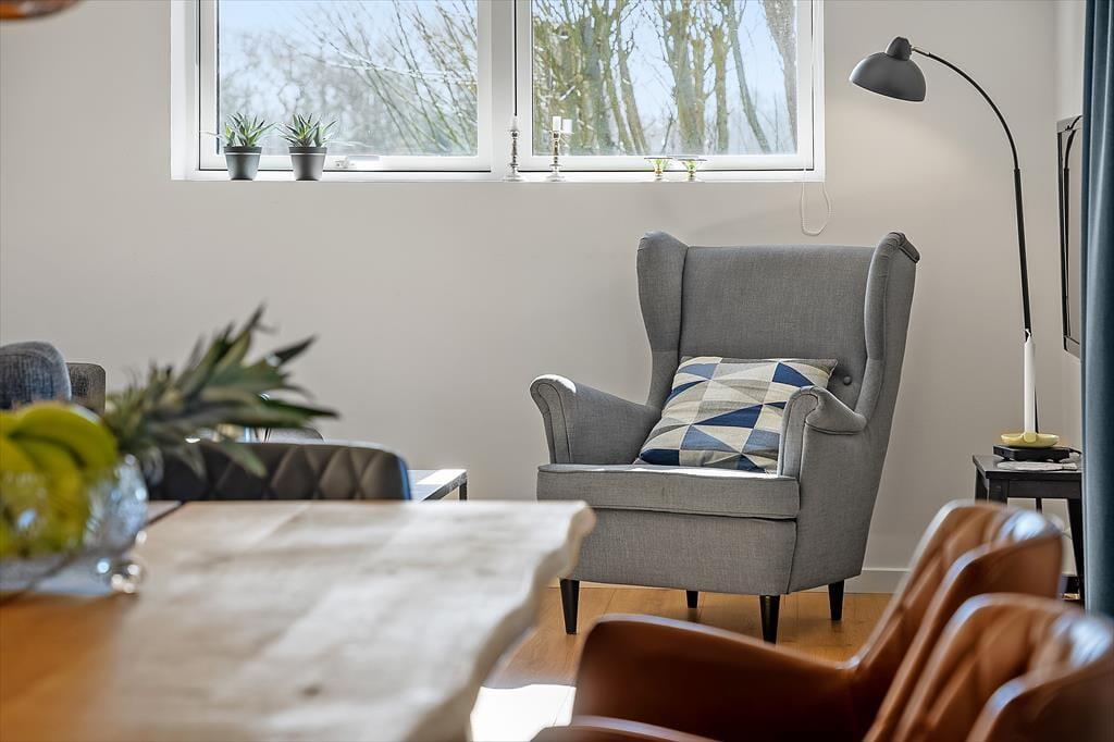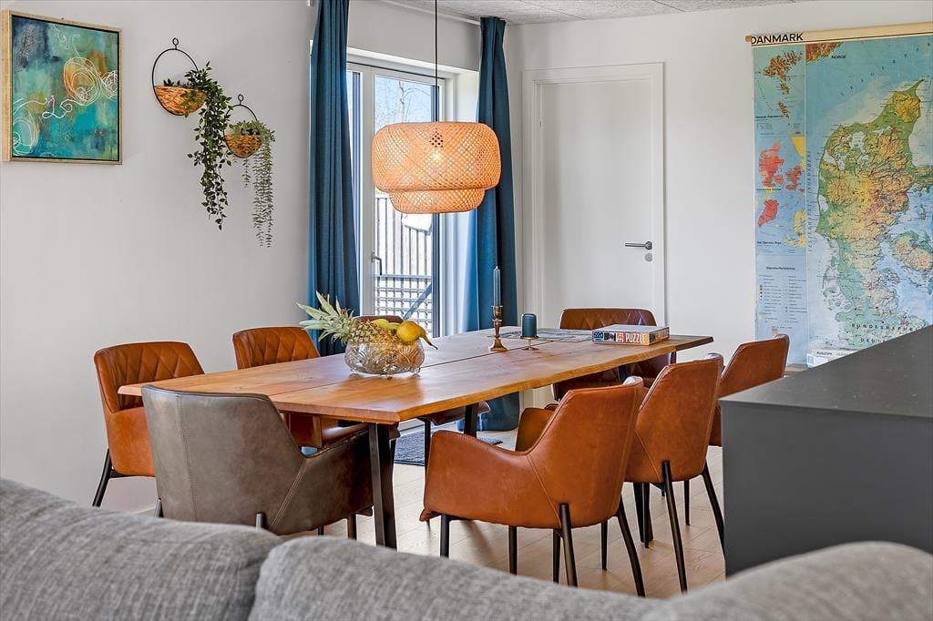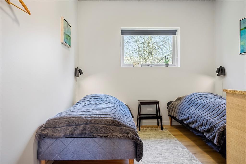 Innen erwartet dich eine helle und einladende Atmosphäre mit viel Platz für gemeinsame Zeit und Erholung. Die offene, moderne Küche ist mit dem Wohnbereich verbunden, sodass du beim Kochen ganz einfach Teil der Feriengemeinschaft bleibst. Vielleicht rührst du gerade im Topf, während die Kinder den Tisch decken oder sich mit einem Spiel auf dem Sofa entspannen? Der Holzofen wird an kühleren Tagen schnell zum Mittelpunkt für die ganze Familie – hier könnt ihr die Ruhe bei Decken und heißem Kakao genießen, während die Flammen knistern und der Regen gegen die Scheiben trommelt. Das Haus bietet insgesamt Platz für acht Erwachsene und zwei Kinder, und dank mehrerer Schlafzimmer ist es ideal für Familien oder Freundesgruppen, die gemeinsam Urlaub machen möchten. Alle Räume sind schlicht und gemütlich eingerichtet, sodass du dich vom ersten Moment an wie zu Hause fühlst.