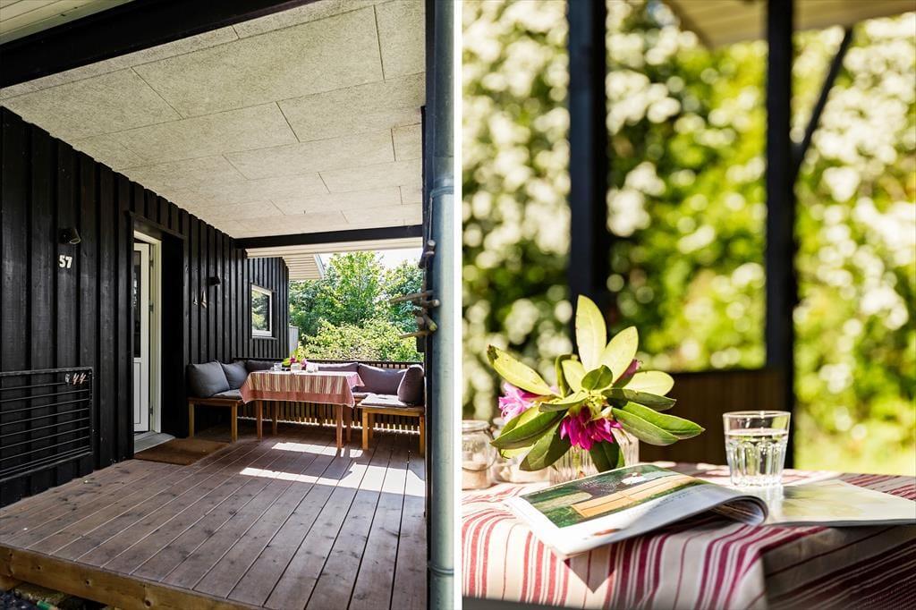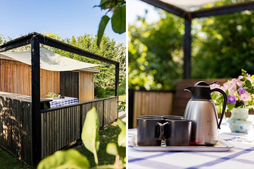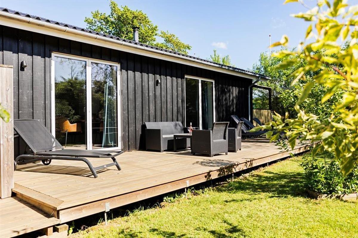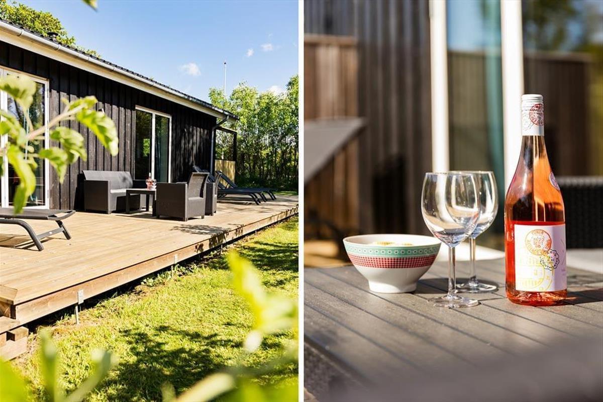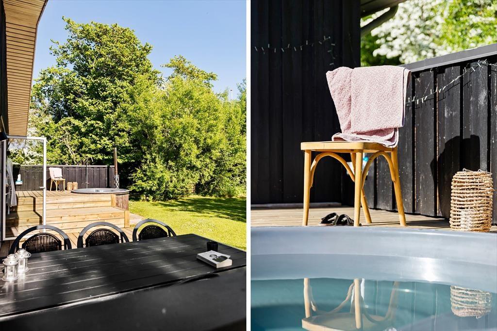 Draußen erwartet dich eine große und schöne Terrasse, auf der sich das Ferienleben so richtig entfaltet. Hier ist reichlich Platz zum Entspannen und für gemeinsame Mahlzeiten in der Sonne – vielleicht mit etwas Leckerem vom Grill und kühlen Getränken in Reichweite. Wenn der Tag zu Ende geht, kannst du im warmen Badezuber versinken und den Blick auf den Sternenhimmel und die frische Luft genießen – der perfekte Abschluss für ein Urlaubserlebnis mit einem Hauch von Luxus. Die Terrasse ist teils überdacht, teils offen, sodass du unabhängig vom Wetter immer ein schönes Plätzchen findest – ob in der Sonne oder im Schatten. Die Kinder können ungestört auf dem Rasen spielen, während die Erwachsenen in den Loungemöbeln entspannen. Und die Abende lassen sich mit Decken und guten Gesprächen genießen, lange nachdem die Sonne untergegangen ist.