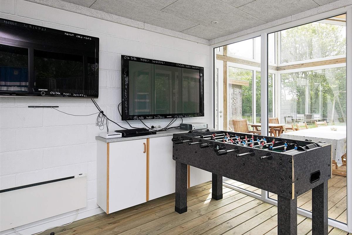 Darüber hinaus gibt es einen geräumigen Küchen-/Wohnbereich für gemeinsame Aktivitäten und mit einem Holzofen für kühlere Abende. Für den Freizeitspaß stehen eine X-Box, Nintendo Wii und einen 32 Zoll Flachbildfernseher mit einigen deutschen Sendern zur Auswahl bereit. Im Ferienhaus wurde eine energieeffiziente Genvex-Wärmepumpe zur optimalen Erwärmung installiert.