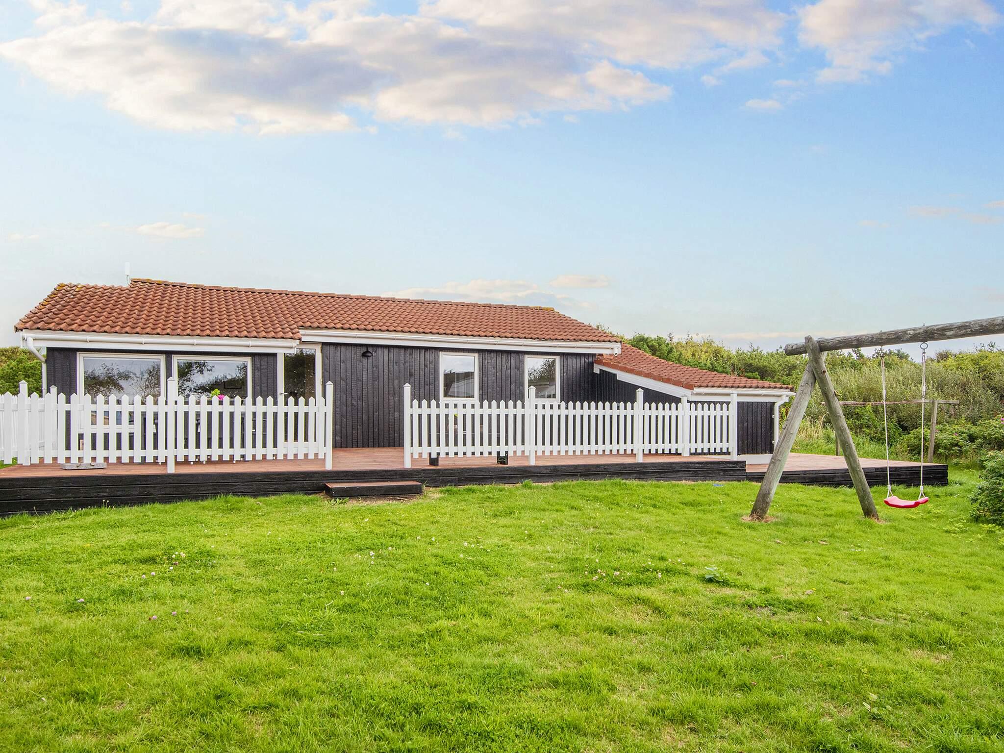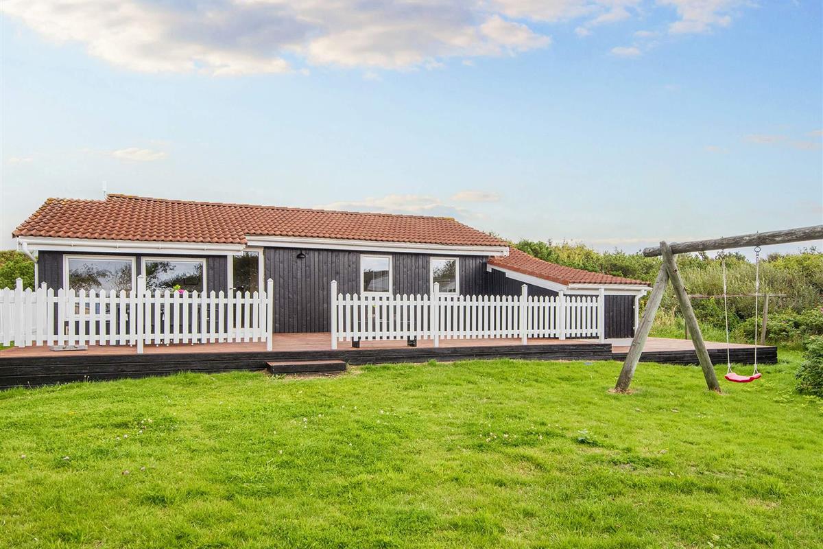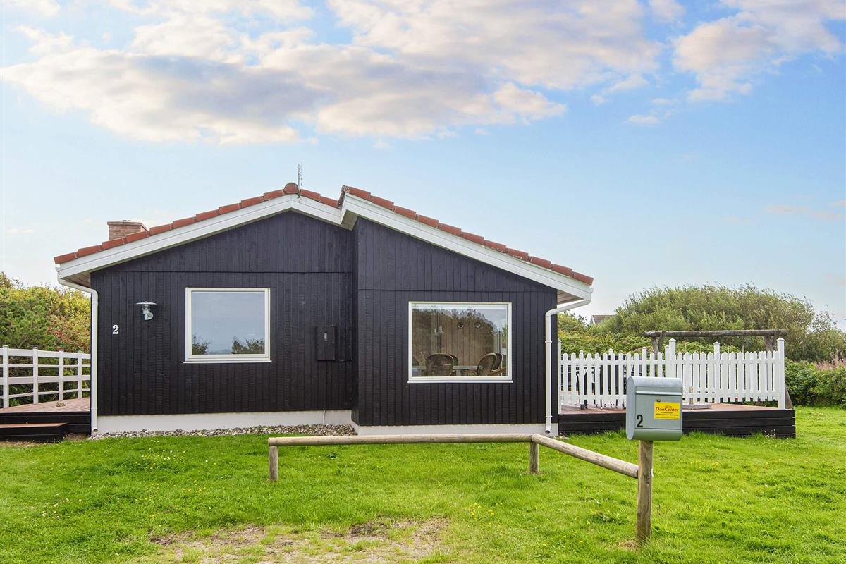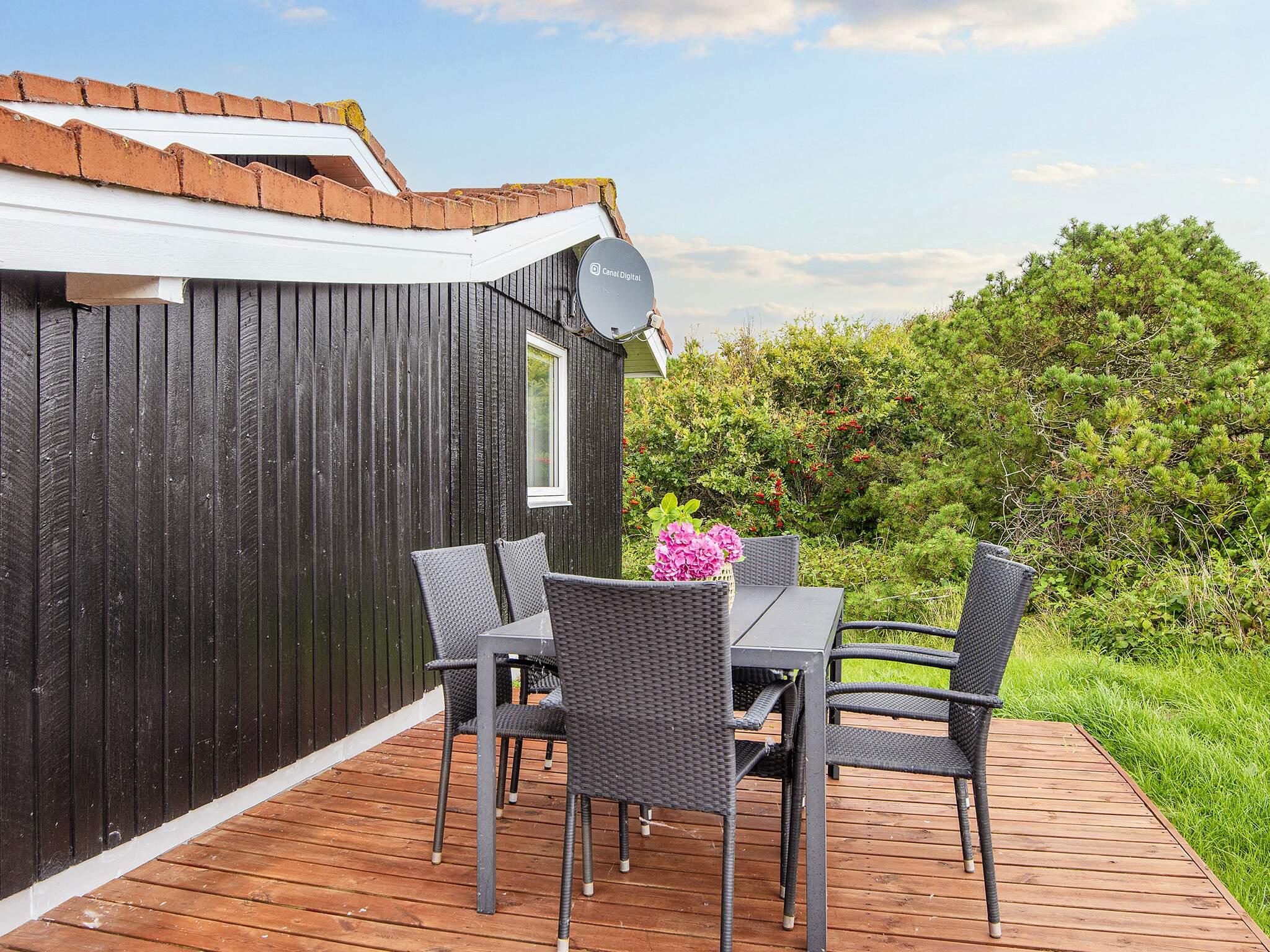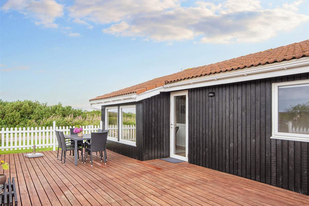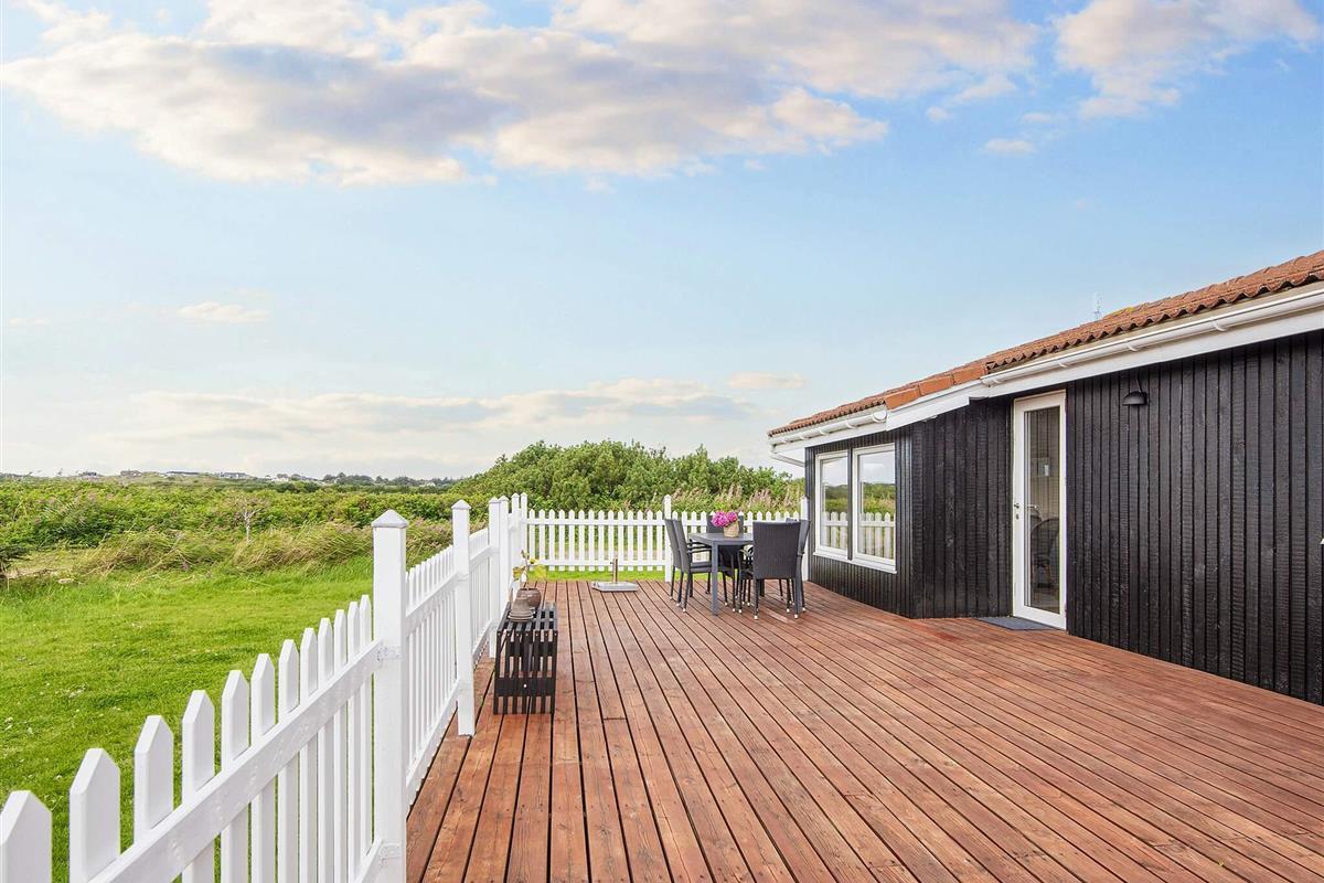 Ferienhaus in leicht erhöhter Lage und mit schönem Ausblick zur Dünenlandschaft ringsum. Liegt auf einem 2.000 m² großen Naturgrundstück in einem Ferienhausgebiet, in der Nähe vom Nordseestrand, Angelsee, Golfplatz und dem Ferienort Søndervig.