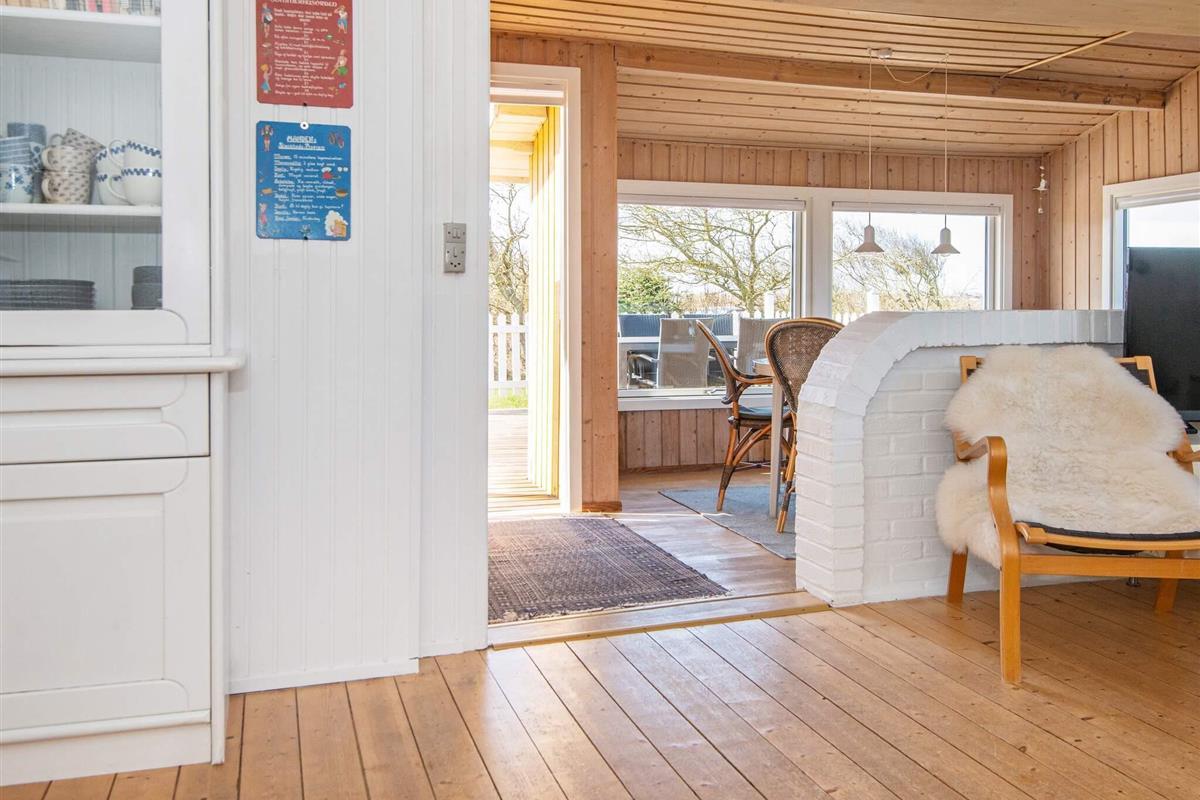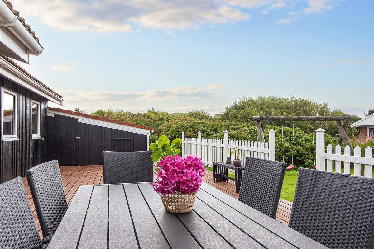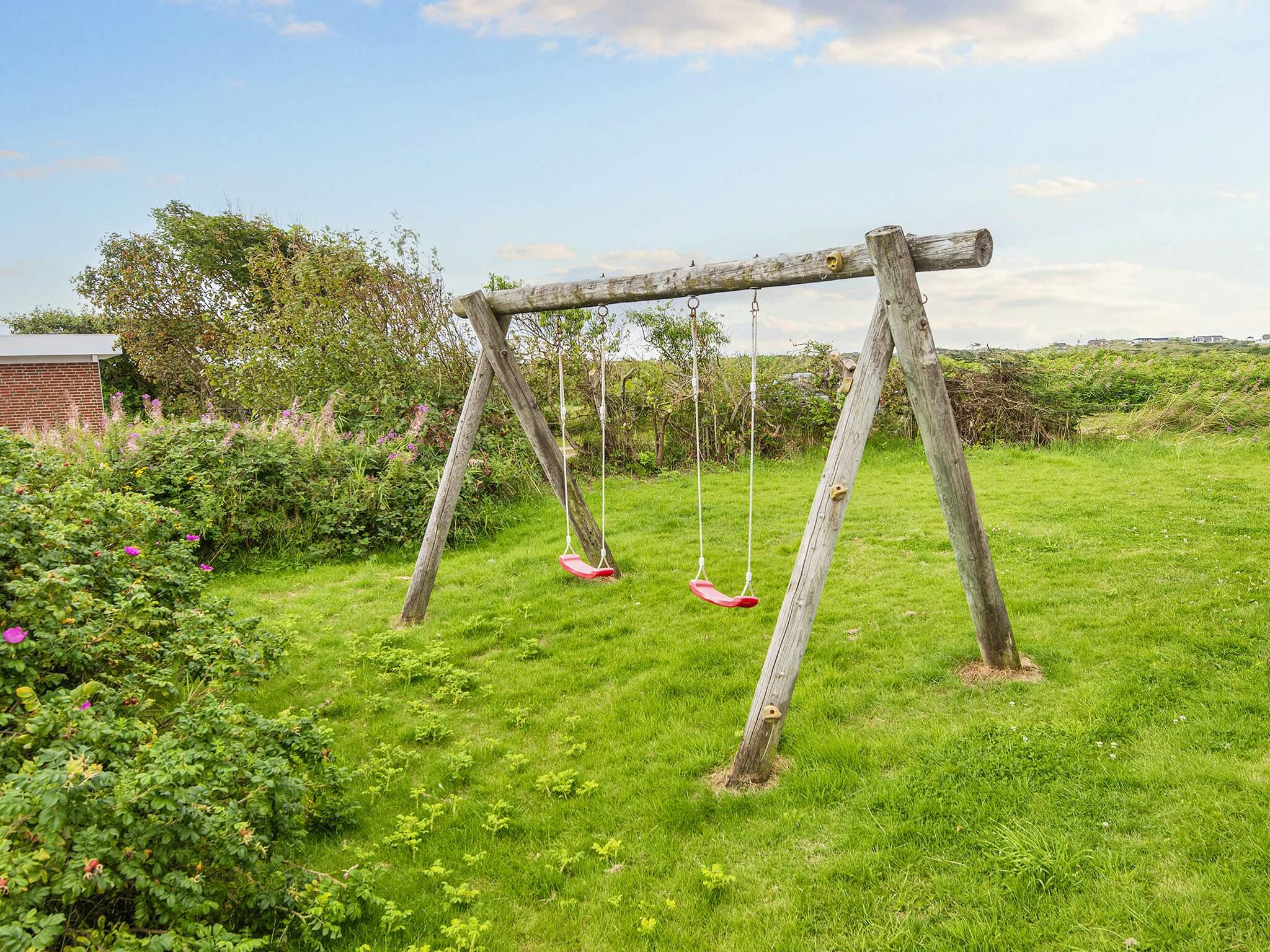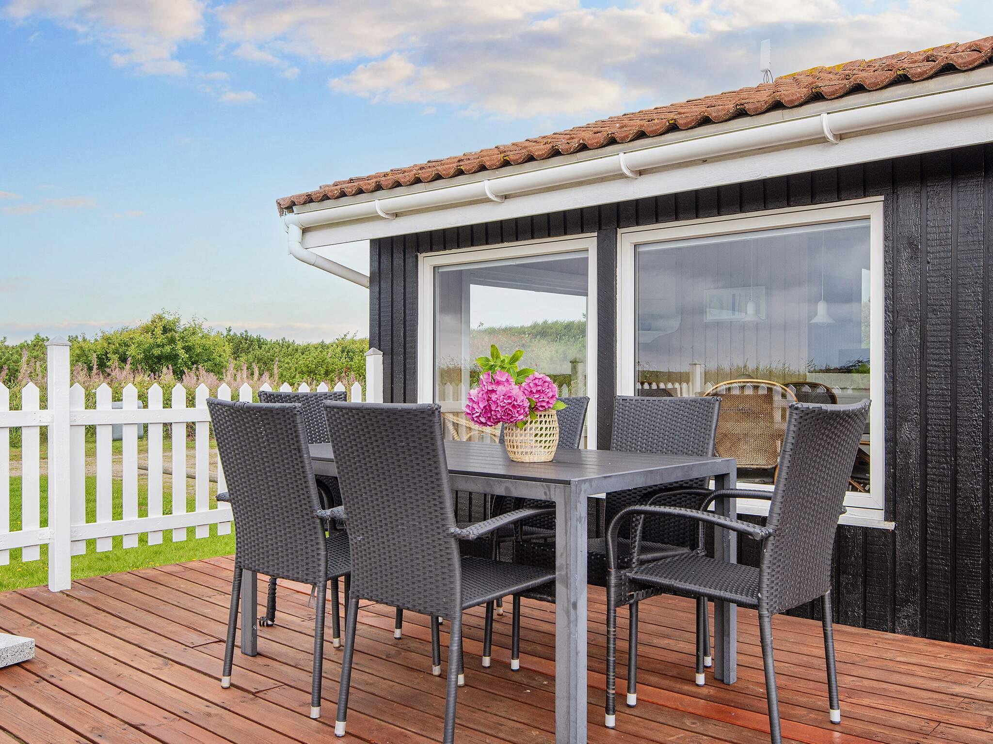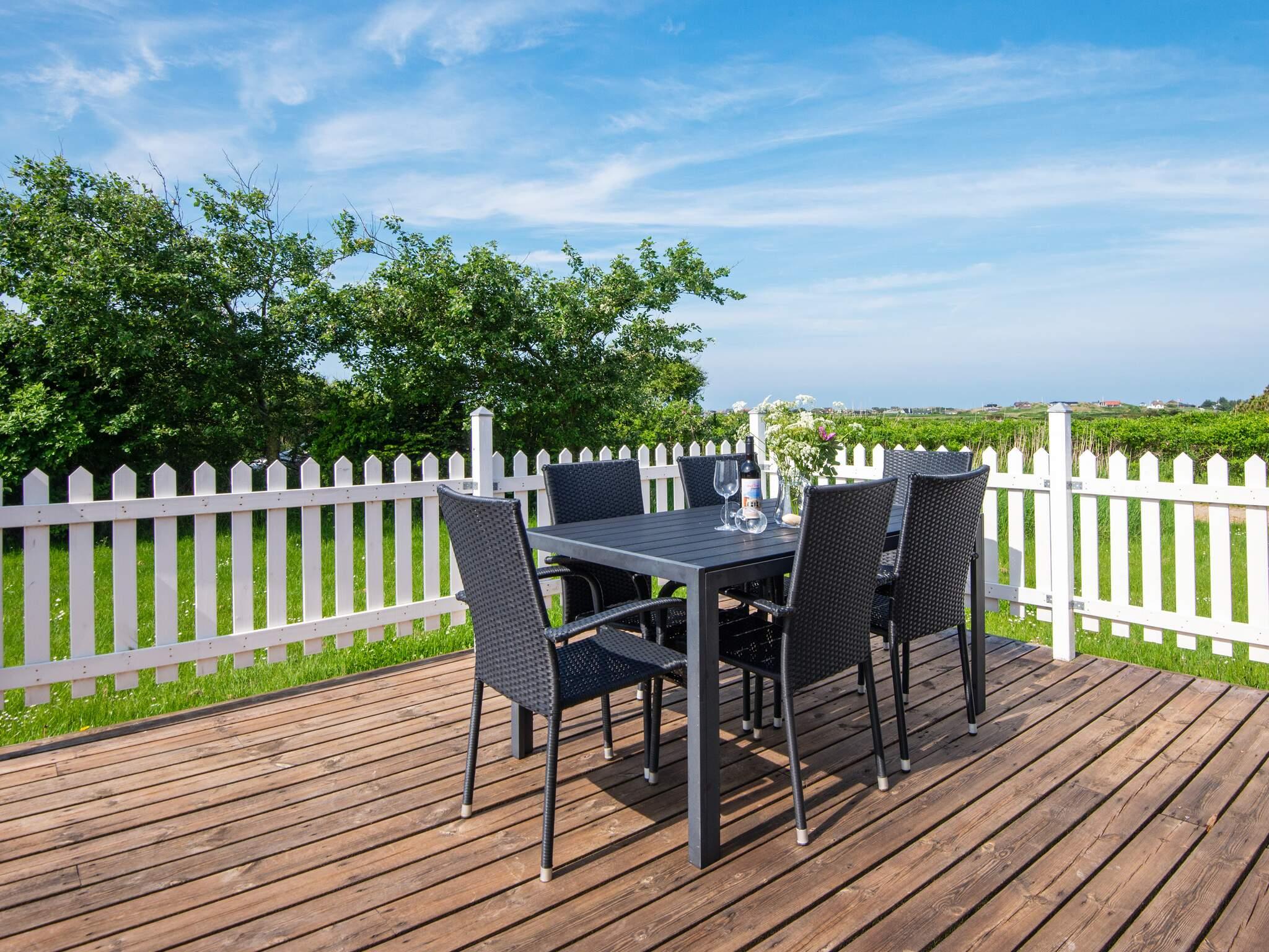 Ferienhaus in leicht erhöhter Lage und mit schönem Ausblick zur Dünenlandschaft ringsum. Liegt auf einem 2.000 m² großen Naturgrundstück in einem Ferienhausgebiet, in der Nähe vom Nordseestrand, Angelsee, Golfplatz und dem Ferienort Søndervig.
