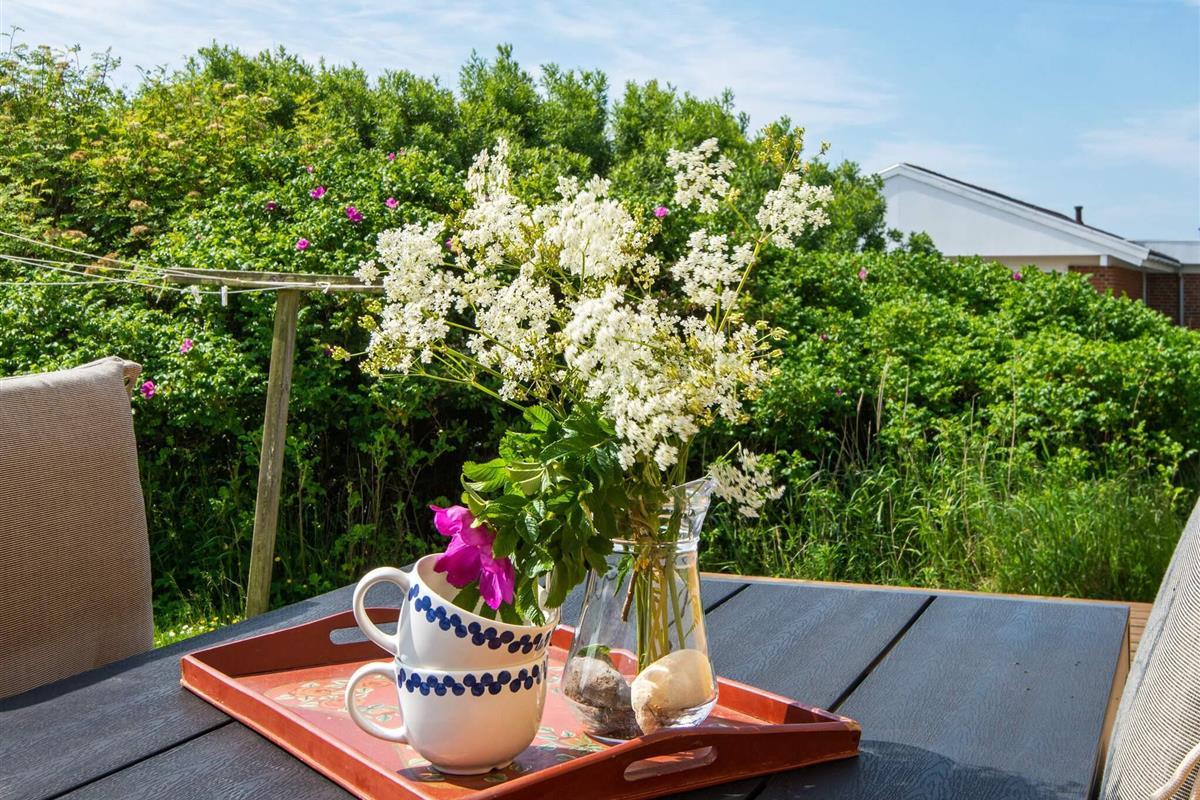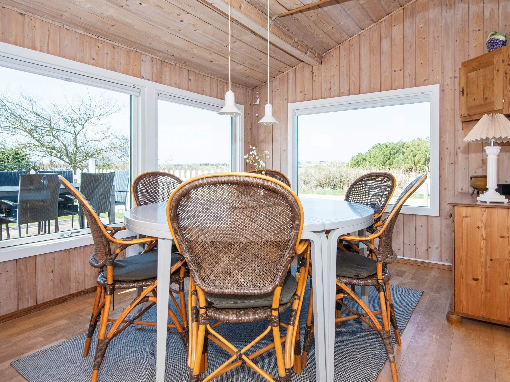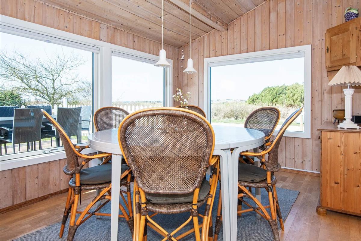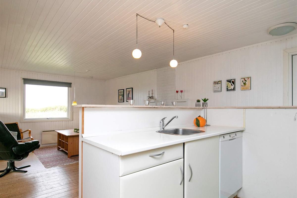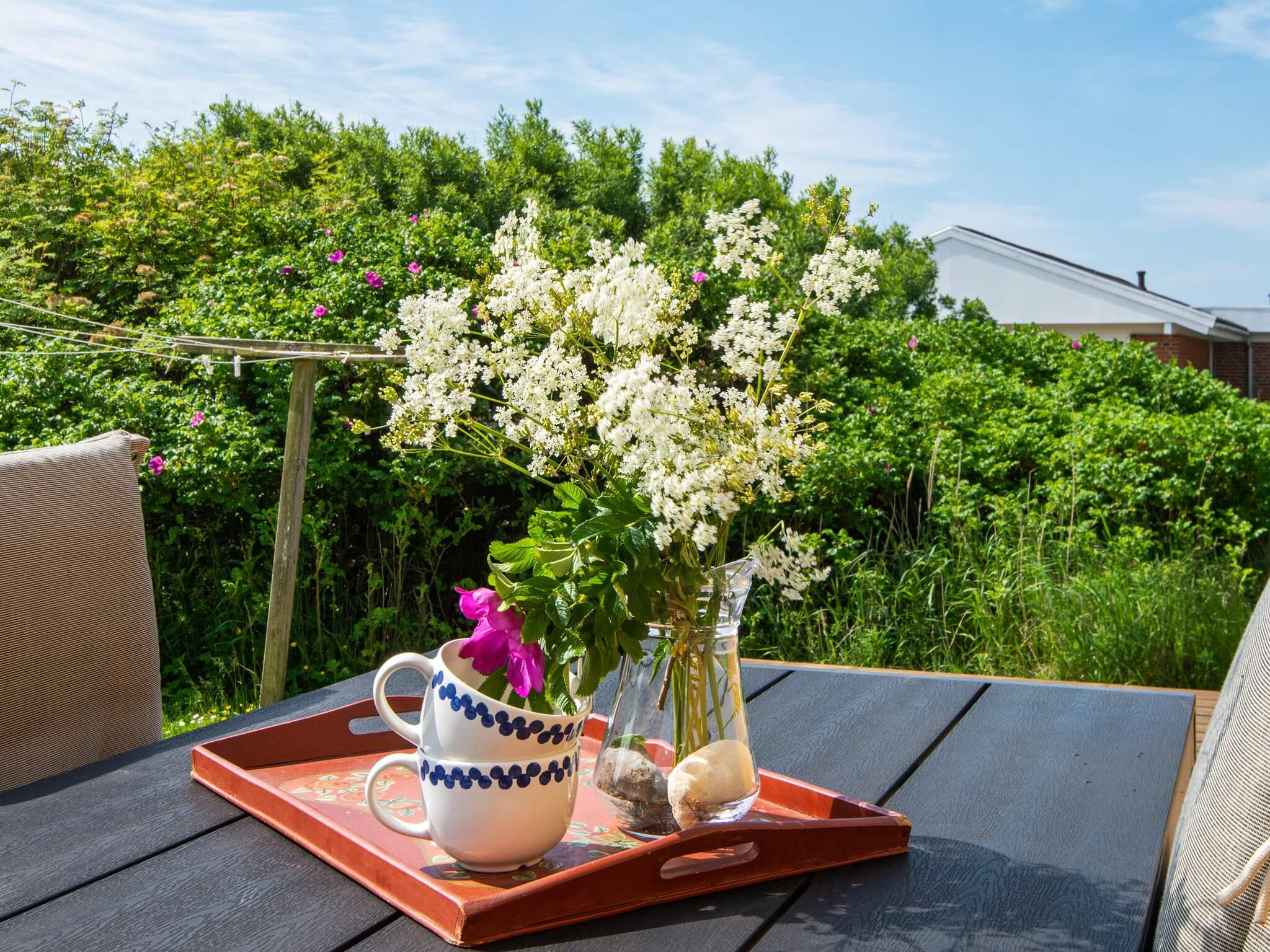 Ferienhaus in leicht erhöhter Lage und mit schönem Ausblick zur Dünenlandschaft ringsum. Liegt auf einem 2.000 m² großen Naturgrundstück in einem Ferienhausgebiet, in der Nähe vom Nordseestrand, Angelsee, Golfplatz und dem Ferienort Søndervig.