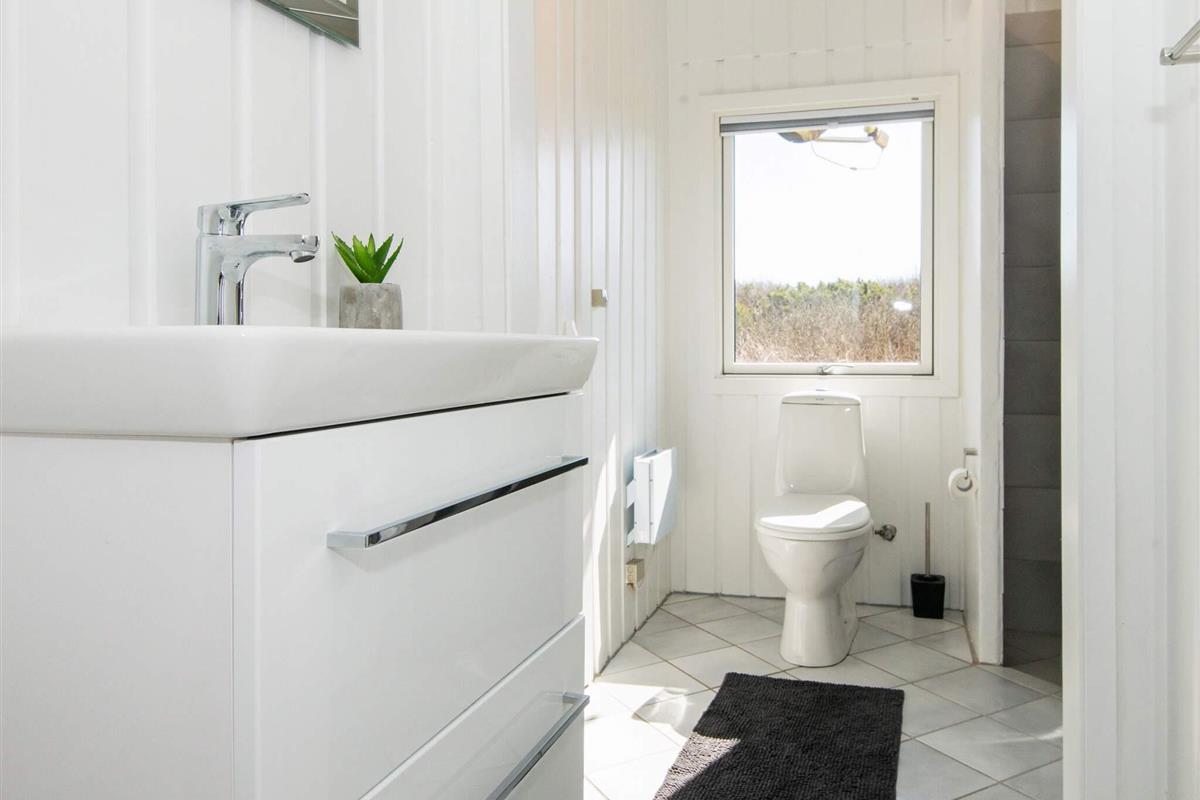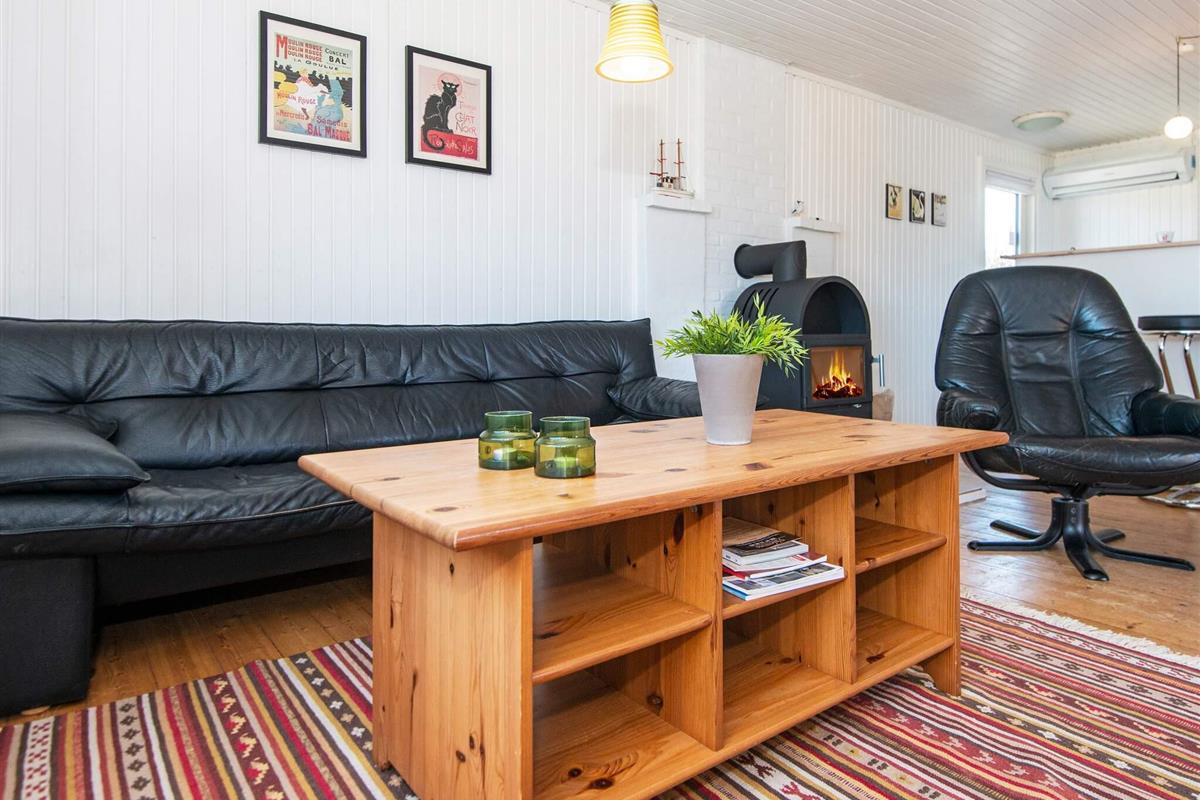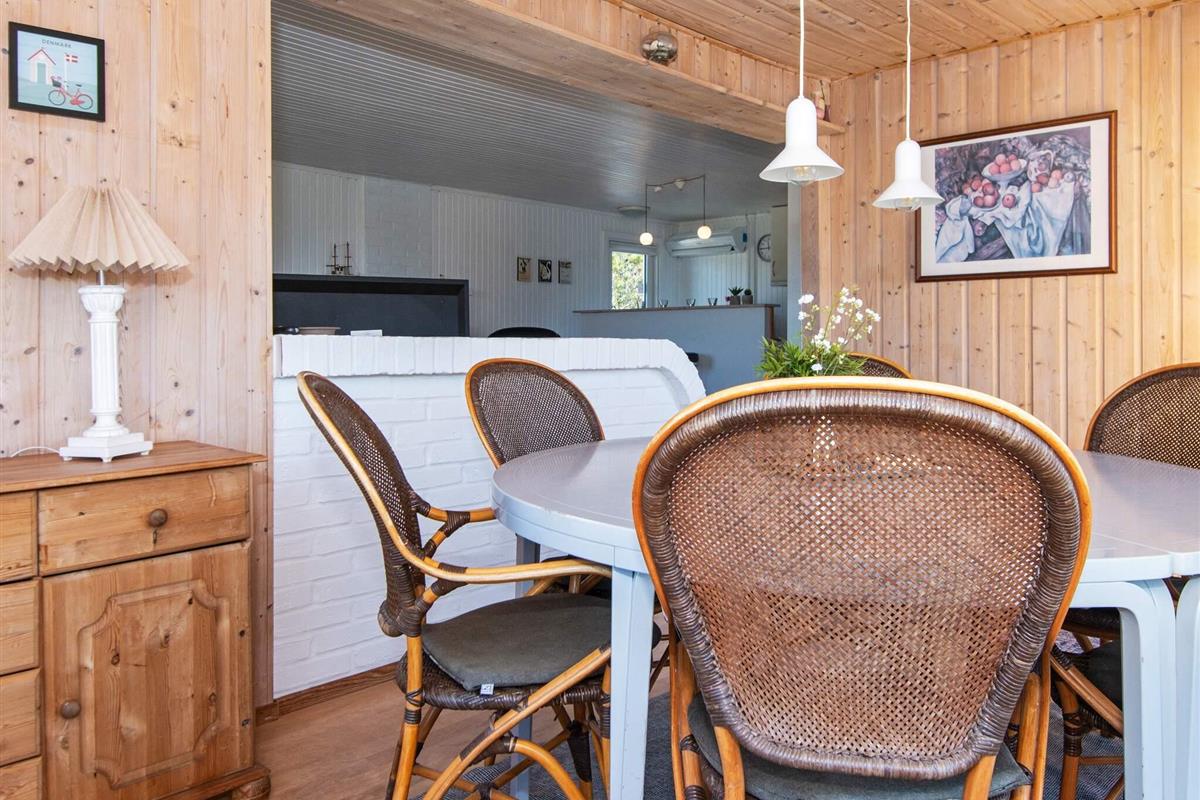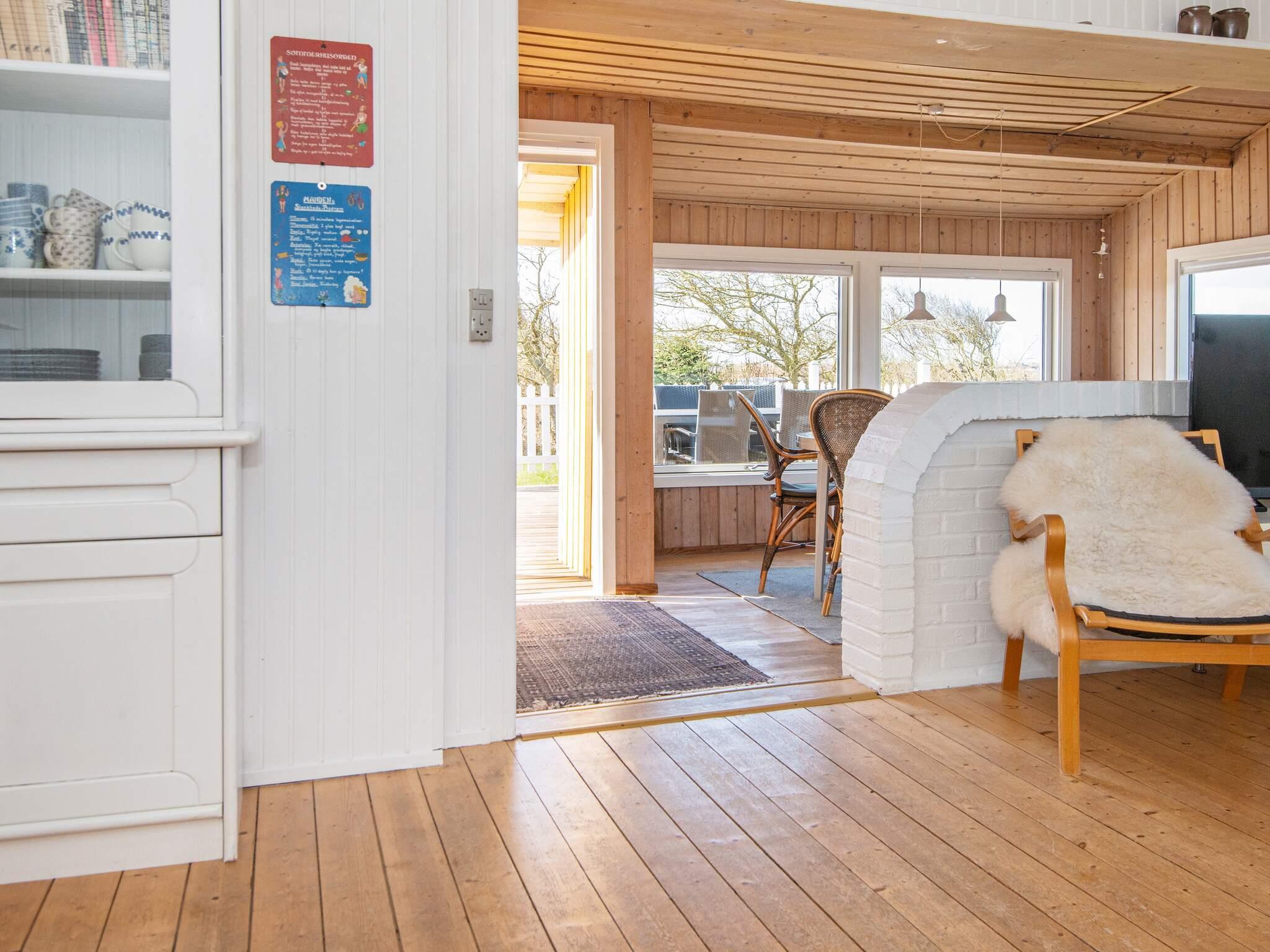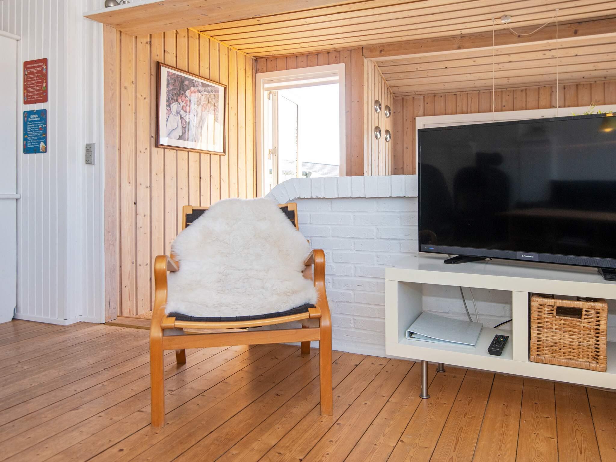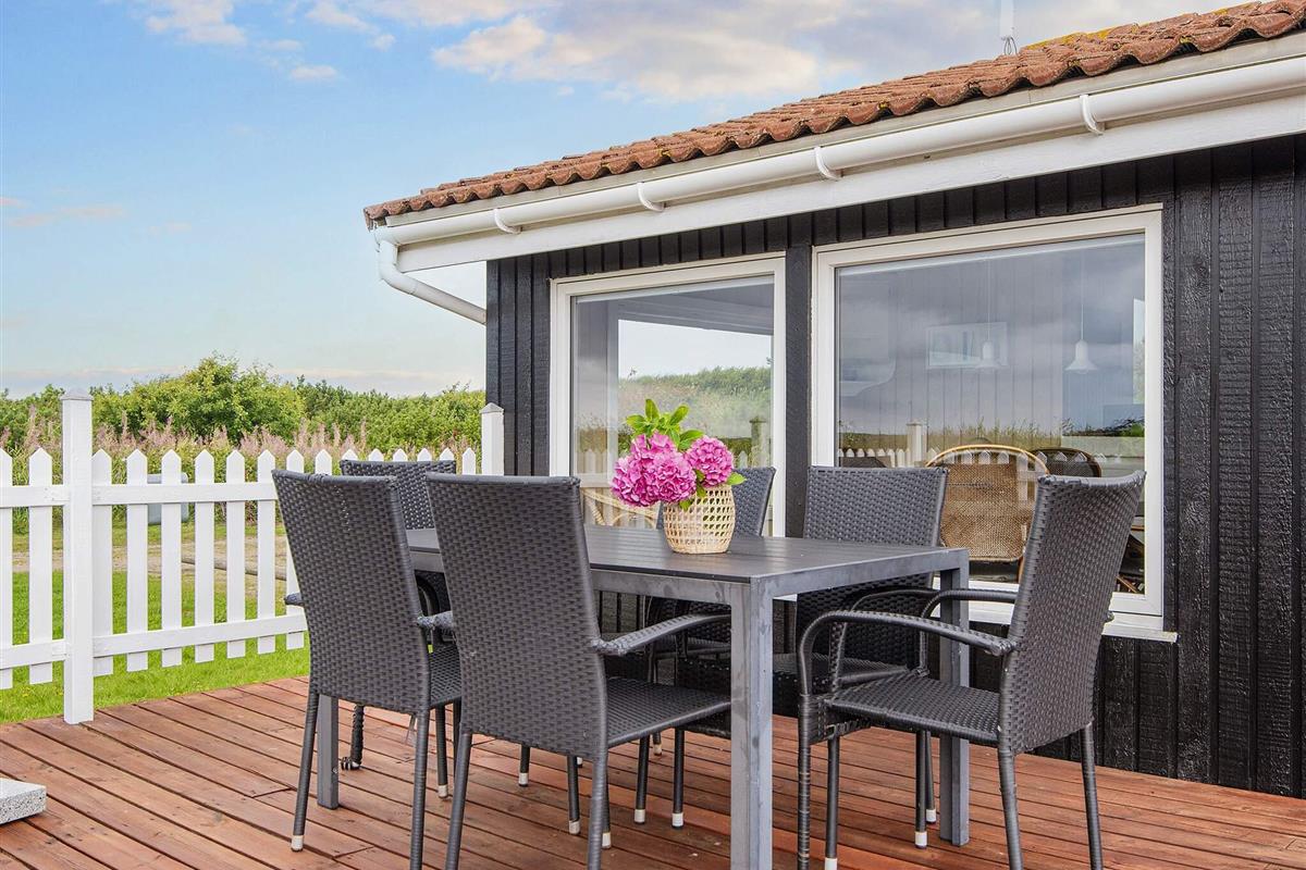 Ferienhaus in leicht erhöhter Lage und mit schönem Ausblick zur Dünenlandschaft ringsum. Liegt auf einem 2.000 m² großen Naturgrundstück in einem Ferienhausgebiet, in der Nähe vom Nordseestrand, Angelsee, Golfplatz und dem Ferienort Søndervig.