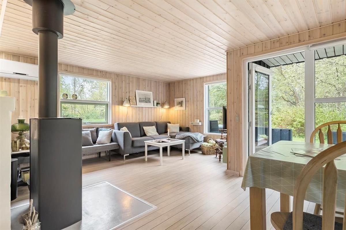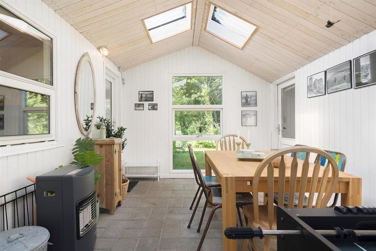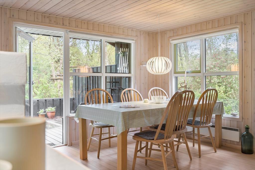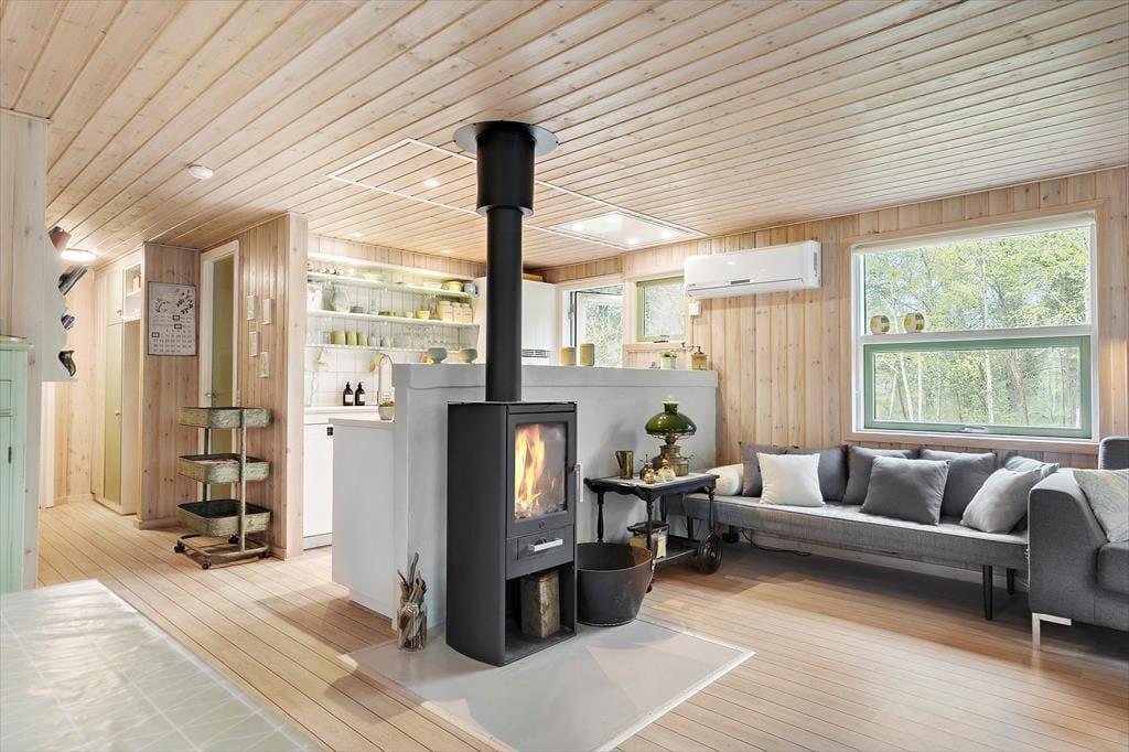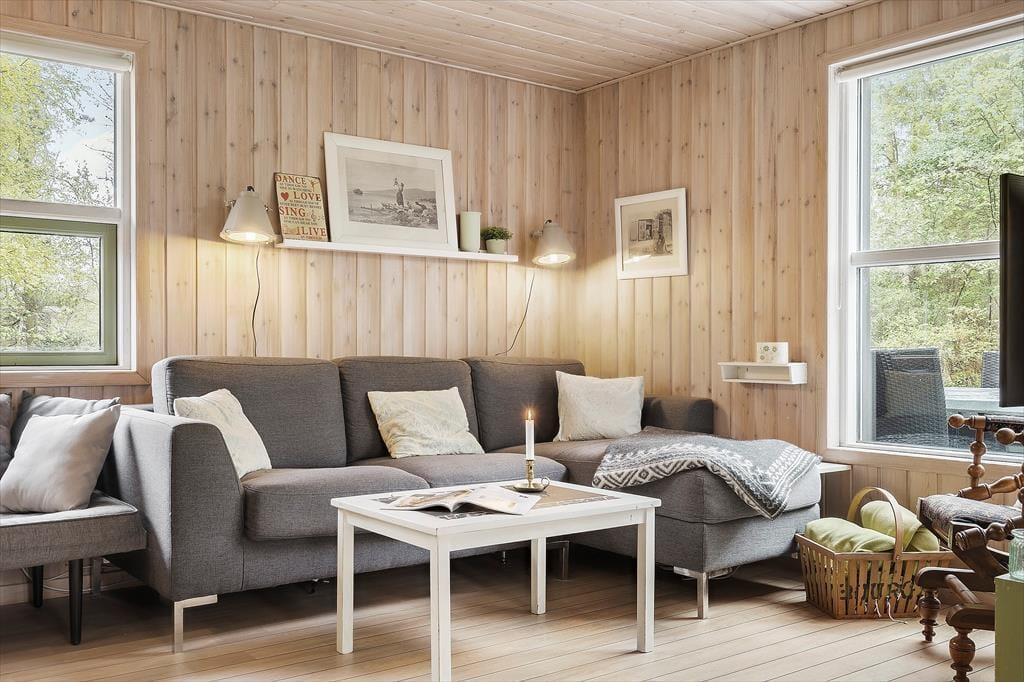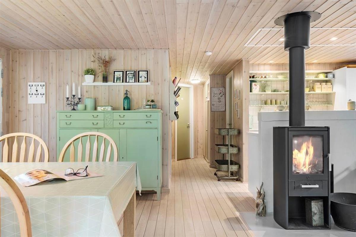 Das 100 m² große Holzferienhaus aus dem Jahr 1971 wurde zuletzt 2022 einer Renovierung unterzogen. Die Renovierung wurde mit viel Liebe durchgeführt. Beachten Sie in diesem Zusammenhang beispielsweise den schönen Grünton, der sich in allen Räumlichkeiten wiederfindet. Insgesamt besticht das Haus mit einer warmen und einladenden Atmosphäre. Neben dem Kaminofen im Wohnraum und der Sauna im Badezimmer sorgt auch die heimelige Einrichtung mit gemütlichen Möbelstücken für ein Maximum an Ferienhausstimmung. Der Wohnraum umfasst ein Sofa und ein Tagesbett, das sich gut für ein Nickerchen oder eine Lesestunde anbietet. Für Unterhaltung sorgt zudem ein Flachbild-TV. Ihre in der offenen Küche zubereiten Mahlzeiten genießen Sie rund um den Esstisch oder auch im Wintergarten, in dem im Anschluss auch gleich der Tischkicker lockt. Alternativ können Sie sich auch in einen der Schlafräume zurückziehen und dort die Wii-Konsole in Betrieb nehmen. Zwei der insgesamt drei Schlafräume beinhalten je ein Doppelbett. Im dritten Raum steht ein Etagenbett mit 90 x 200 Zentimeter großen Matratzen für Sie bereit.
