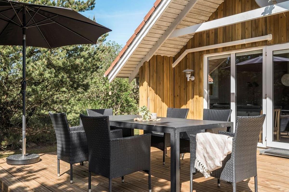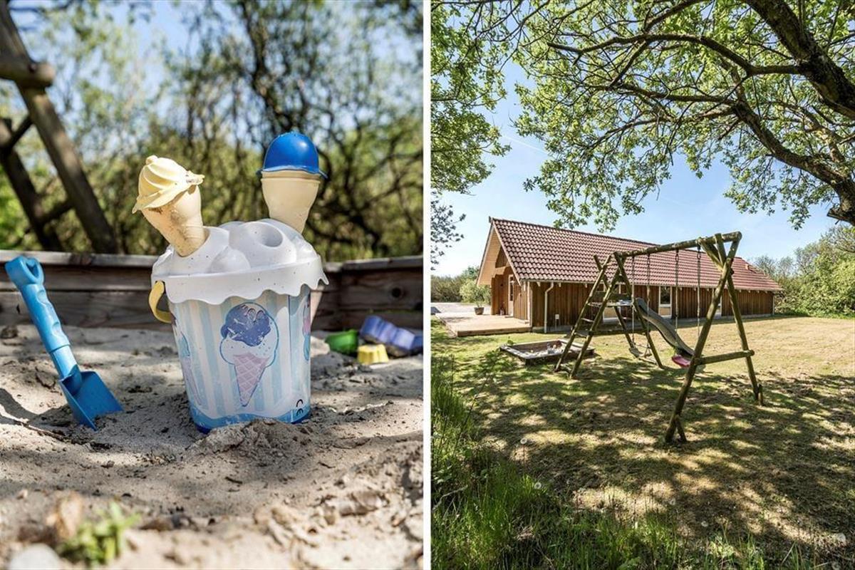 Das Grundstück bietet mit seiner Fläche von 2.352 m² viel Bewegungsfreiheit. Die Jüngsten können nach Herzenslust schaukeln und in der Sandkiste spielen. Ihre gesamte Familie wird auf der Grasfläche gern Fußball spielen. Die Grasfläche wird durch eine dichte Randbepflanzung gut abgeschirmt. Erholsame Momente genießen Sie auf der großen, teilweise überdachten Holzterrasse, die mit freiem Blick in den blauen Himmel und auf wunderschöne Sonnenuntergänge im Westen verwöhnt. An die Ostseite des Urlaubsdomizils schmiegt sich eine offene Terrasse. Im Garten treffen Sie auf schöne, gemütliche Eckchen inmitten friedvoller Umgebung.