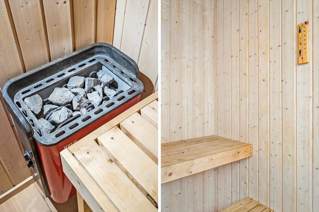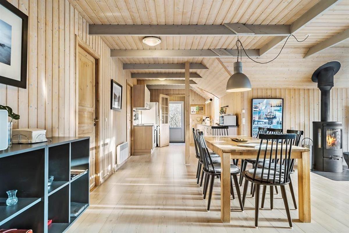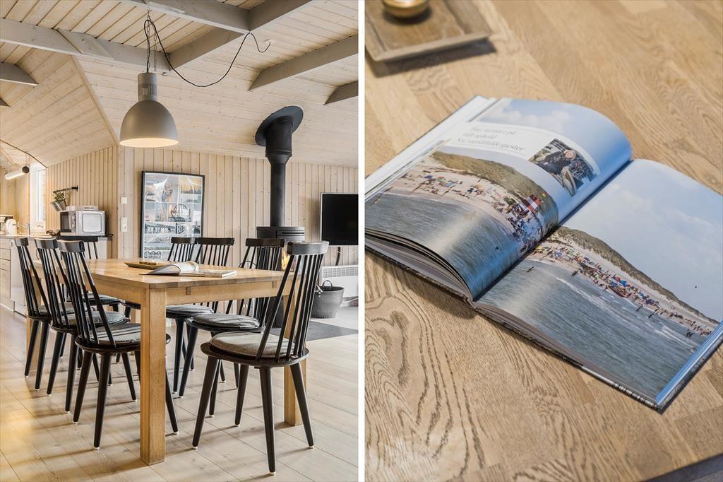 Bei diesem 117 m² großen Ferienhaus handelt es sich um ein besonders gemütliches und gut eingerichtetes Exemplar. Zur Wohnfläche zählen unter anderem vier Schlafräume und zwei Badezimmer, sodass sich dieses Haus sehr gut für zwei Familien eignet. Besonders die Erwachsenen werden Whirlpool und Sauna zu schätzen wissen, die beide im größeren Badezimmer platziert sind. Im Eingangsbereich stehen eine Waschmaschine und ein Wäschetrockner. Groß und klein werden den schönen Aufenthaltsraum lieben, der unglaublich viel Platz zum Spielen, für gemeinsame Spielrunden am Esstisch und für erholsame Momente vor dem Fernseher und dem Kaminofen bietet. Die gut ausgestattete Küche fügt sich offen in den Wohnraum ein. Durch die Terrassentür kommen Sie direkt auf die Terrasse.