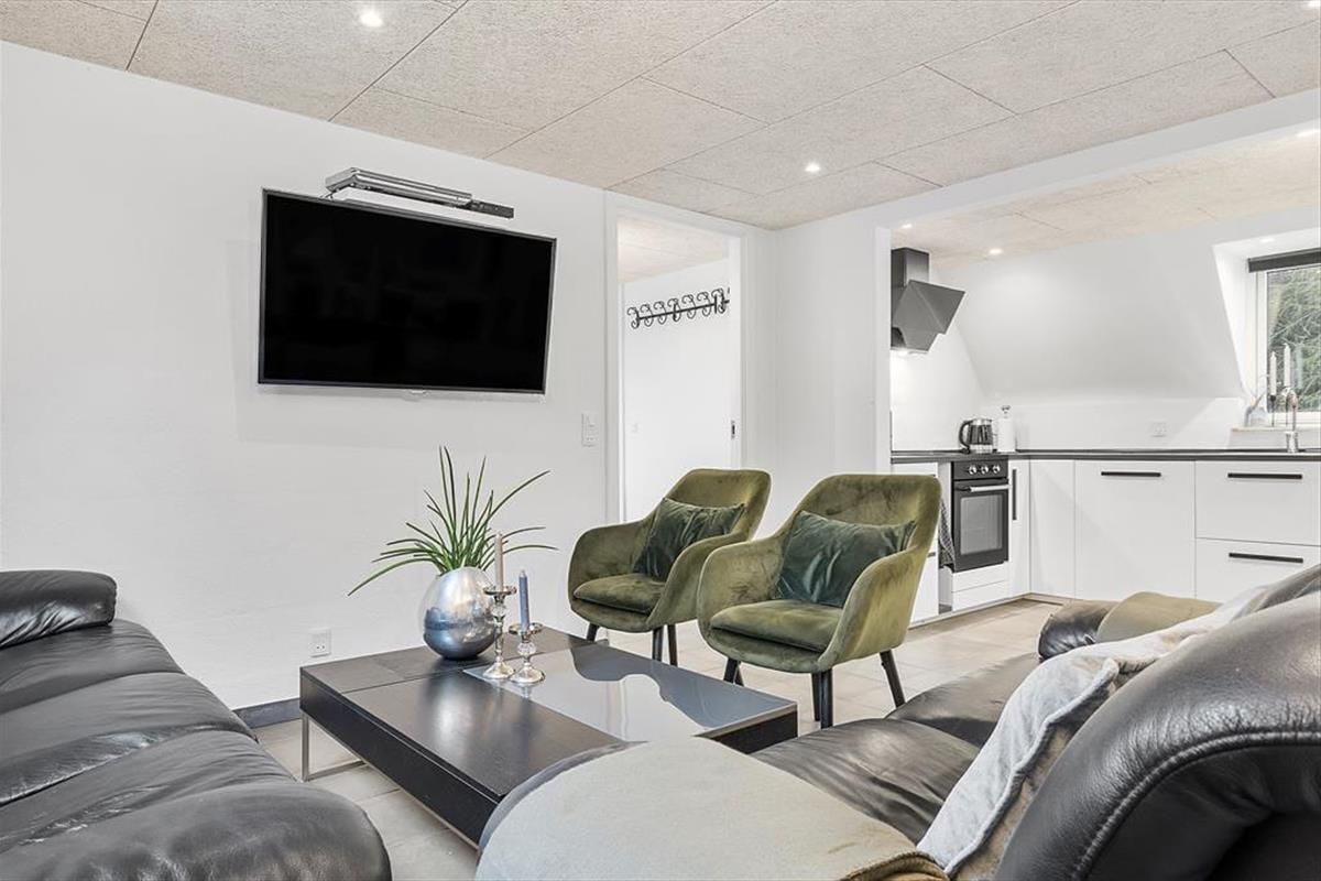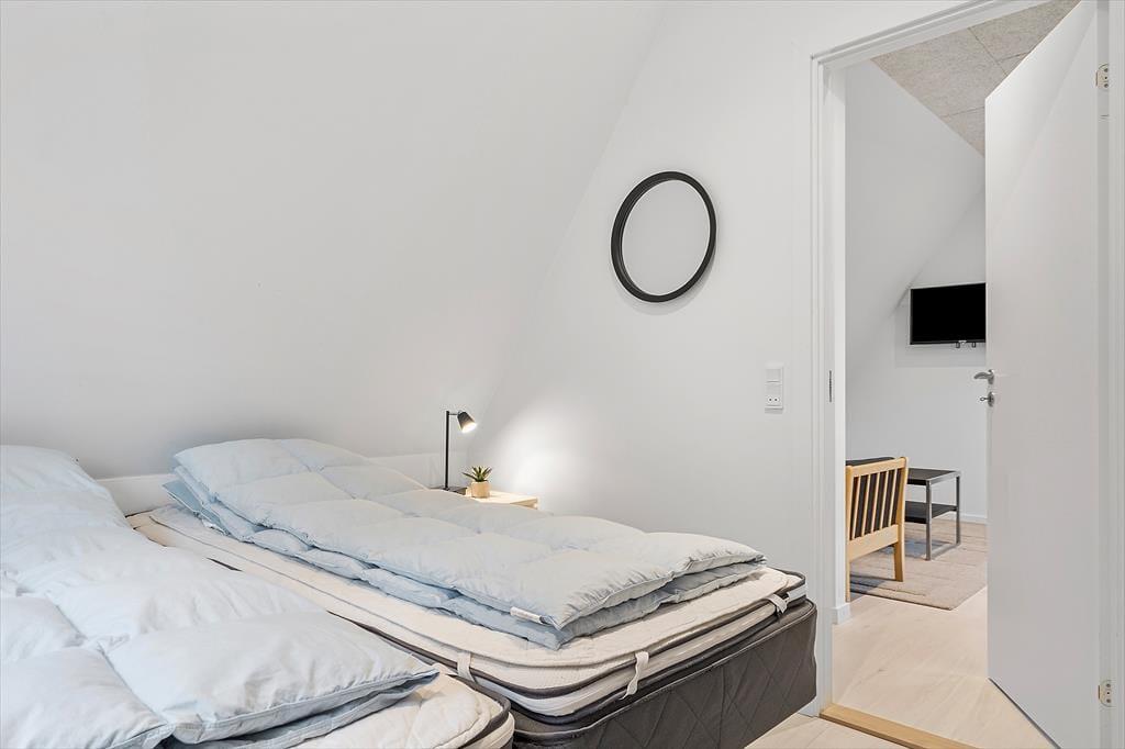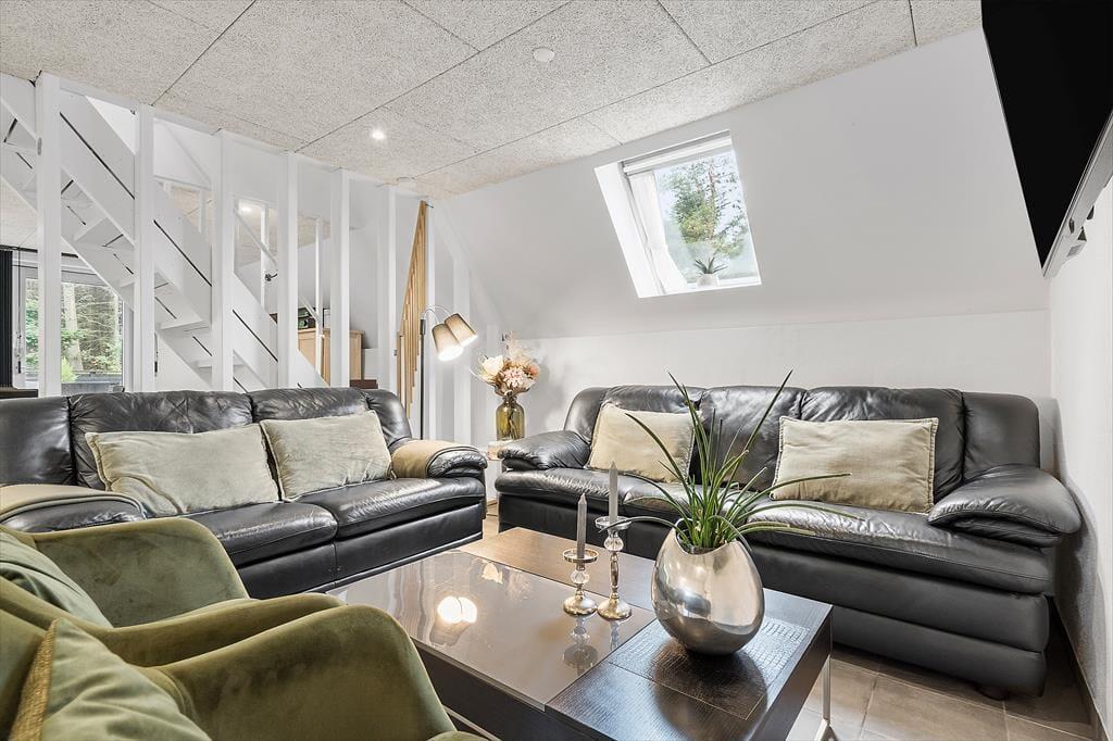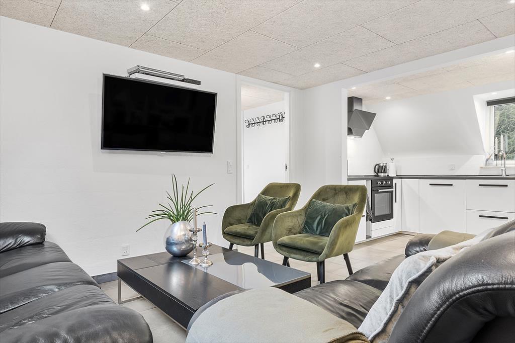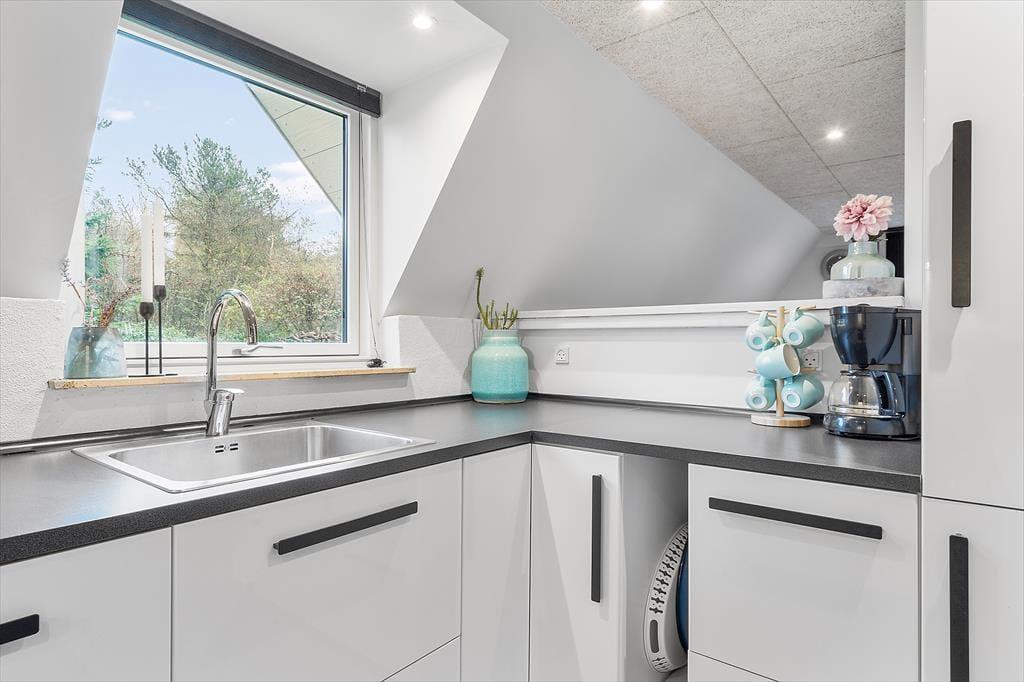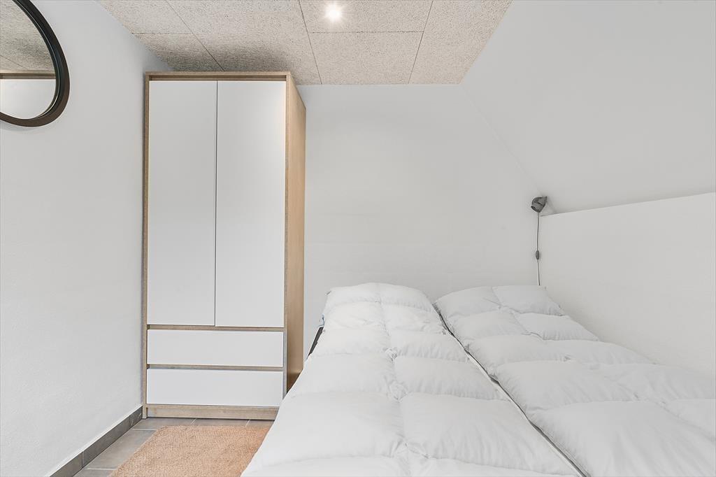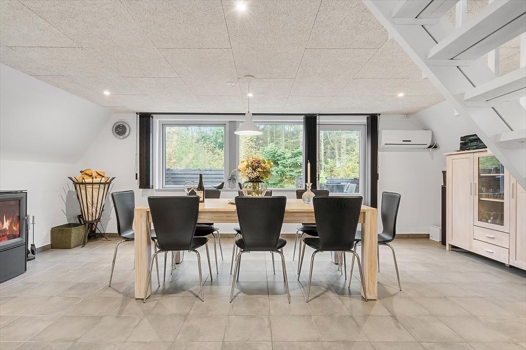 Wie bei einem typischen A-Haus reicht das Dach fast bis zum Boden und im Haus finden Sie zwei Ebenen, sodass Ihnen insgesamt 100 m2 zur Verfügung stehen. Die schrägen Wände sind ein charmantes Detail, und auch der Holzofen im Wohnzimmer ist eines der schönen Details, die für eine gemütliche Atmosphäre sorgen. Das Haus wurde 2021 renoviert, sodass die Räume hell und einladend wirken – nicht zuletzt das schöne Wohnzimmer, in dem Wohnzimmer und Küche vereint sind. Wenn Sie in der modernen Küche im Zweifel sind, was das Essen angeht, haben Sie guten Kontakt zum Sofabereich, wenn Sie sich mit dem Rest der Gesellschaft unterhalten möchten. Der Esstisch hat eine schöne Position in der Nähe des großen, nach Süden, ausgerichteten Fensters. Im Erdgeschoss befinden sich ein Duschbad und ein Schlafzimmer. Wenn Sie die Treppe hinaufgehen, finden Sie ein schönes Wohnzimmer und zwei weitere Schlafzimmer.