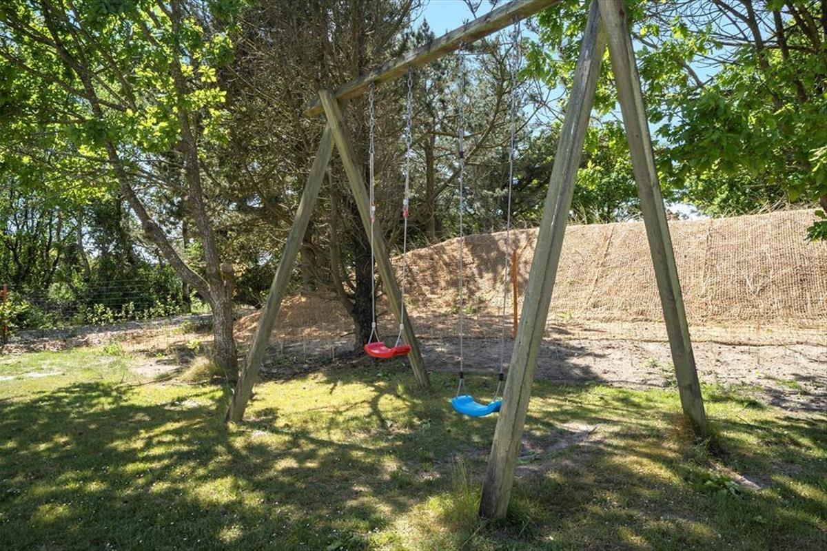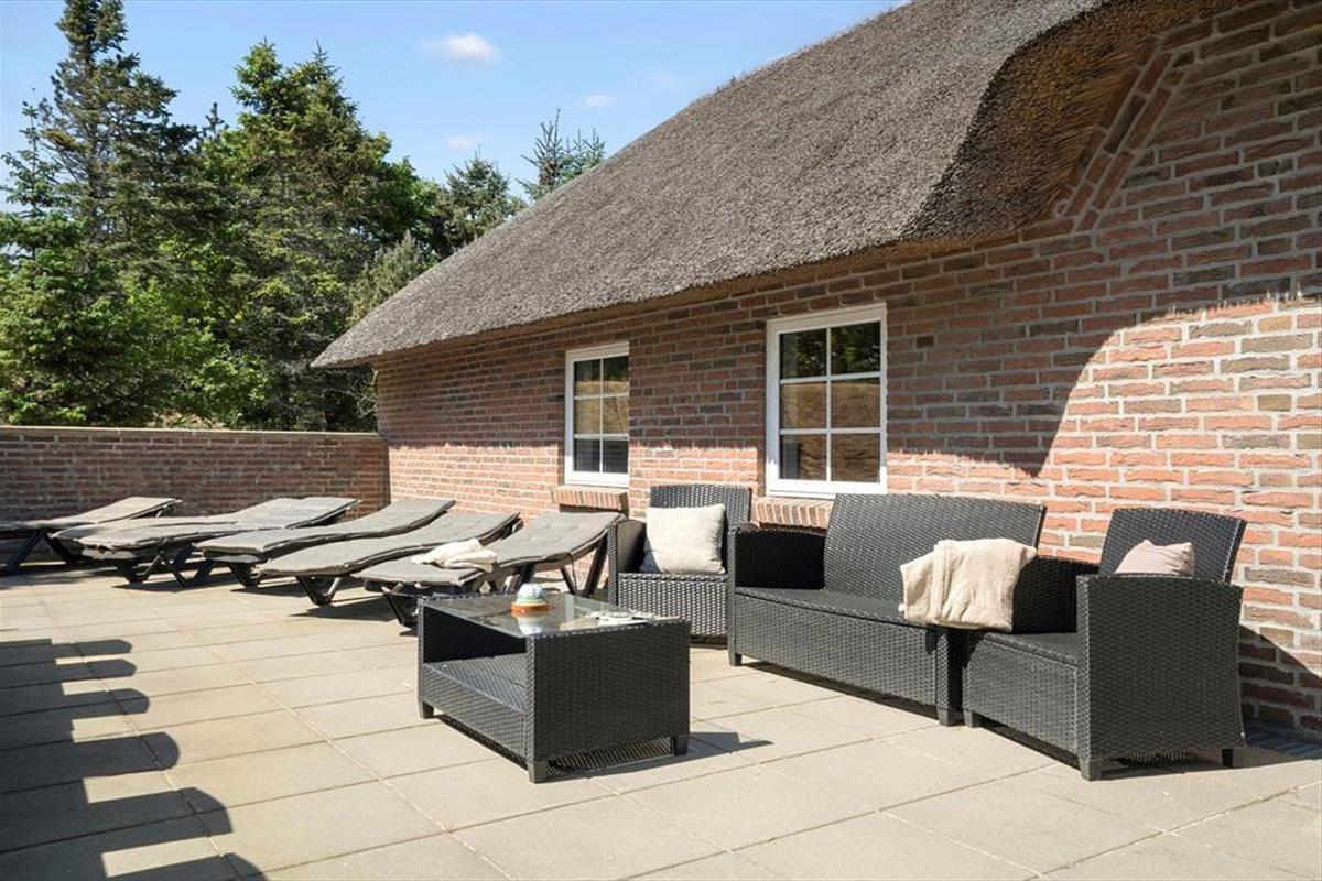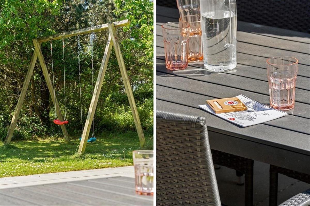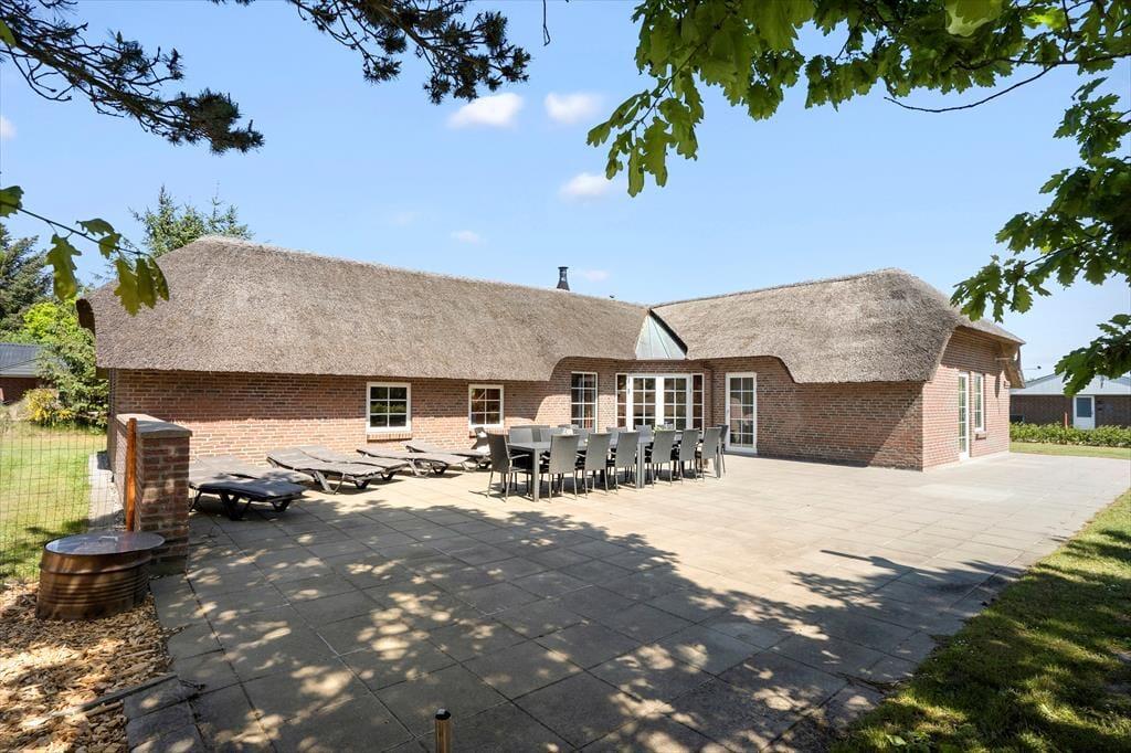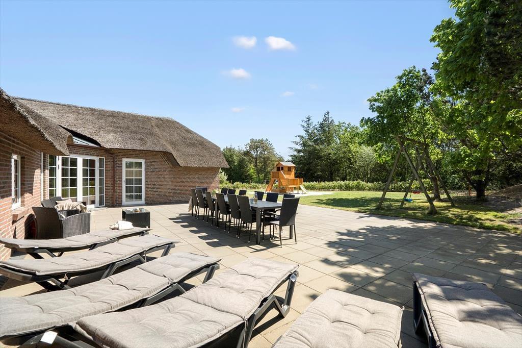 Das reetgedeckte rote Steinhaus liegt wunderschön auf einem 2300 m2 großen Grundstück, das nach Westen durch dichte Vegetation abgeschirmt ist. Der Rasen ist eben, sodass er zu Ballspielen und anderen Aktivitäten einlädt. Für die kleinsten Urlaubsgäste gibt es außerdem einen Sandkasten und Schaukeln – und auch die Spielmöglichkeiten sind so geschickt platziert, dass die Erwachsenen ganz in der Nähe auf der gefliesten Terrasse sitzen können. Dank der Südlage und der großzügigen Größe ist es möglich, fast den ganzen Tag über einen sonnigen Terrassenplatz zu finden und abends auf der Bank rund um den Garten den Rest der Gesellschaft mit frisch gegrillten Köstlichkeiten zu verwöhnen Tische.