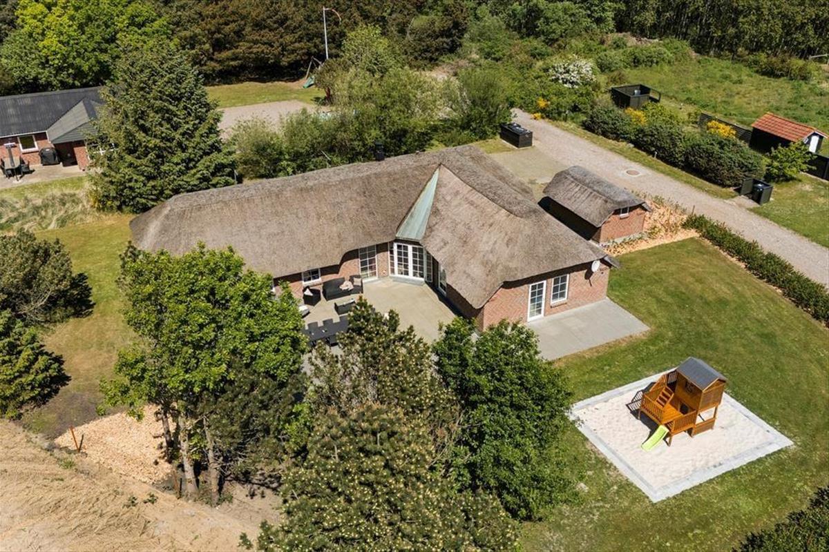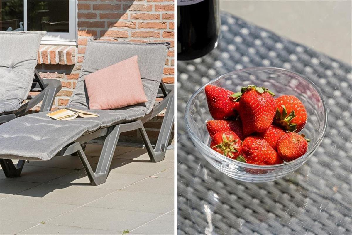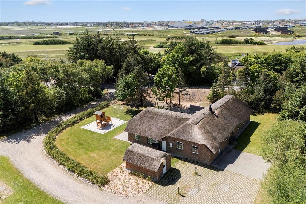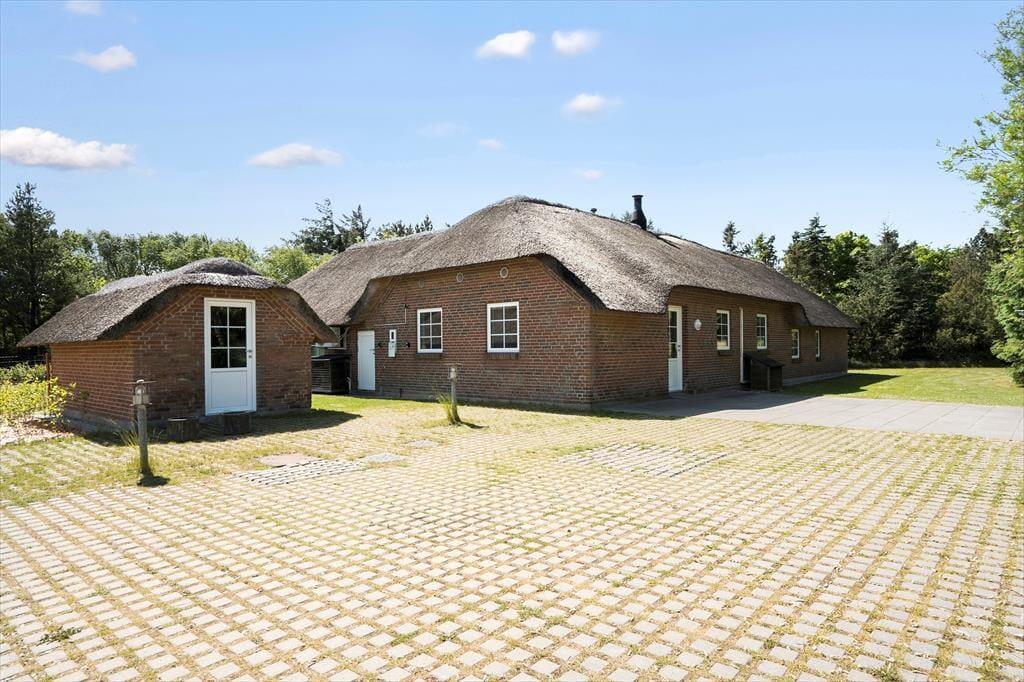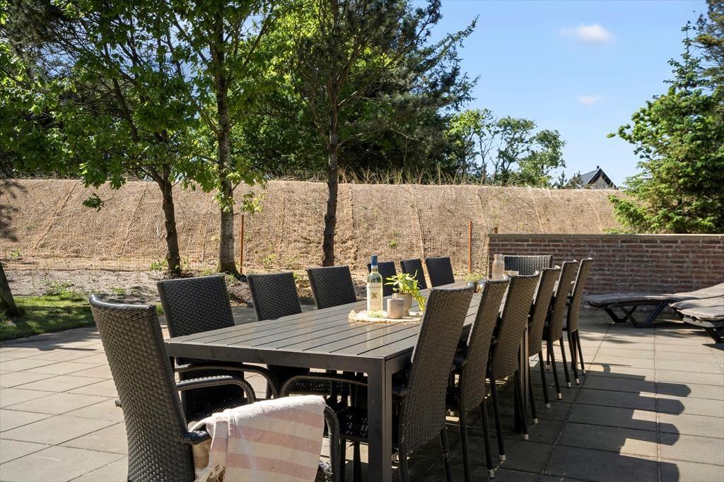 Das reetgedeckte rote Steinhaus liegt wunderschön auf einem 2300 m2 großen Grundstück, das nach Westen durch dichte Vegetation abgeschirmt ist. Der Rasen ist eben, sodass er zu Ballspielen und anderen Aktivitäten einlädt. Für die kleinsten Urlaubsgäste gibt es außerdem einen Sandkasten und Schaukeln – und auch die Spielmöglichkeiten sind so geschickt platziert, dass die Erwachsenen ganz in der Nähe auf der gefliesten Terrasse sitzen können. Dank der Südlage und der großzügigen Größe ist es möglich, fast den ganzen Tag über einen sonnigen Terrassenplatz zu finden und abends auf der Bank rund um den Garten den Rest der Gesellschaft mit frisch gegrillten Köstlichkeiten zu verwöhnen Tische.