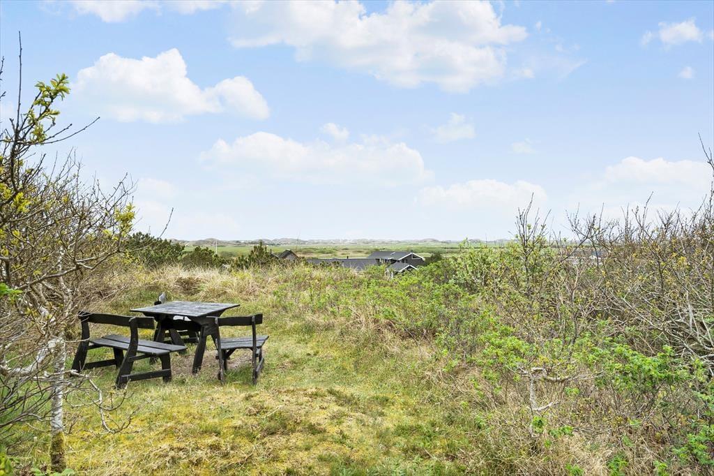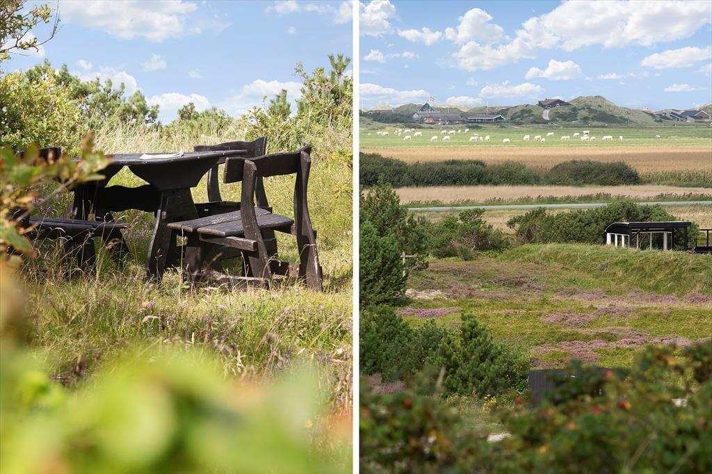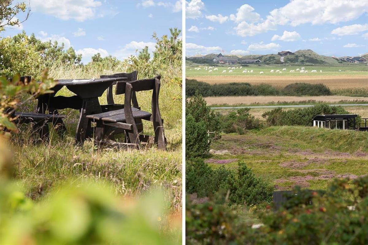 Friedvoll und idyllisch geht es auf dem 2.640 m² großen Naturgrundstück am Ende eines kleinen Seitenwegs zu. Eichenbüsche und anderer Bewuchs schirmen die Außenareale ab, sodass Sie problemlos einen sonnigen, windgeschützten Aufenthaltsplatz für entspannte Pausen finden. An die Südwestseite des Mietobjekts schließt eine Terrasse. Eine kleine Treppe führt Sie hinauf zu einer Picknickgarnitur, von der Sie weit über die offene Landschaft und bis zu den Nordseedünen im Westen blicken. Ein kleines Stückchen weiter östlich treffen Sie auf ein grünes Gemeinschaftsareal mit einer Schaukel, einem Handballtor und einem Basketballkorb, auf dem Ihre gesamte Familie vergnügte und aktive Stunden verbringen kann.
