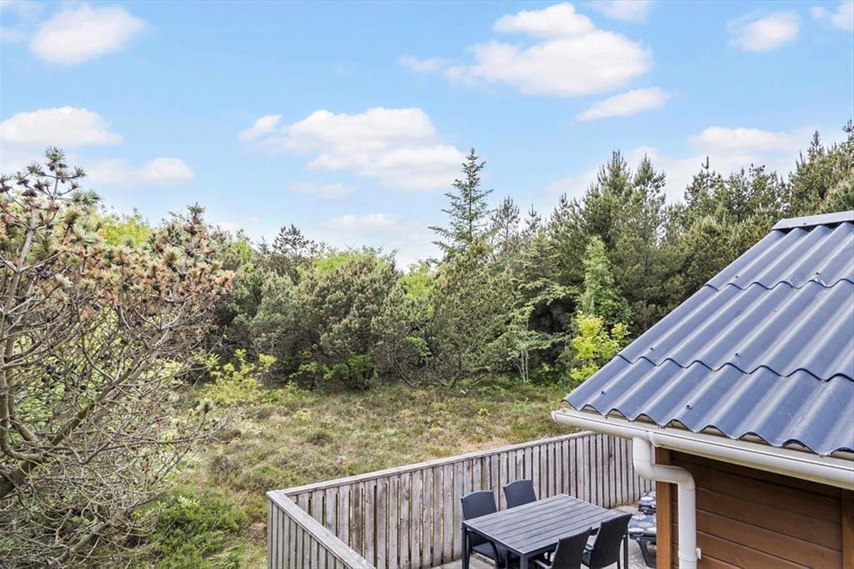 Vom Wohnraum treten Sie hinaus auf die schöne Terrasse, die dank Ihrer Ausrichtung gen Süden wunderbar sonnig ist. Auf der Terrasse können Sie sich nach Herzenslust sonnen und entspannen - untermalt von einem schönen Ausblick auf die Bäume und Büsche des Naturgrundstücks. Der schöne Gesang der Vögel in den Baumkronen macht die friedvolle Ferienhausidylle perfekt.