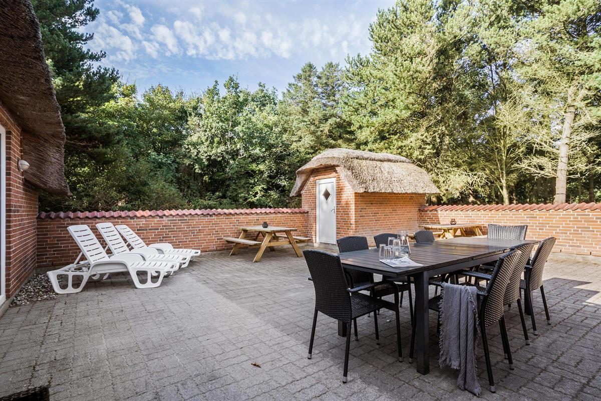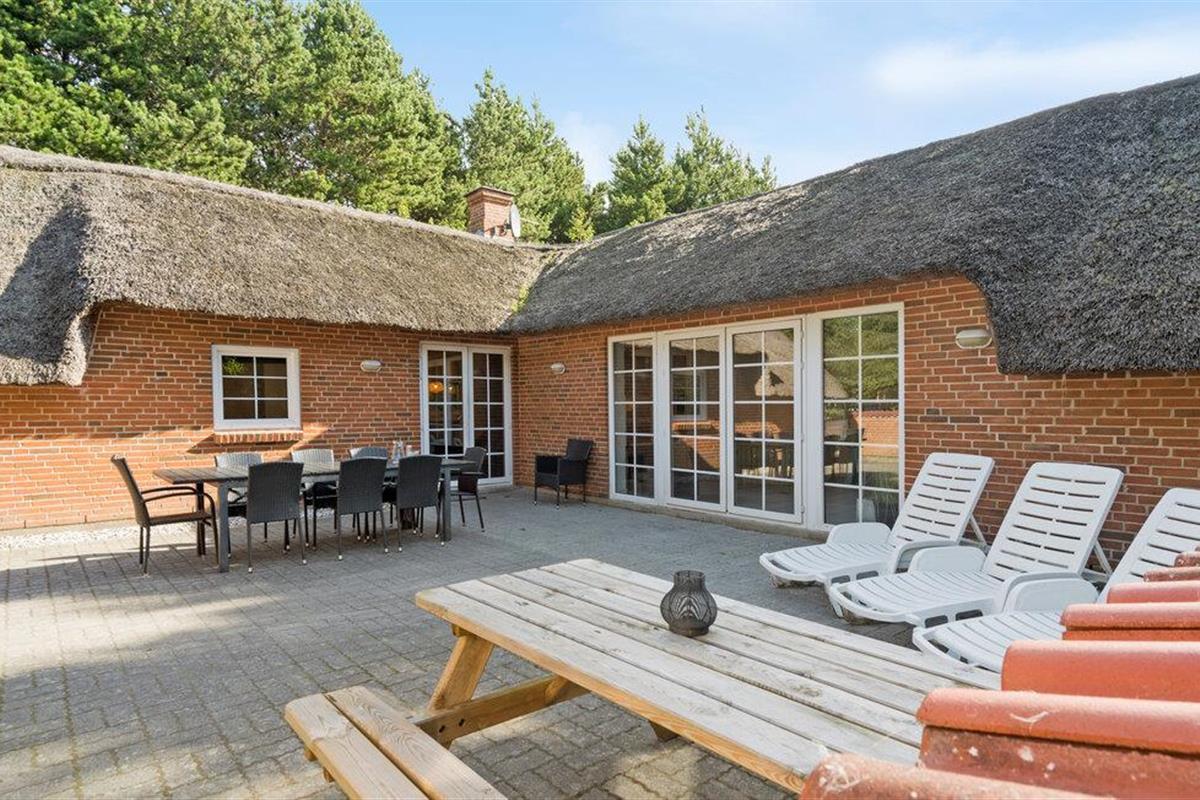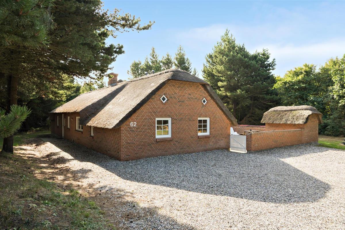 Ruim vakantiehuis met rieten dak in Lodbjerg Hede, dichtbij Søndervig en de Noordzeestranden, met zwembad en sauna.