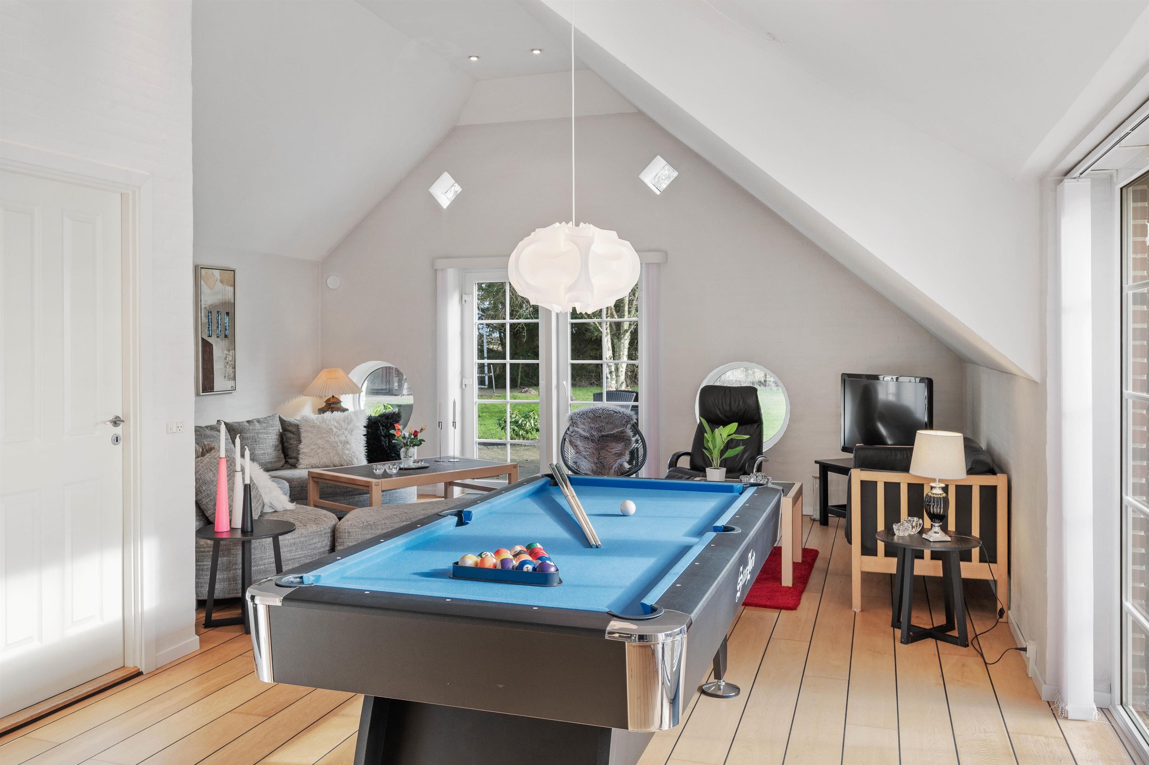 This thatched holiday home welcomes you with its centrepiece - an open-plan living area combining the kitchen, dining area and comfortable seating arrangement. Here you can try out new recipes together, crown the next poker champion during a fun games evening, or enjoy a round of pool. The sofa arrangement is perfect for relaxing in front of the television while the dishwasher takes care of the cleaning. A wood-burning stove adds extra atmosphere, while an energy-efficient air-to-air heat pump maintains a pleasant indoor climate. You'll find a second fridge in the living area under the stairs, and an additional chest freezer has been installed in a separate room next to the twin bedroom.
