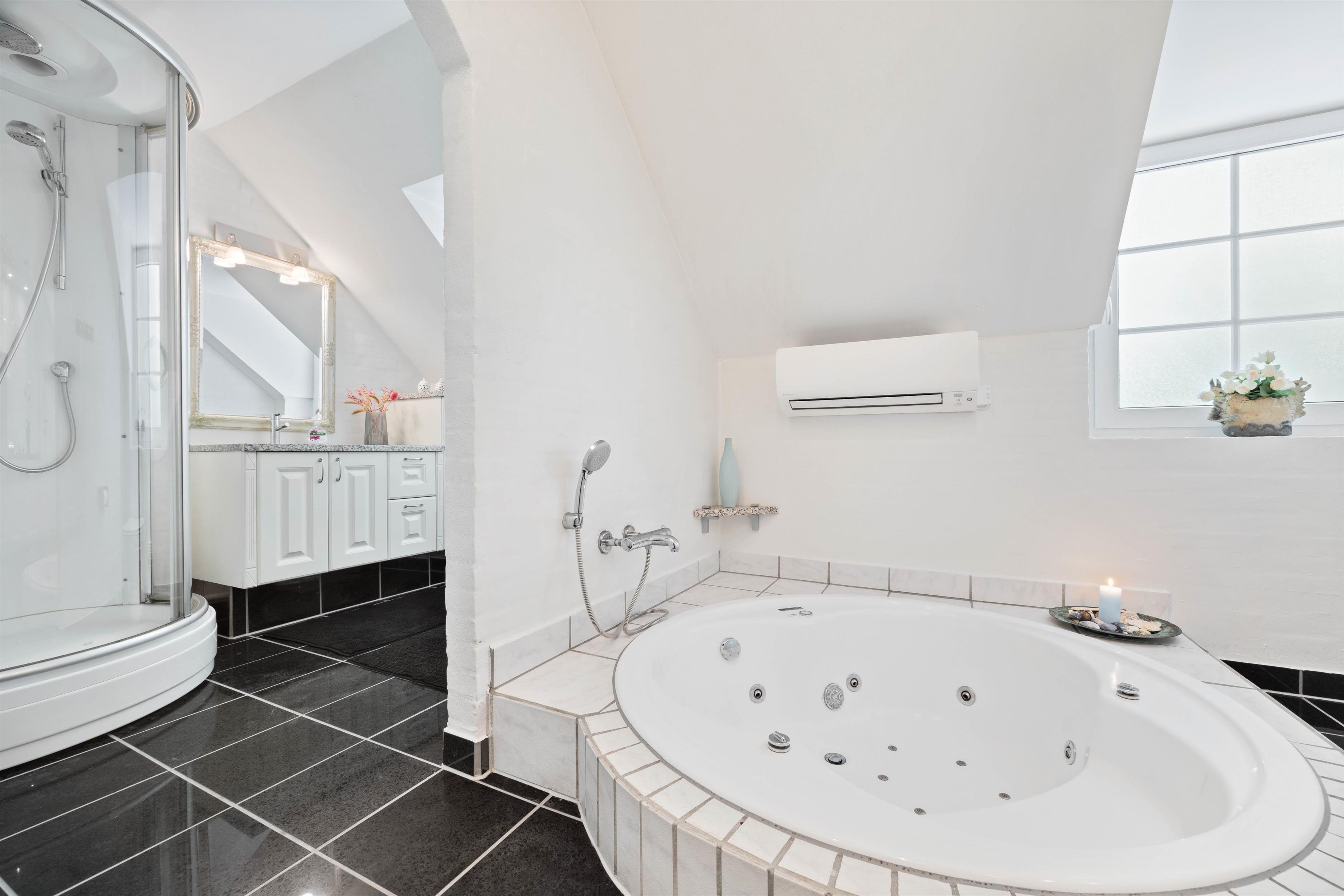 There are 4 bedrooms available - three with double beds and one with twin beds - ensuring everyone has a comfortable space to recharge their batteries. To avoid morning queues, there are two bathrooms with underfloor heating, so no cold feet during the winter months. After a long walk, you can unwind in the whirlpool.
