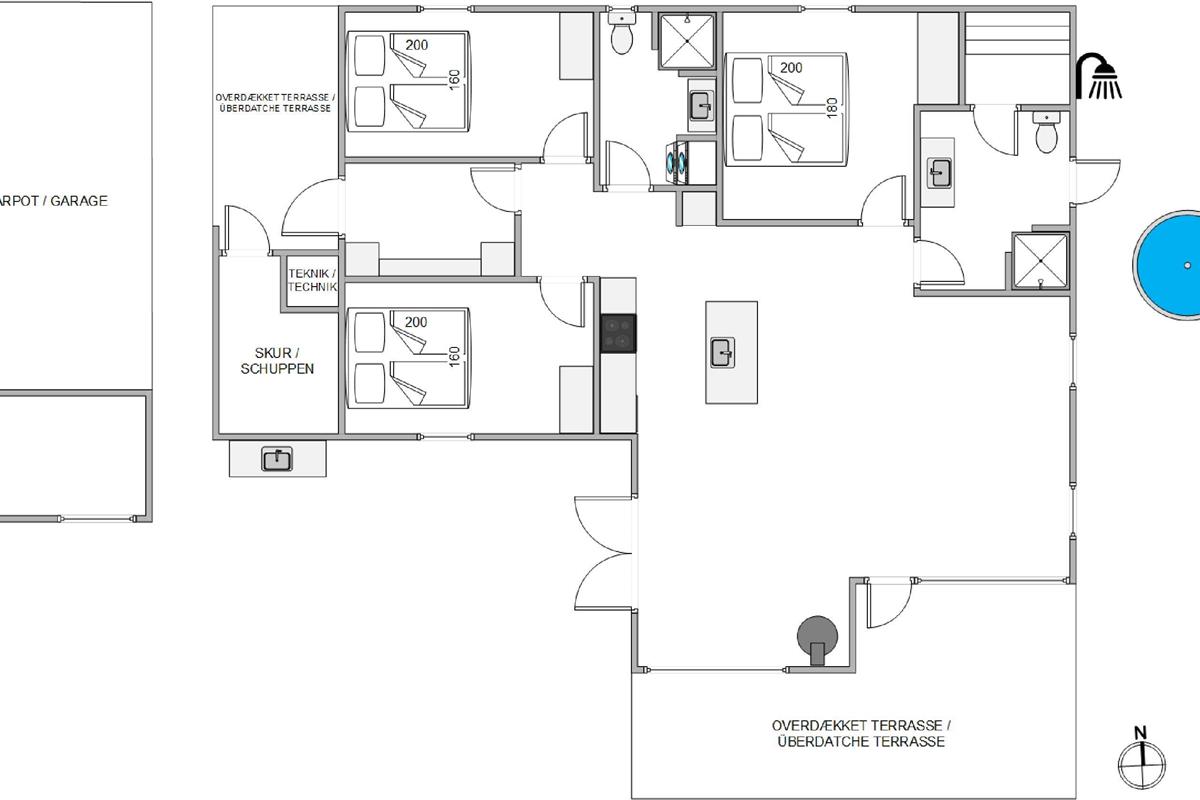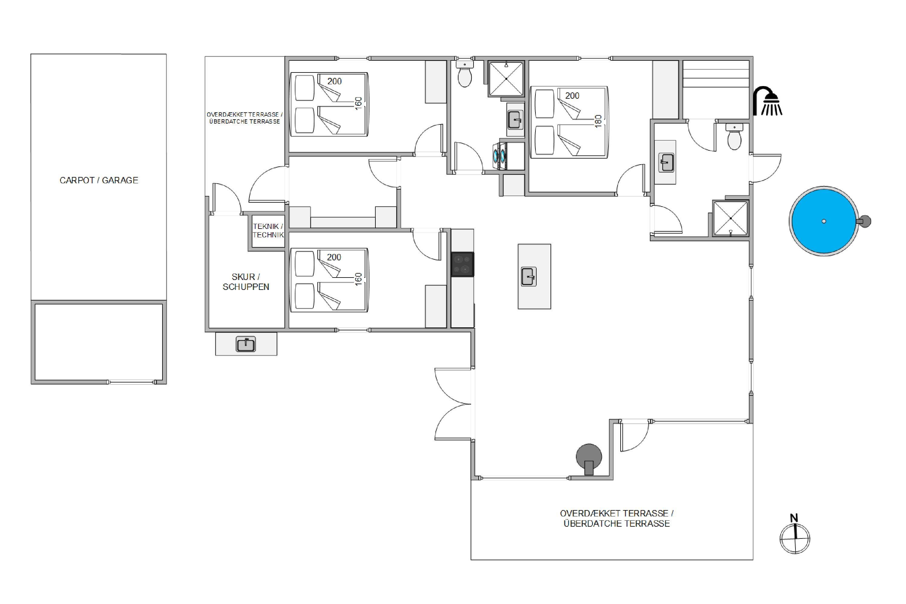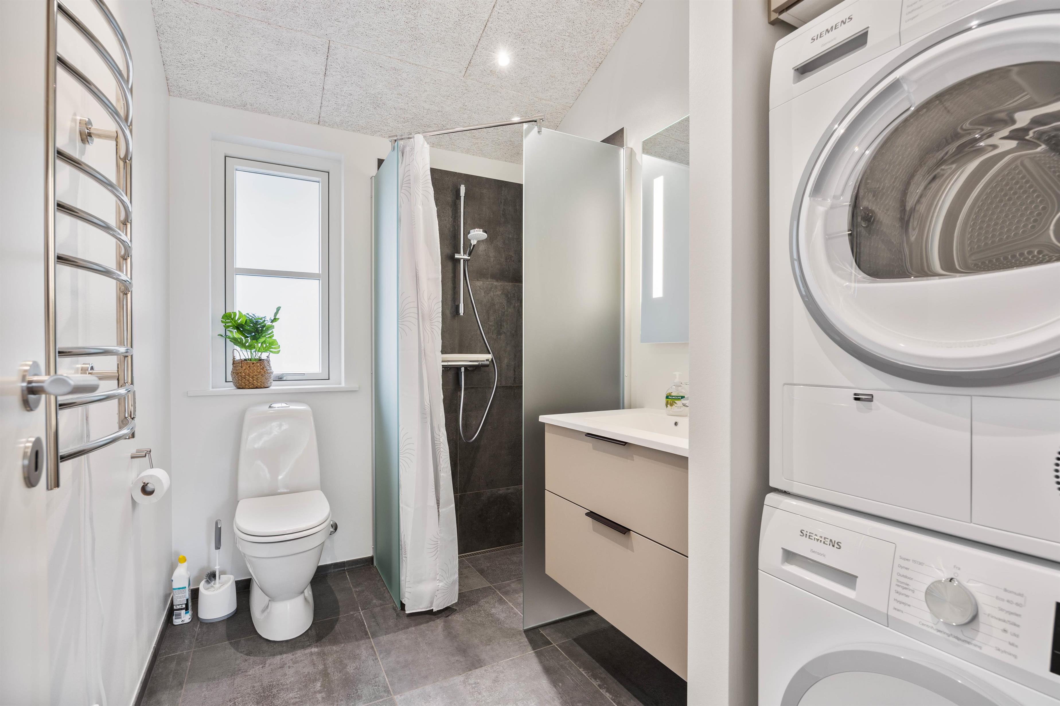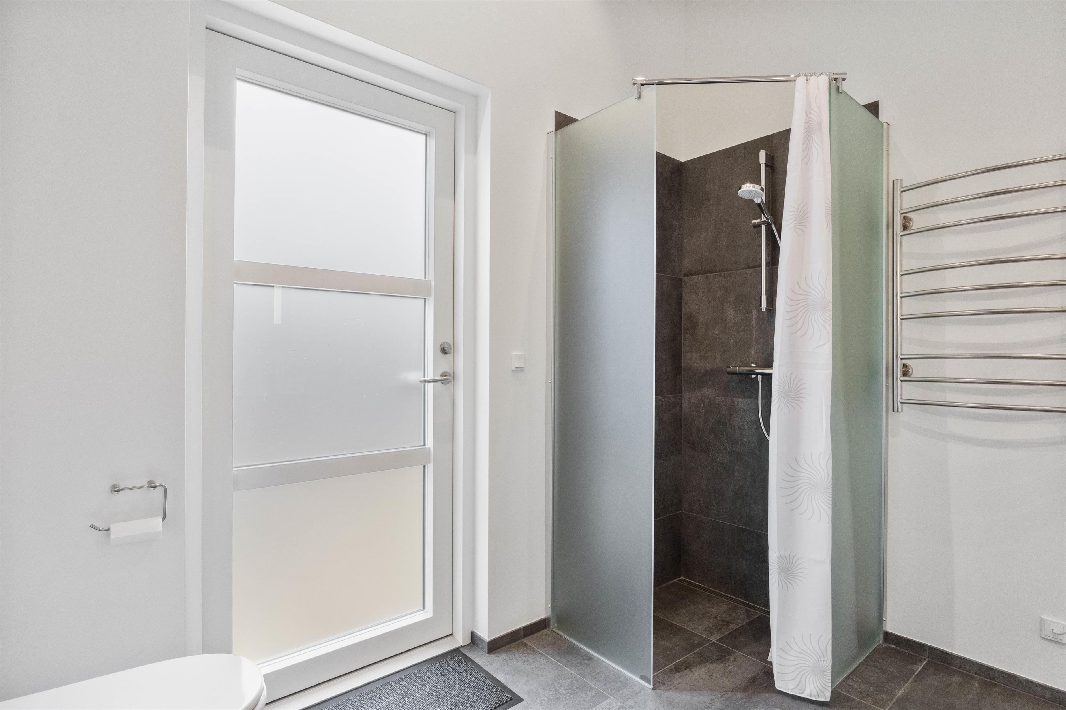 The holiday home features three bedrooms, each with a double bed, perfect for recharging after a day's activities. The comfortable beds ensure you wake up fresh and ready for new holiday adventures. There are two bathrooms, both with underfloor heating, and one houses the holiday home's sauna. Here you can relax and let your thoughts drift while recovering from everyday stress. After a lovely beach walk, you can rinse the sand from your feet using the outdoor shower.