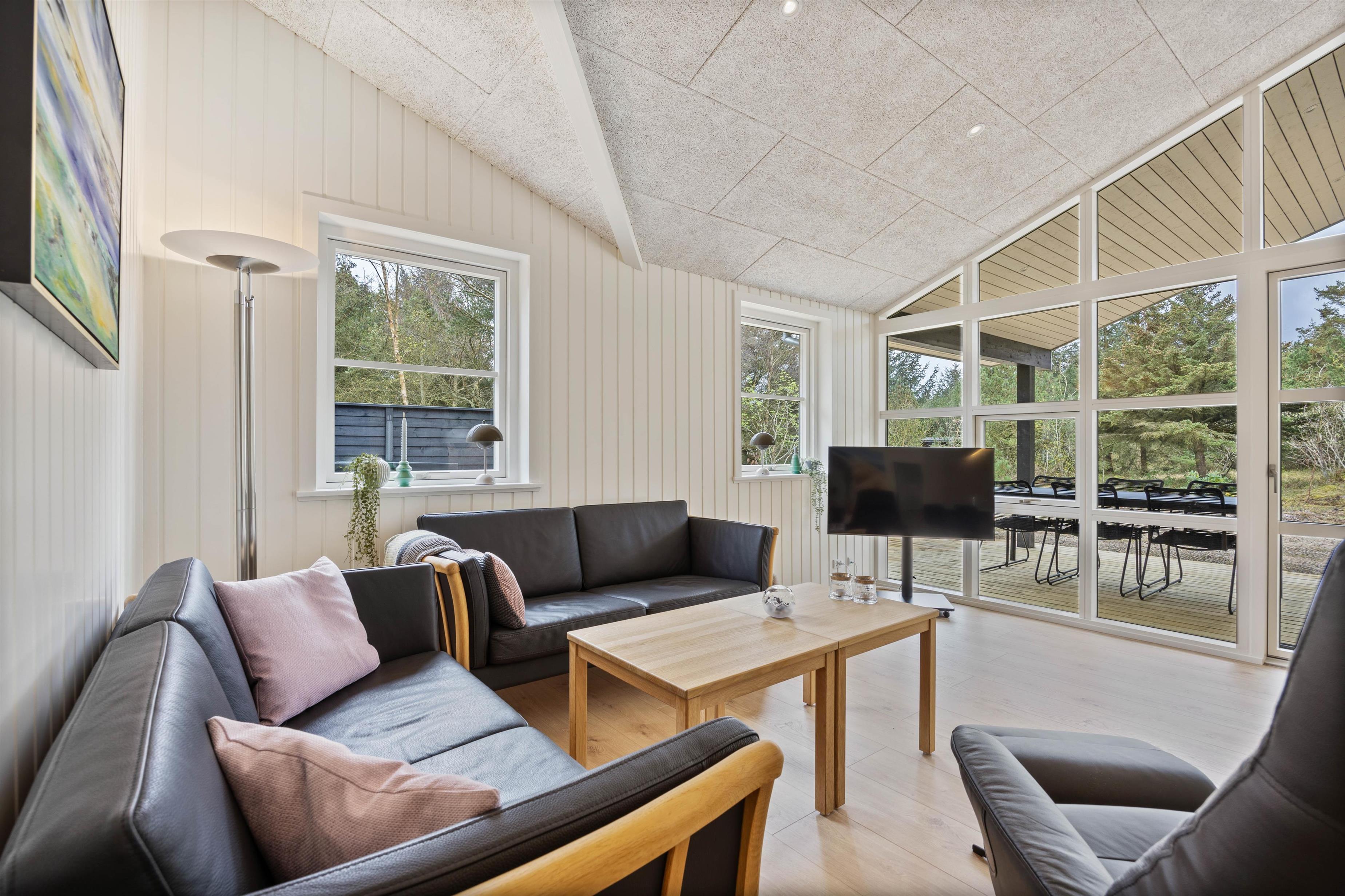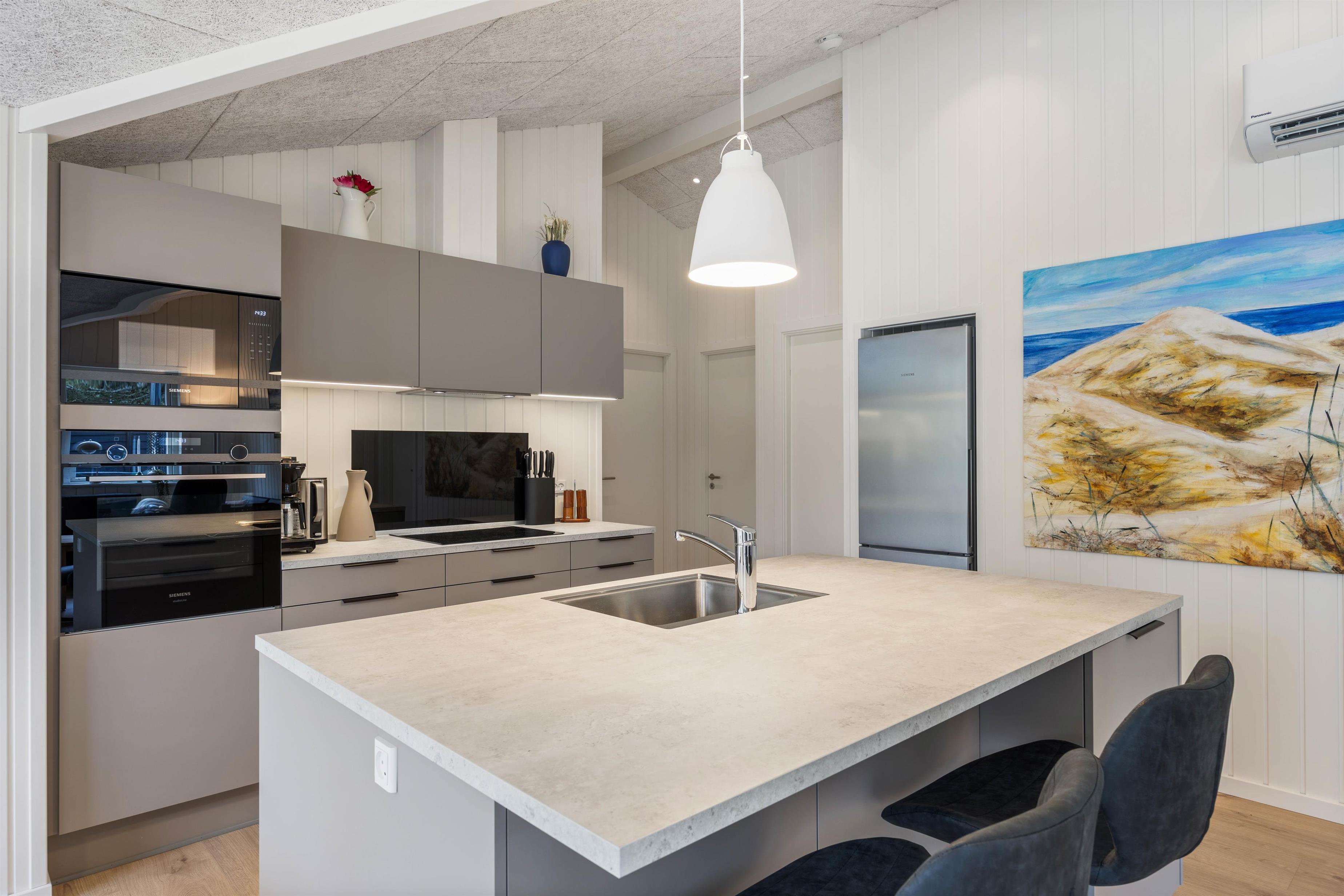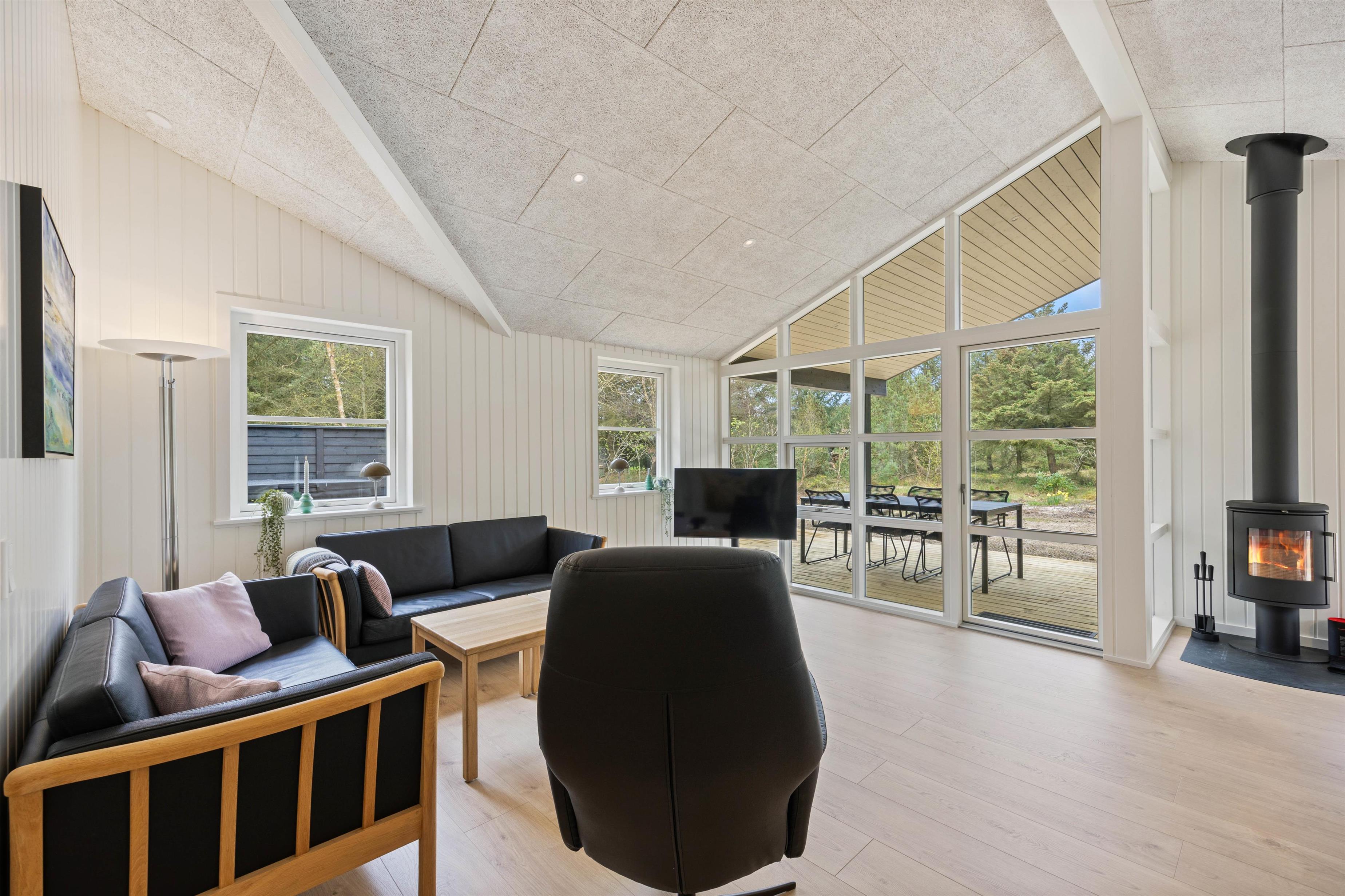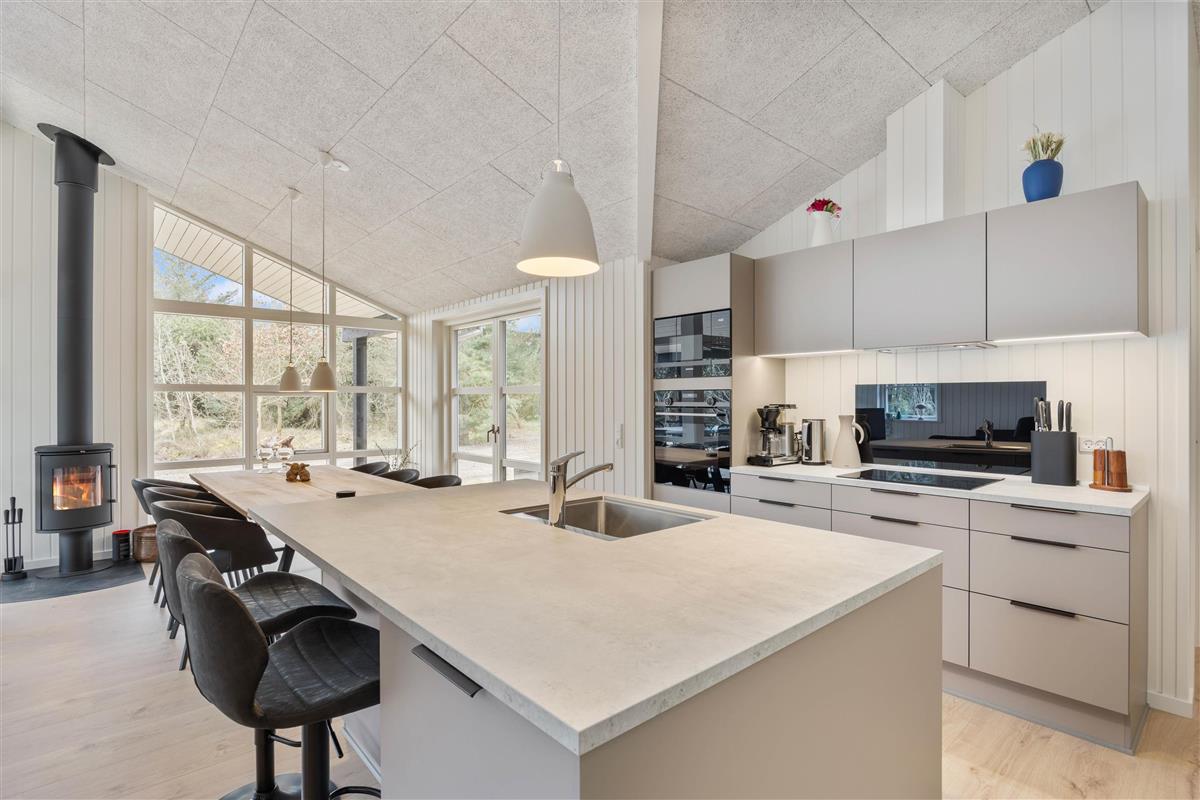 At Koglevej 4 in Lodberg Hede, you'll find modern, stylish accommodation with a kitchen equipped with all necessary appliances for preparing delicious holiday meals. The dishwasher makes quick work of cleaning up, and there's plenty of space to gather and enjoy refreshments while the children relax and dinner simmers. In the evening, you can settle down on the sofa and gaze at the starry sky and surrounding nature through the large panoramic windows, while the wood-burning stove crackles, creating that quintessential holiday home atmosphere.