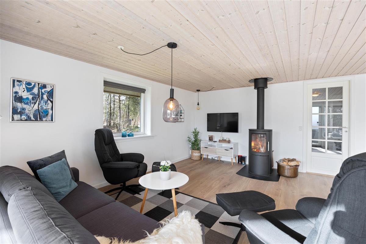 The wood-burning stove in the living area provides that warm, cosy holiday atmosphere, while the energy-efficient air-to-air heat pump ensures a consistent, comfortable temperature throughout.