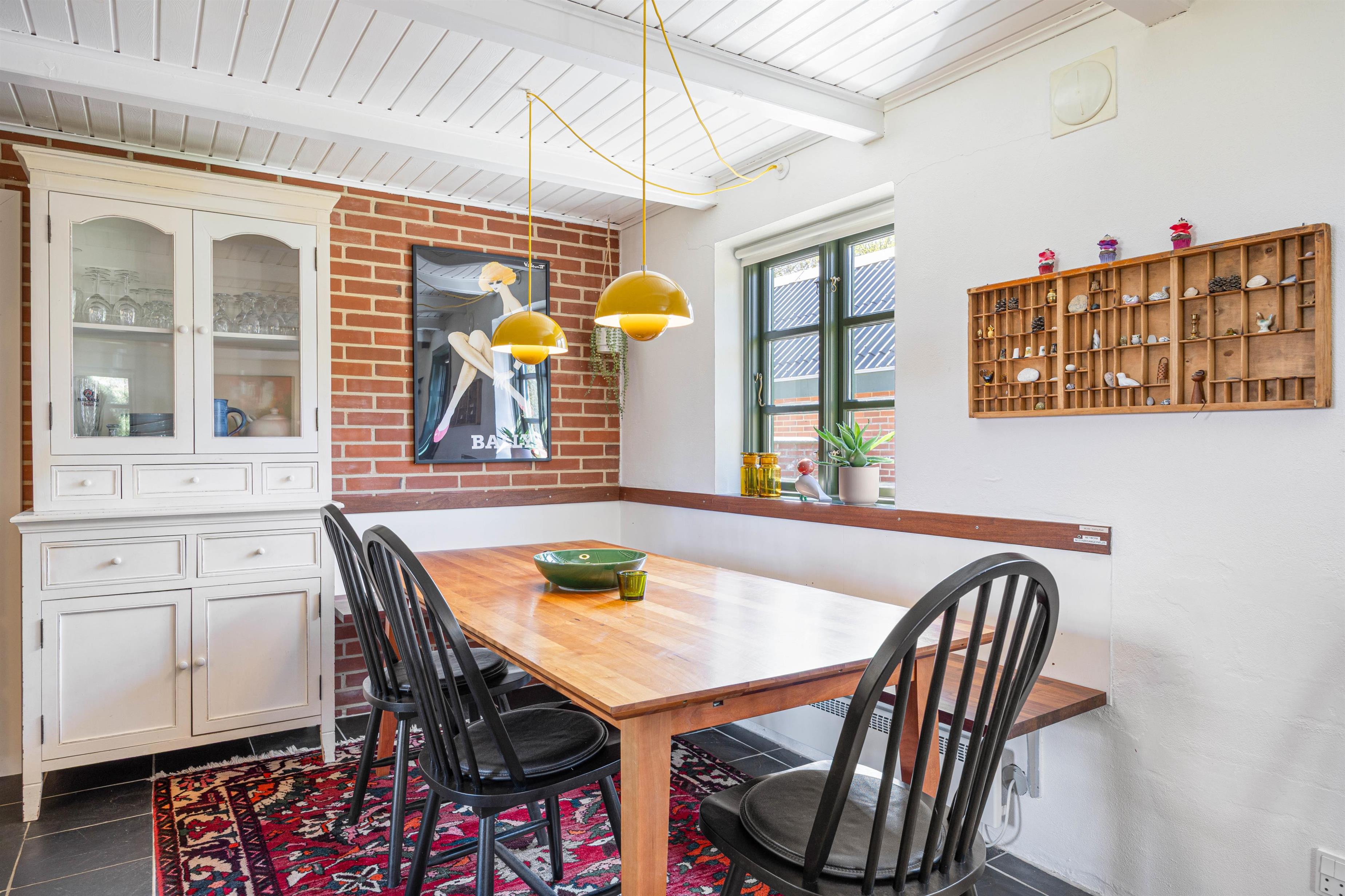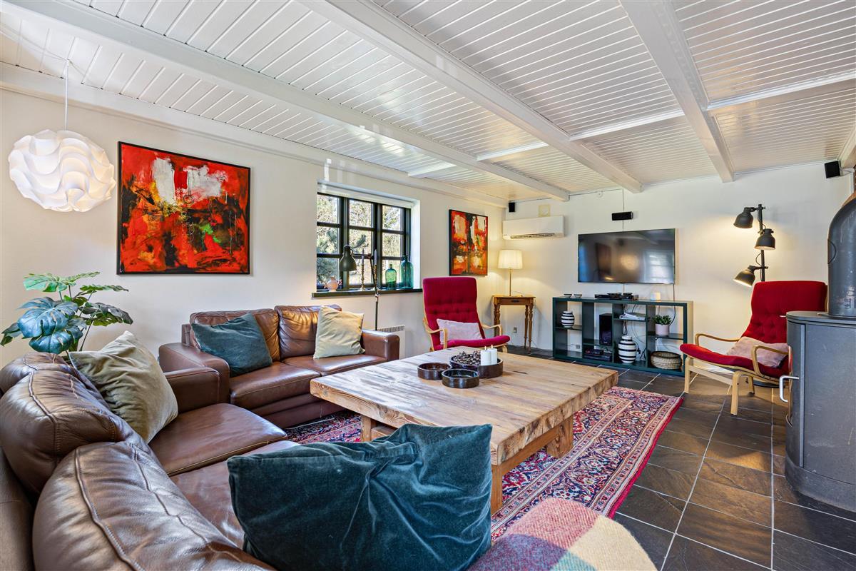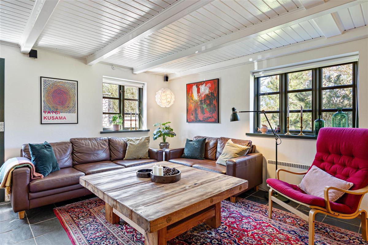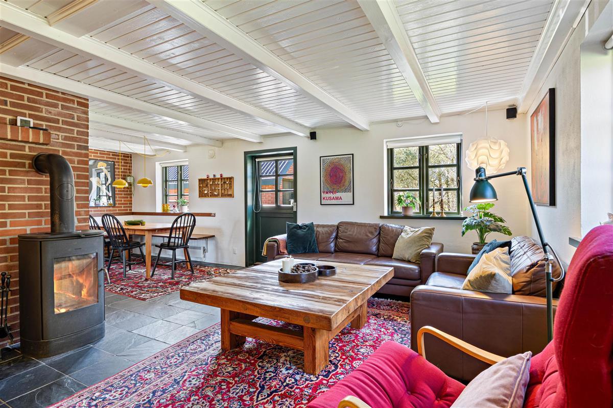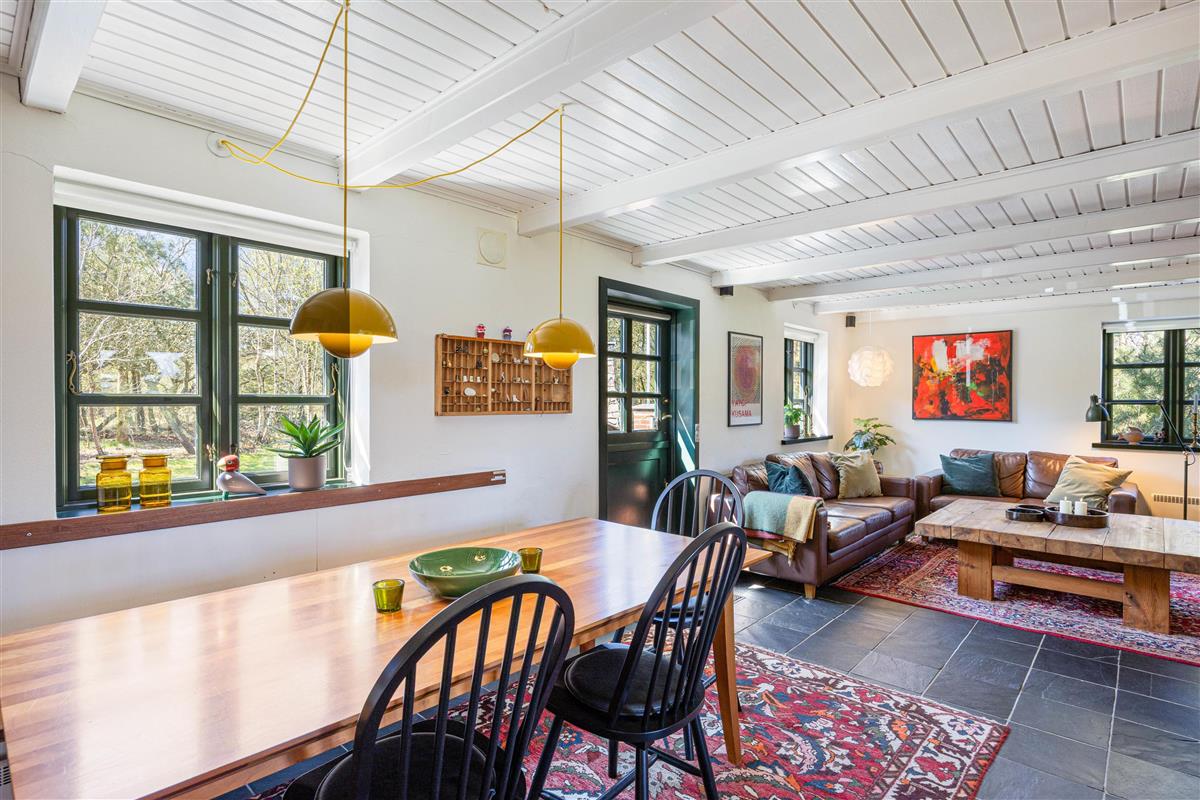 The living area has been designed as an open-plan space connecting to the kitchen and dining area. The warmth from the wood-burning stove distributes effectively across multiple areas. An energy-efficient air-to-air heat pump ensures a pleasant indoor climate.