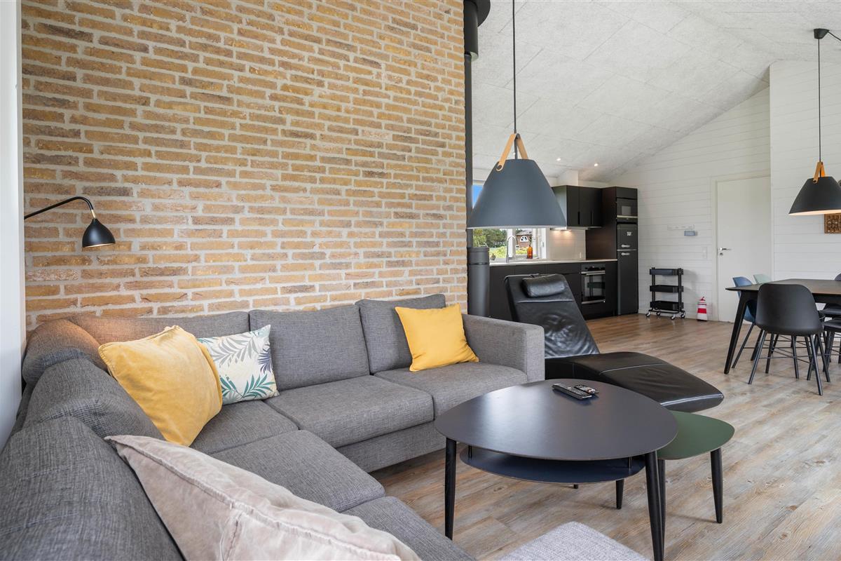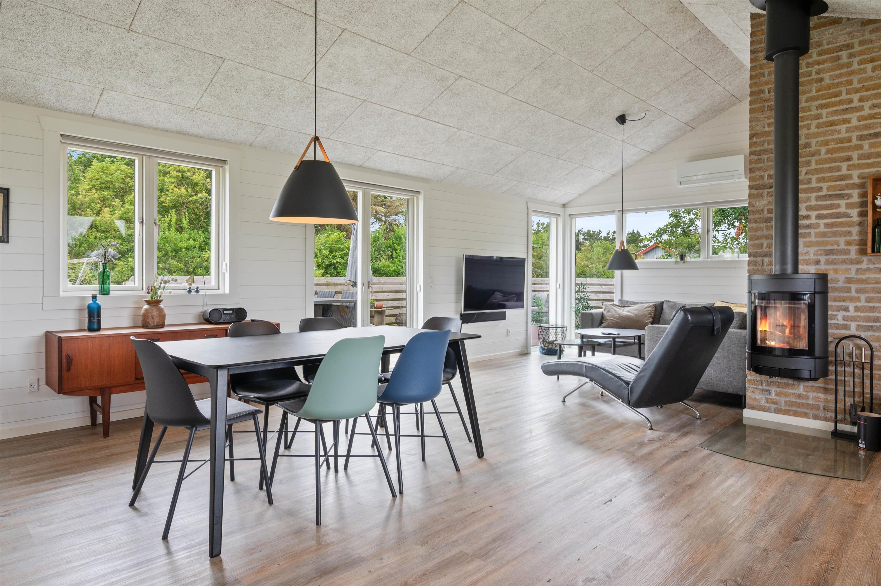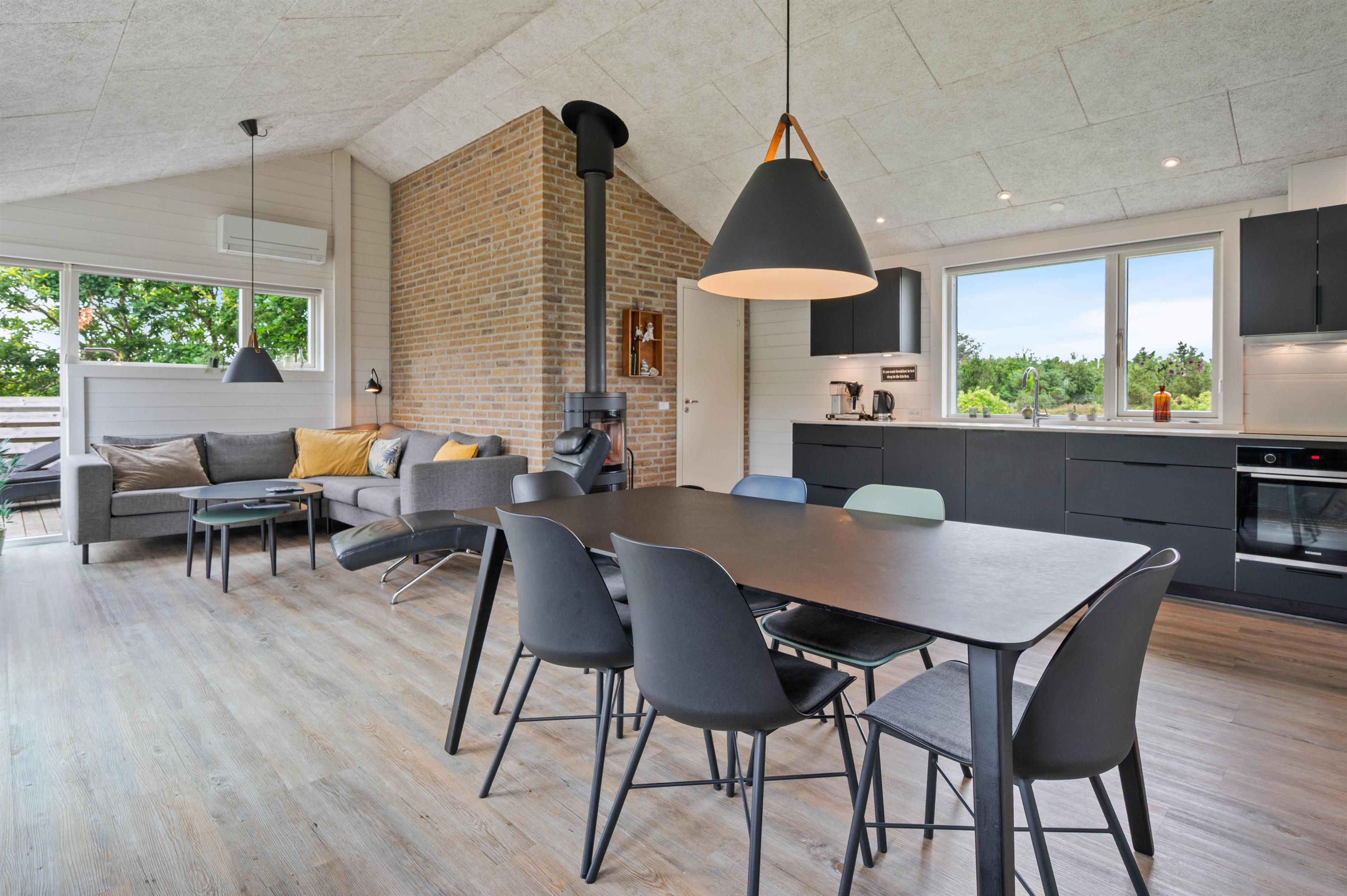The bright, open-plan layout features a large kitchen-living area at the heart of the house - perfect for family gatherings. The well-equipped kitchen offers everything holiday cooks need, including a dishwasher, naturally. There's also an additional freezer. The wood-burning stove provides warmth during the cooler months, creating a cosy atmosphere.