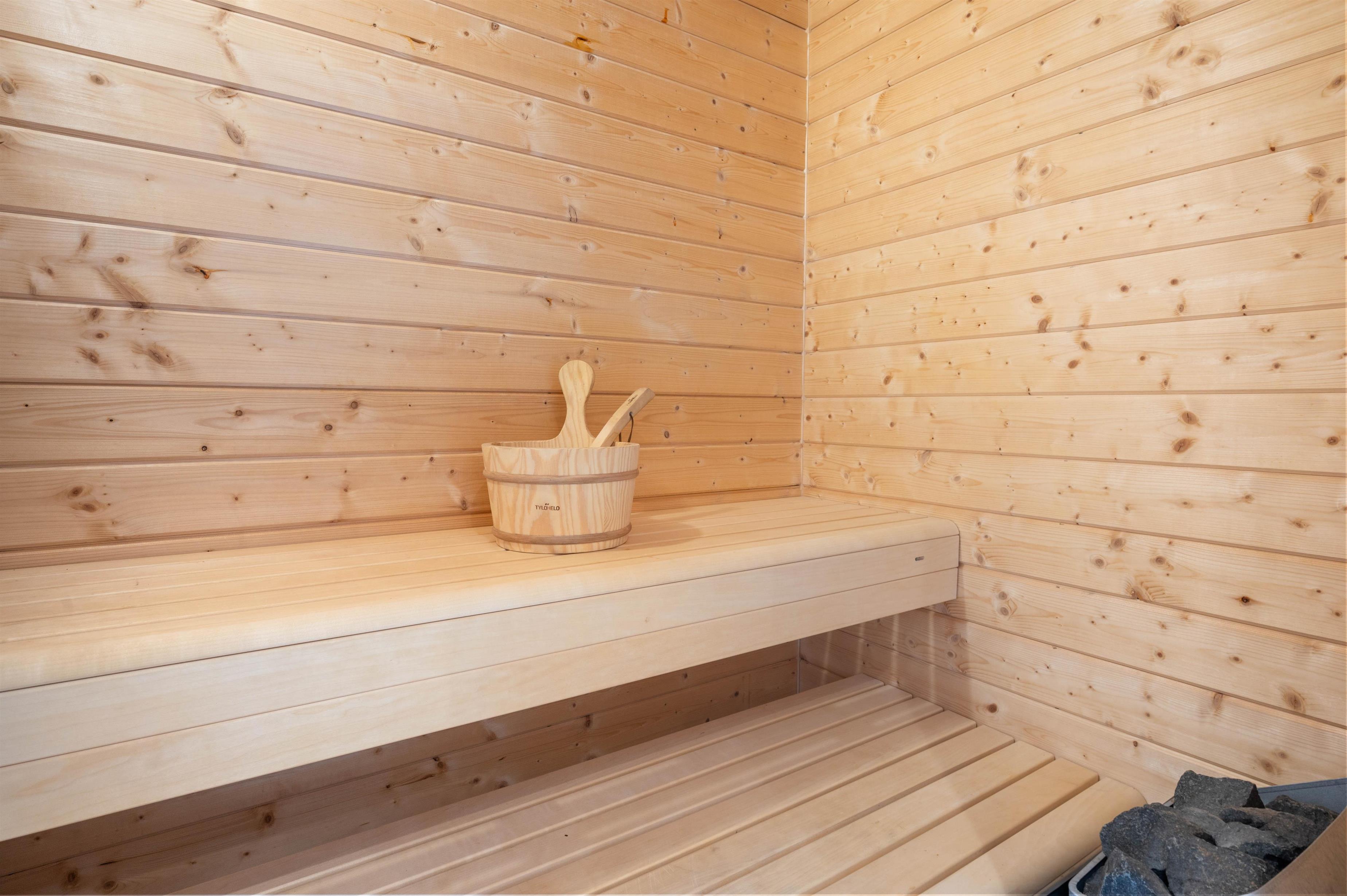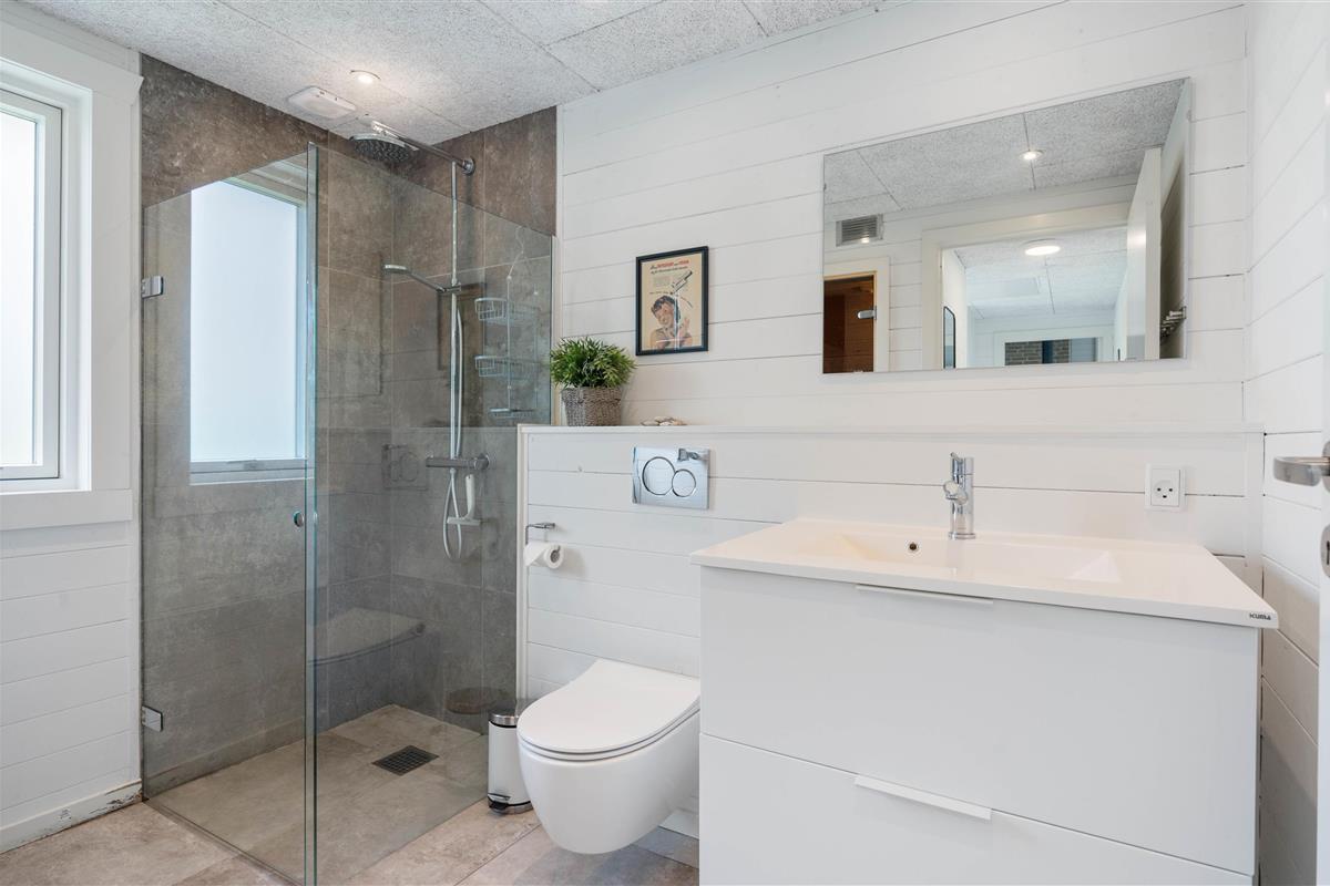 The bathroom offers an additional wellness feature with access to the house's private sauna. What could be more relaxing than unwinding in the soothing warmth after an invigorating walk by the water or in the dunes?