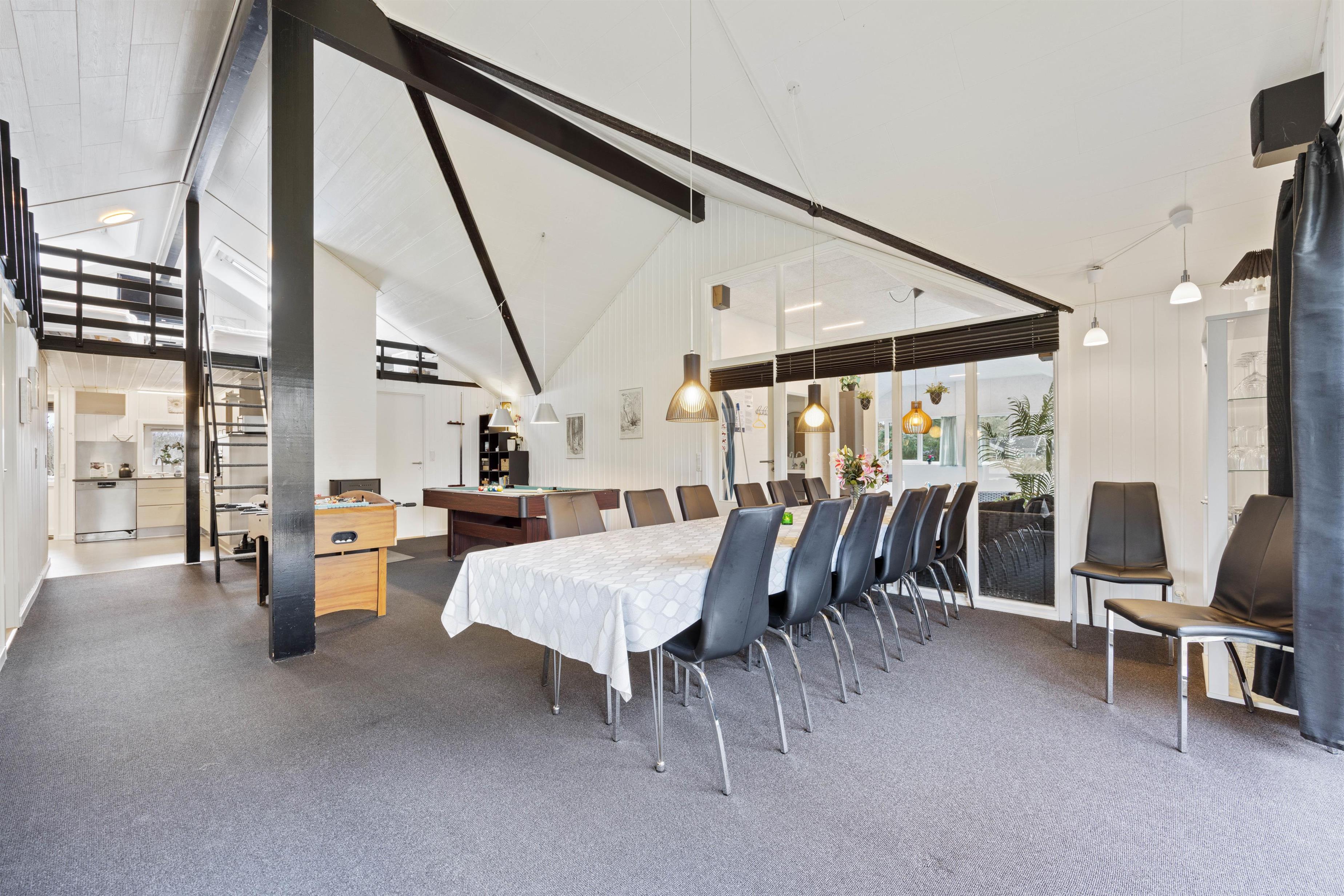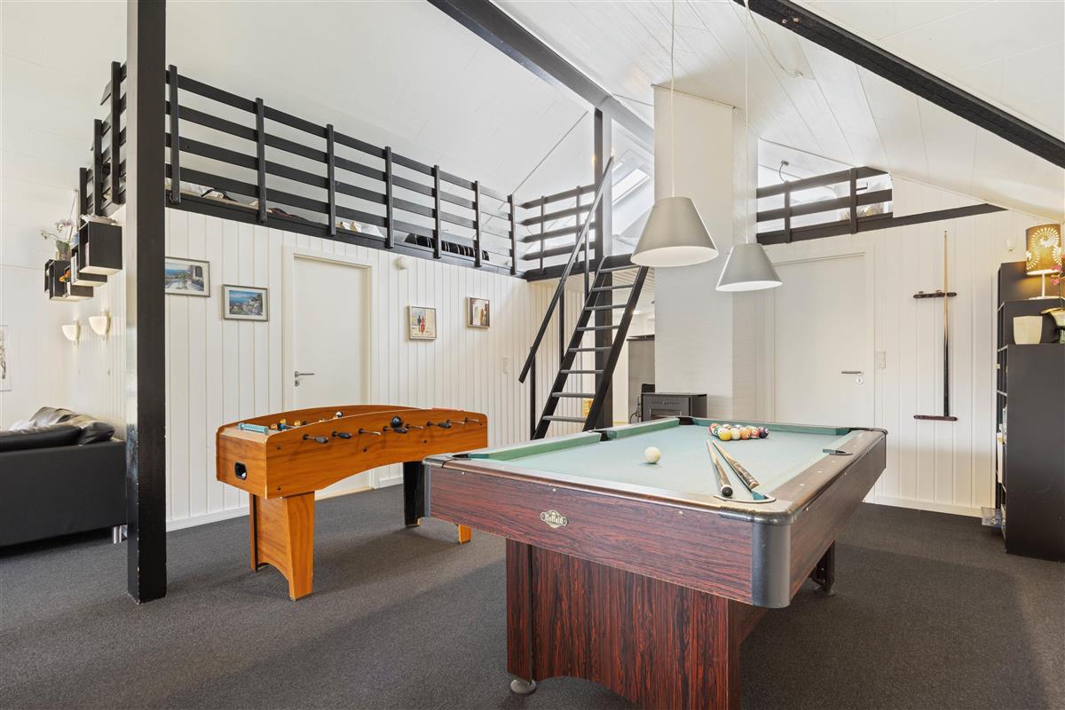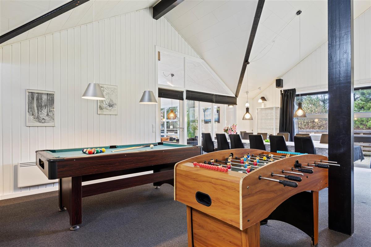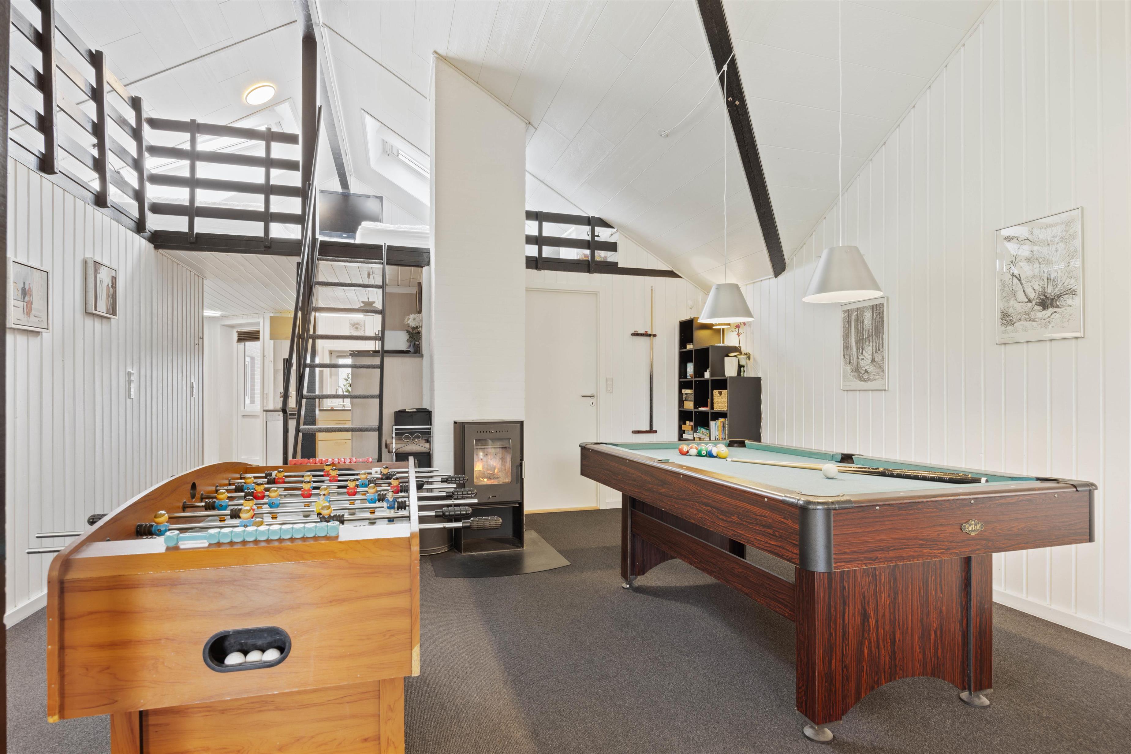 Upon entering the holiday home, you're welcomed by a large open-plan space connecting the kitchen, living room, dining area and games room. Here you can cook together, plan your holiday activities or watch a film as a group. On rainy days, the house offers plenty to do with a pool table and table football, ensuring you'll never be bored. Crown your pool champion while the wood-burning stove provides cosy warmth and that typical holiday home atmosphere in the background. Additionally, an energy-efficient air-to-air heat pump has been installed, distributing pleasant warmth throughout the holiday home.