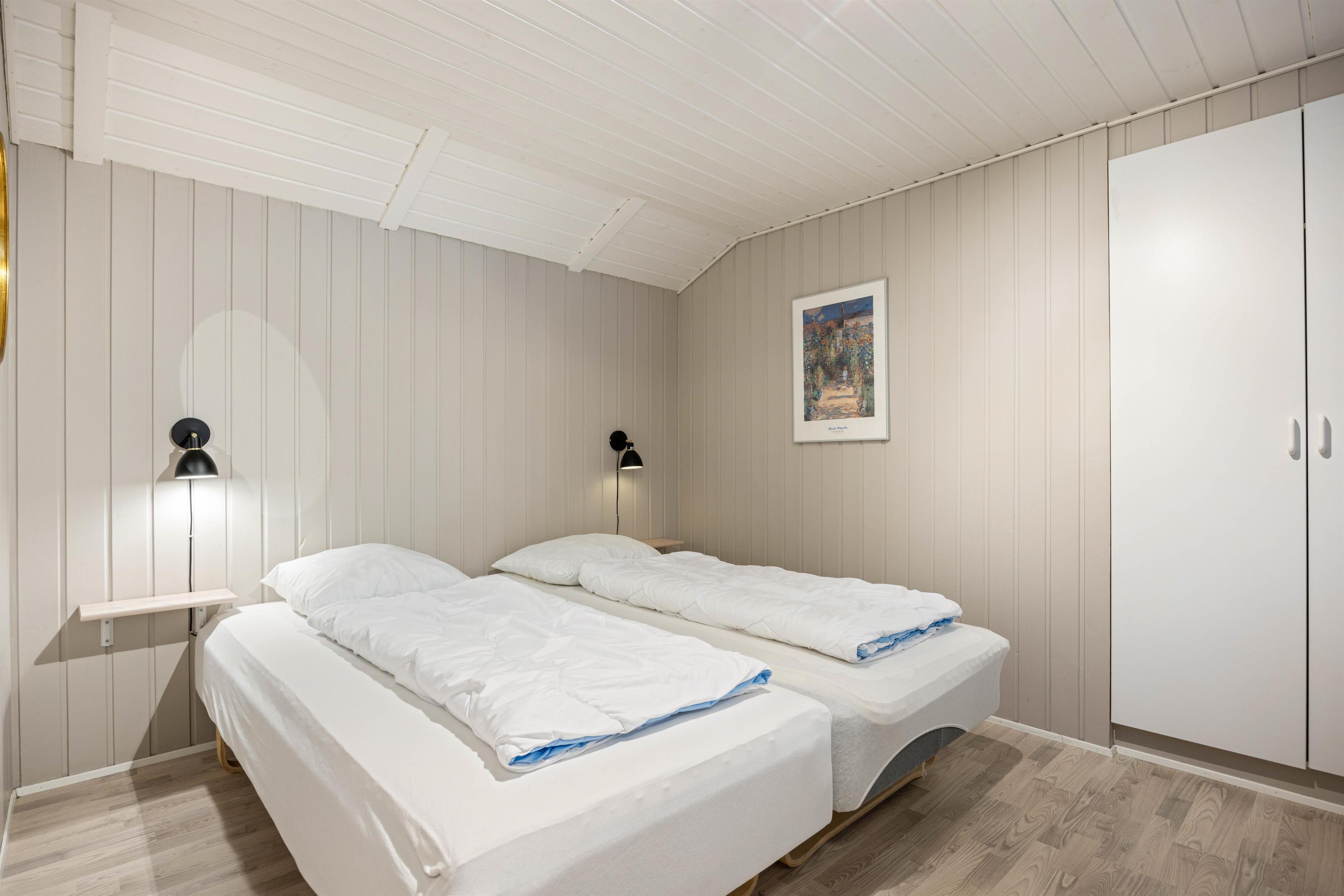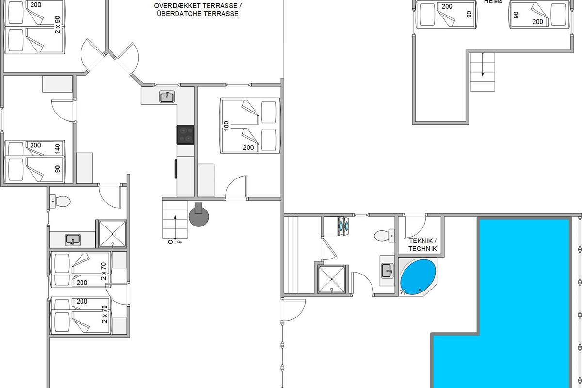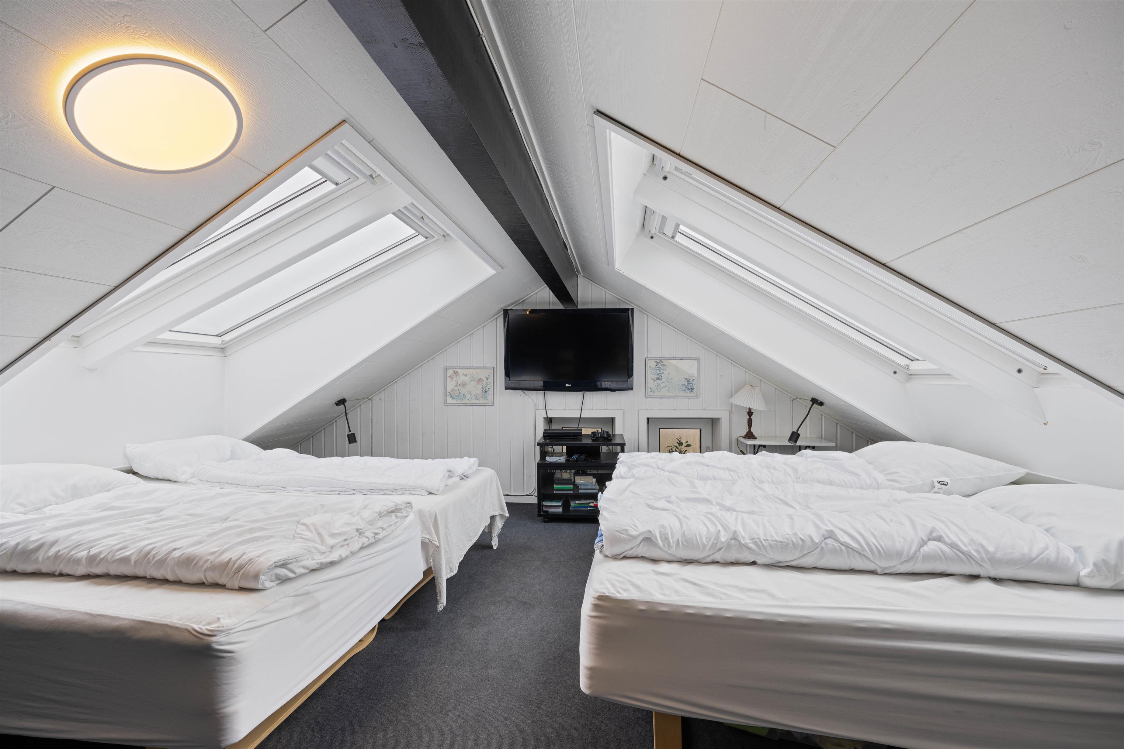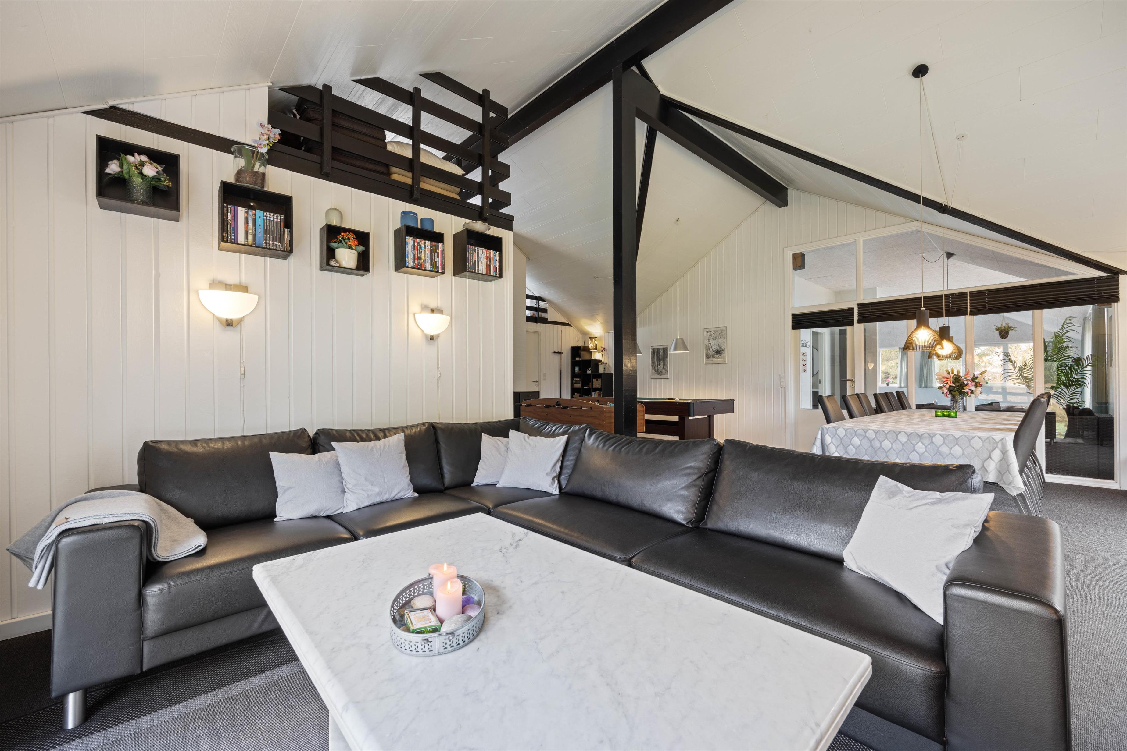 From the living area, you can access the large pool room, which will be a highlight for water enthusiasts. Those seeking escape from everyday hustle and bustle will find a hot tub and private sauna in the pool room. After a long and exciting day, you can retire to the four bedrooms and the sleeping loft. Two bedrooms each feature a double bed, while the other two have bunk beds. The sleeping loft, accessed from the games room, offers additional sleeping space and is particularly popular with children.