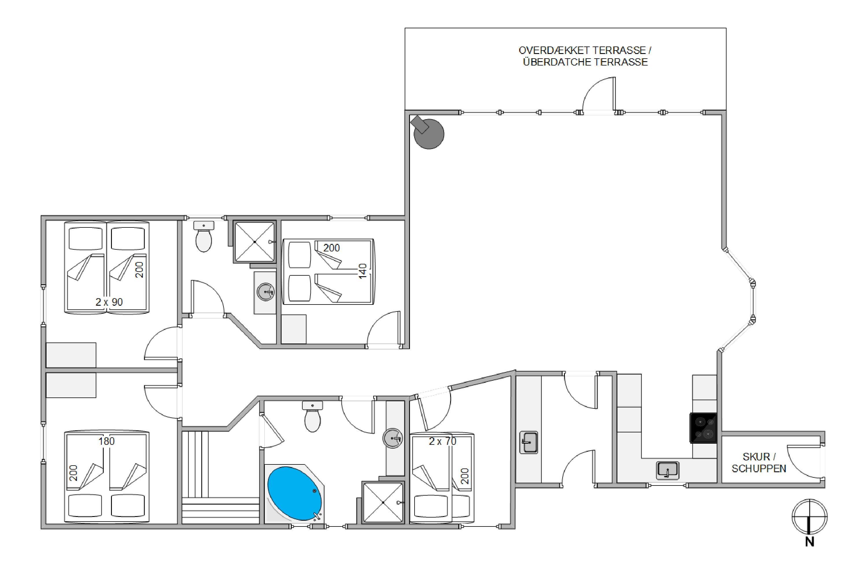 The North Sea is just 1.2 miles (2 km) away, and the town of Søndervig, with its lovely restaurants, shops and shopping facilities, is 2.5 miles (4 km) away.
