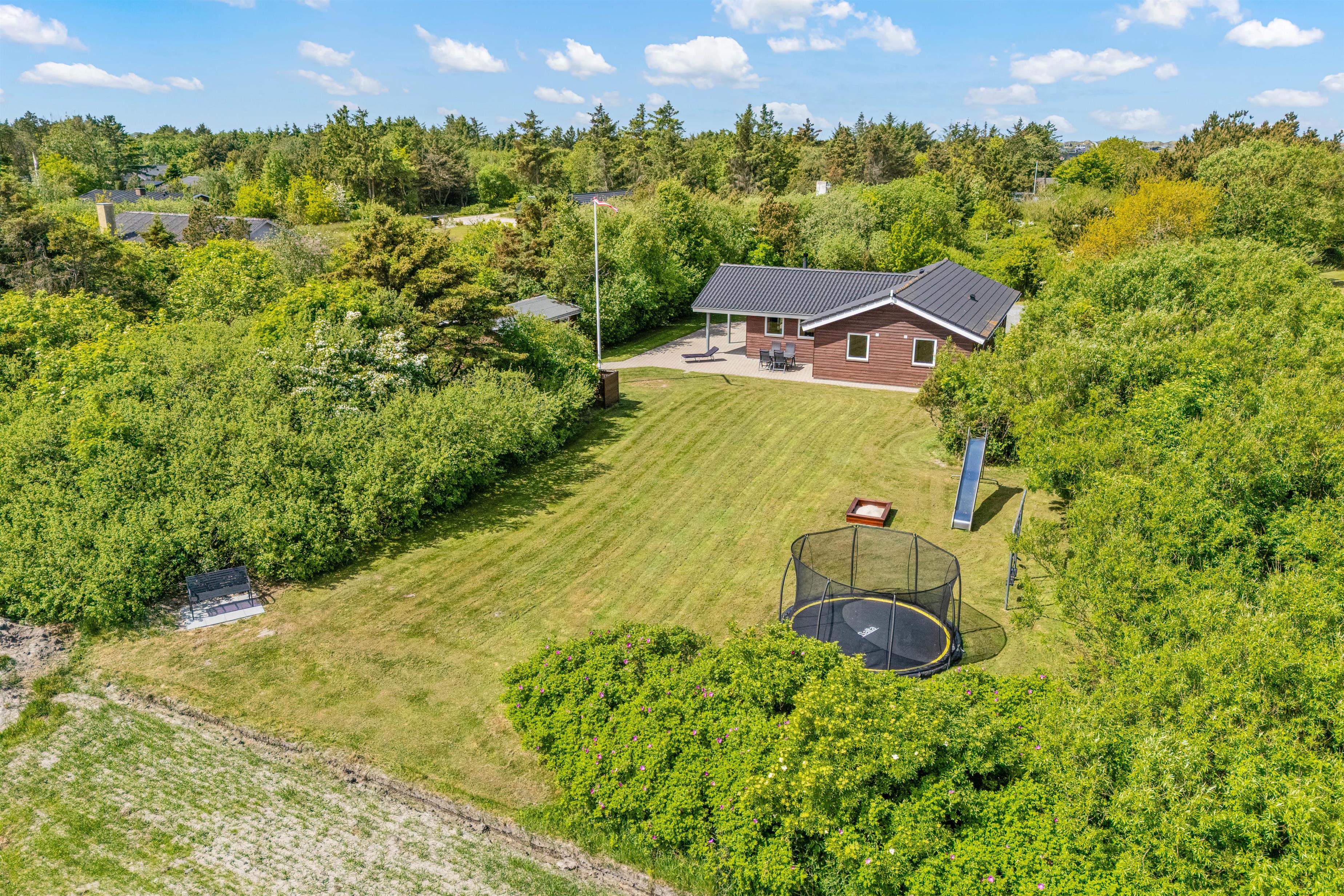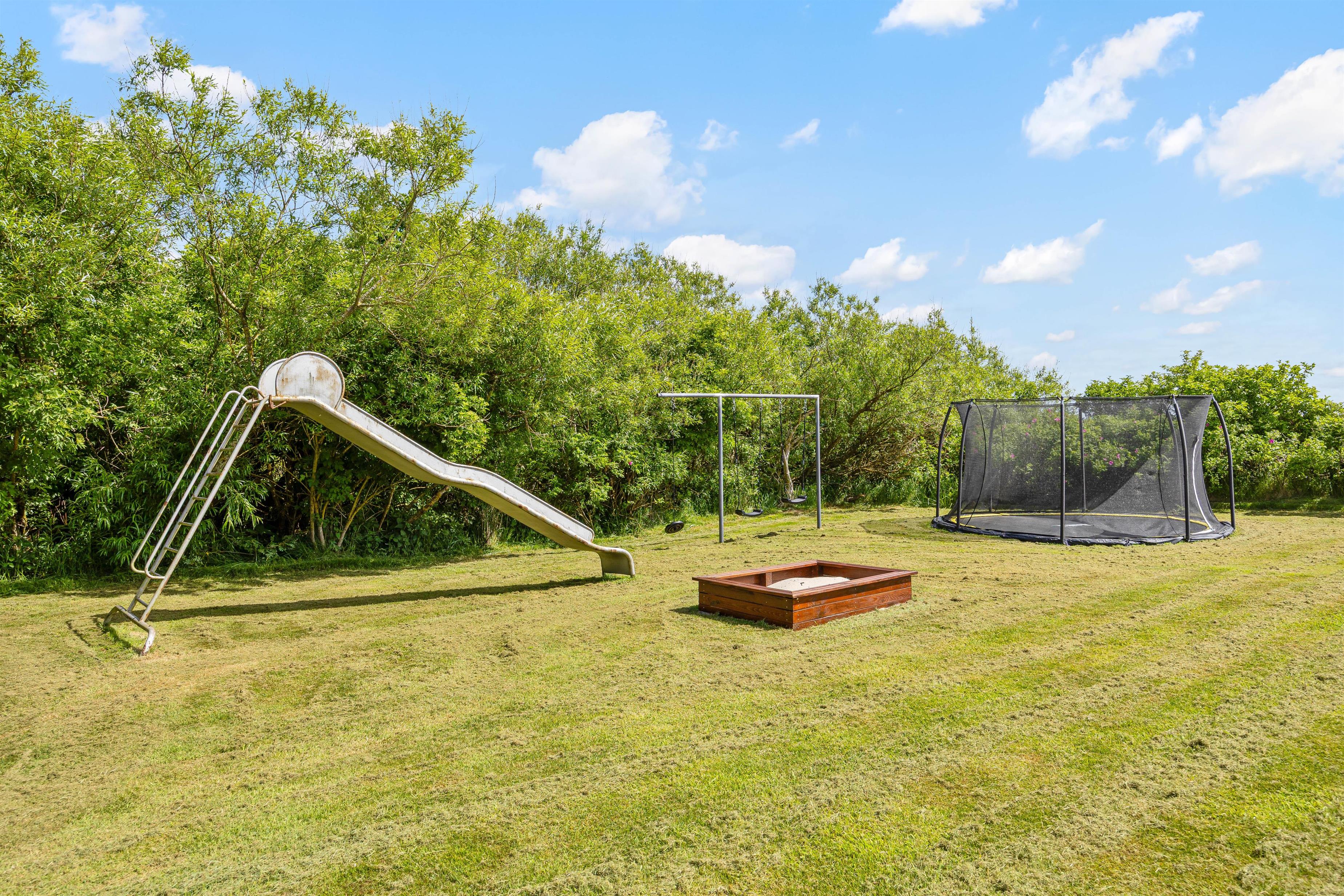 The holiday home sits on extensive grounds with a wonderful lawn area. On the terrace, you can sunbathe while watching the children enjoy the swing, trampoline and sandpit. The well-maintained lawn is perfect for a game of football.