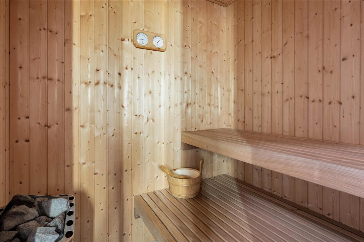 The beautiful furnishings create a homely feel, and the dedicated wellness area is perfect for relaxation while children play in the living room. The larger of the two bathrooms houses a sauna and a spacious whirlpool that accommodates up to 4 people.