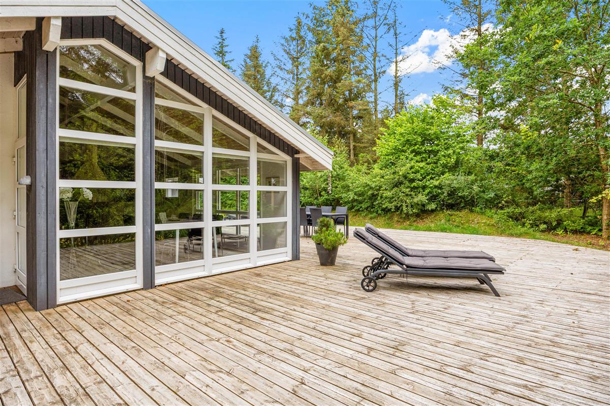 A lovely terrace wraps around the house, offering shelter from both wind and sun, making it perfect for spending quality time with family. The open terrace feels immersed in nature, surrounded by trees and bushes.