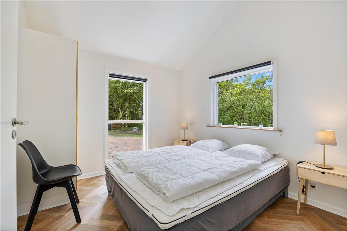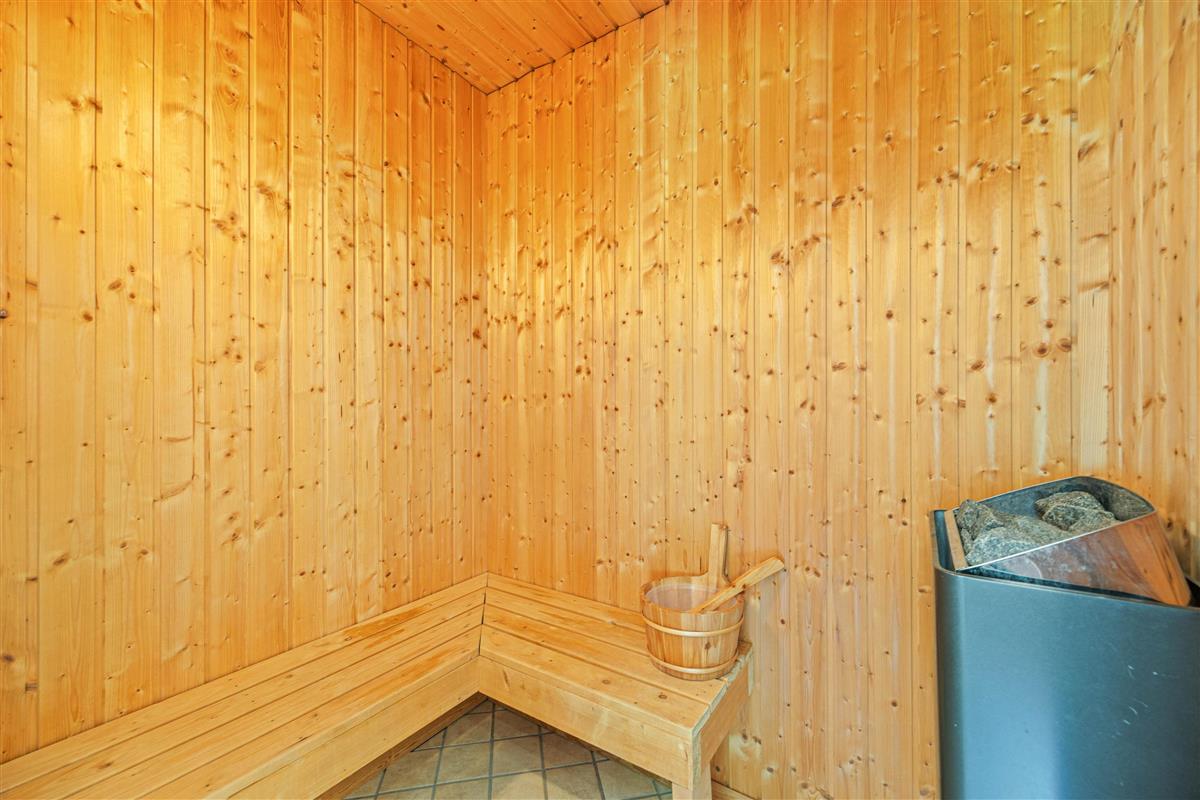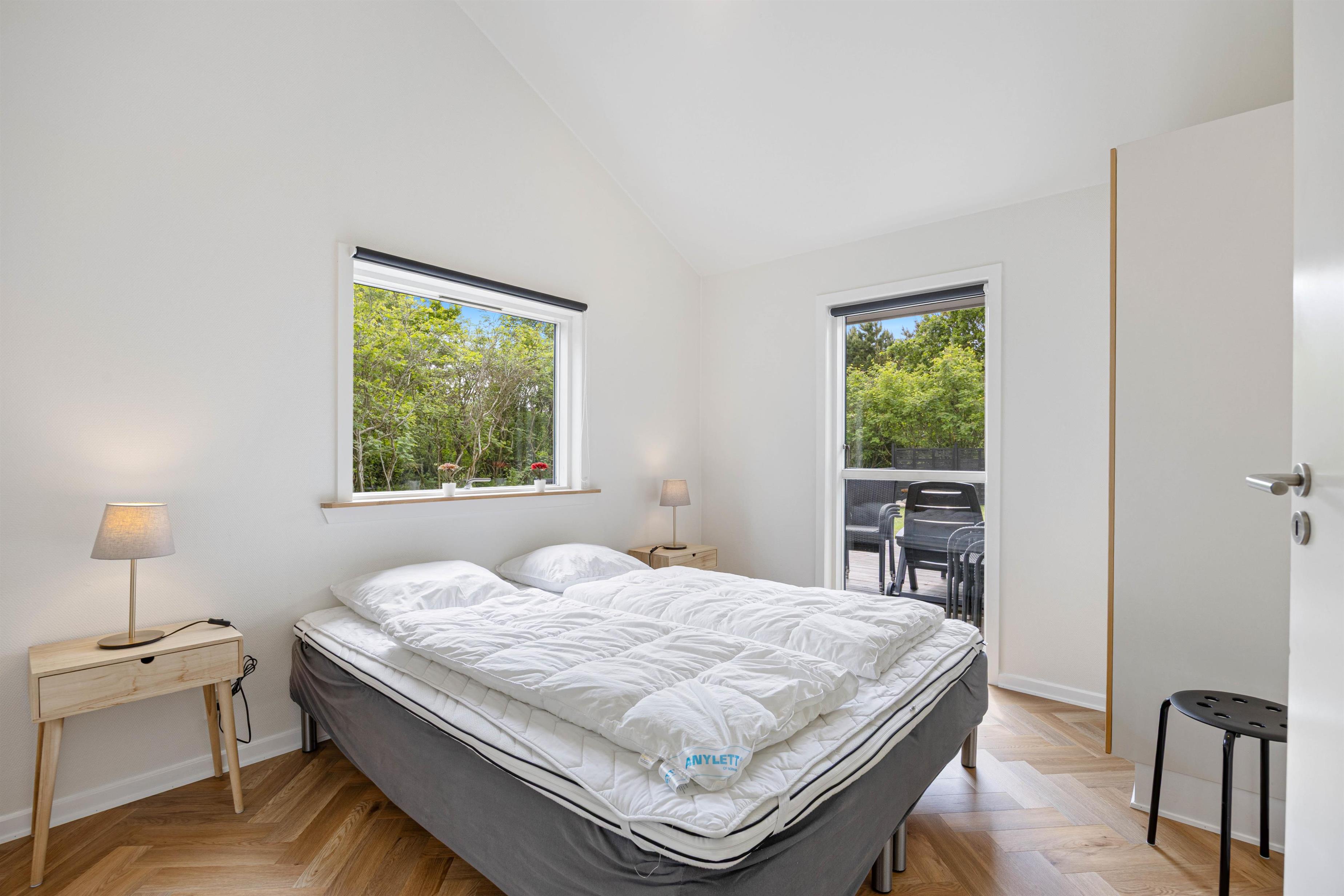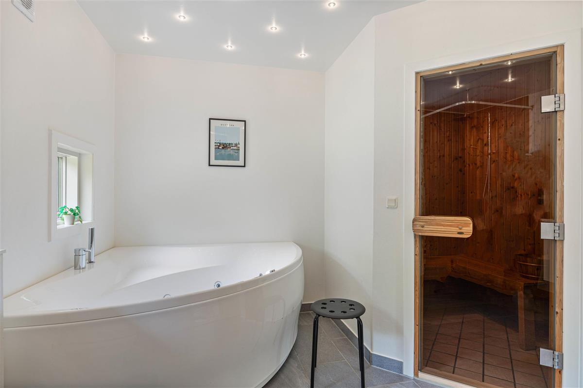 The holiday home offers four bedrooms: three with double beds and one with single beds. All four bedrooms have direct access to the terrace. Both bathrooms feature underfloor heating for a warm start to your day. One bathroom includes the sauna and whirlpool, where you can enjoy your own spa experience whenever you need to recharge.
