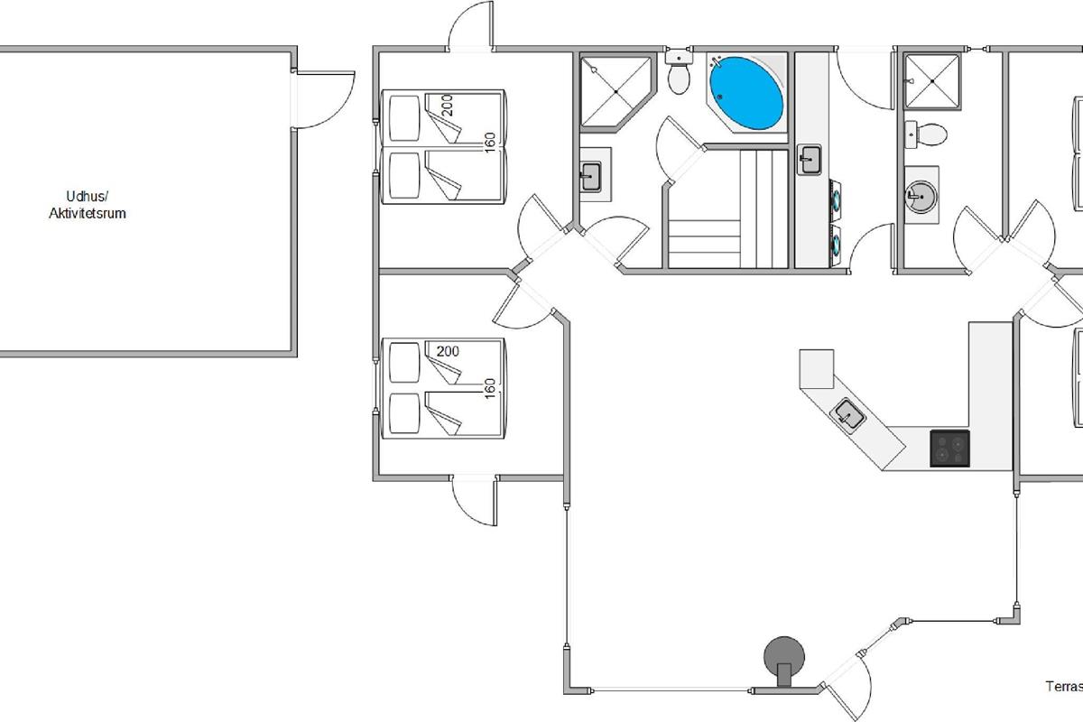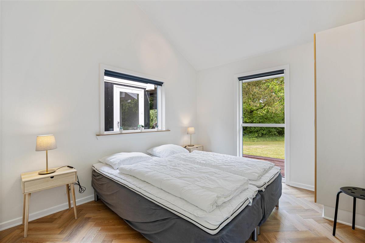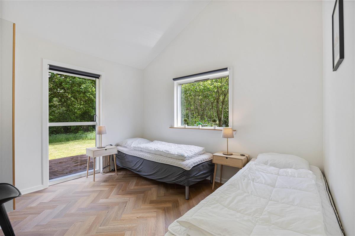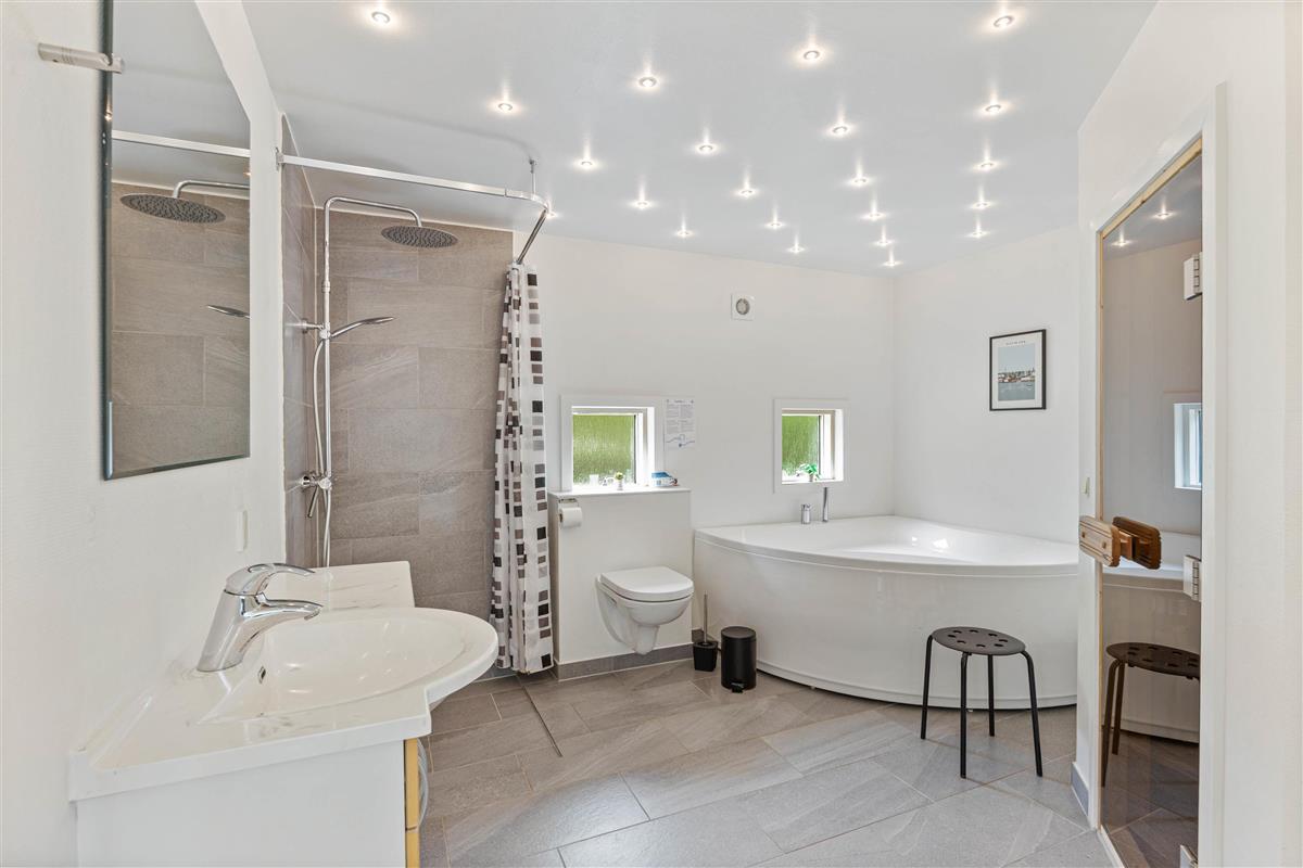 The holiday home offers four bedrooms: three with double beds and one with single beds. All four bedrooms have direct access to the terrace. Both bathrooms feature underfloor heating for a warm start to your day. One bathroom includes the sauna and whirlpool, where you can enjoy your own spa experience whenever you need to recharge.