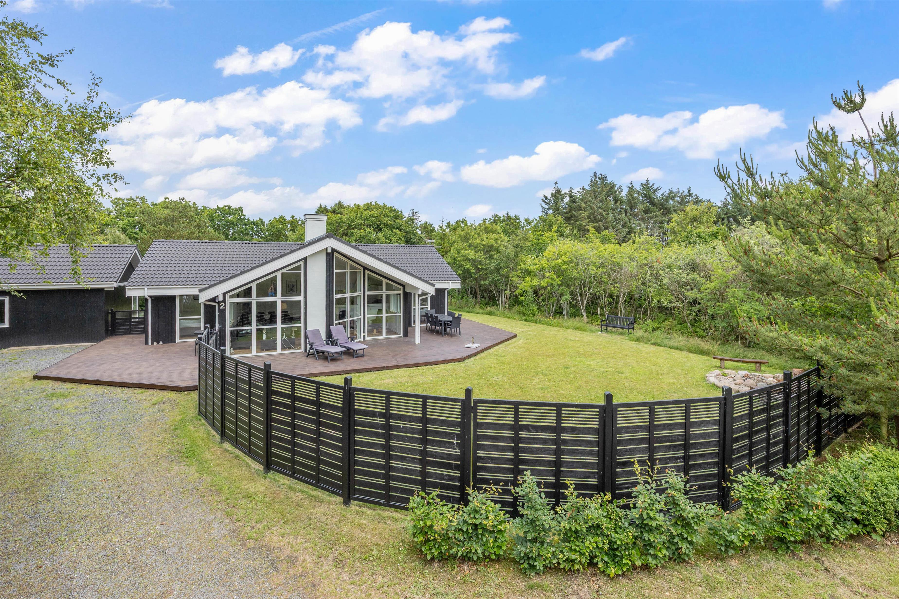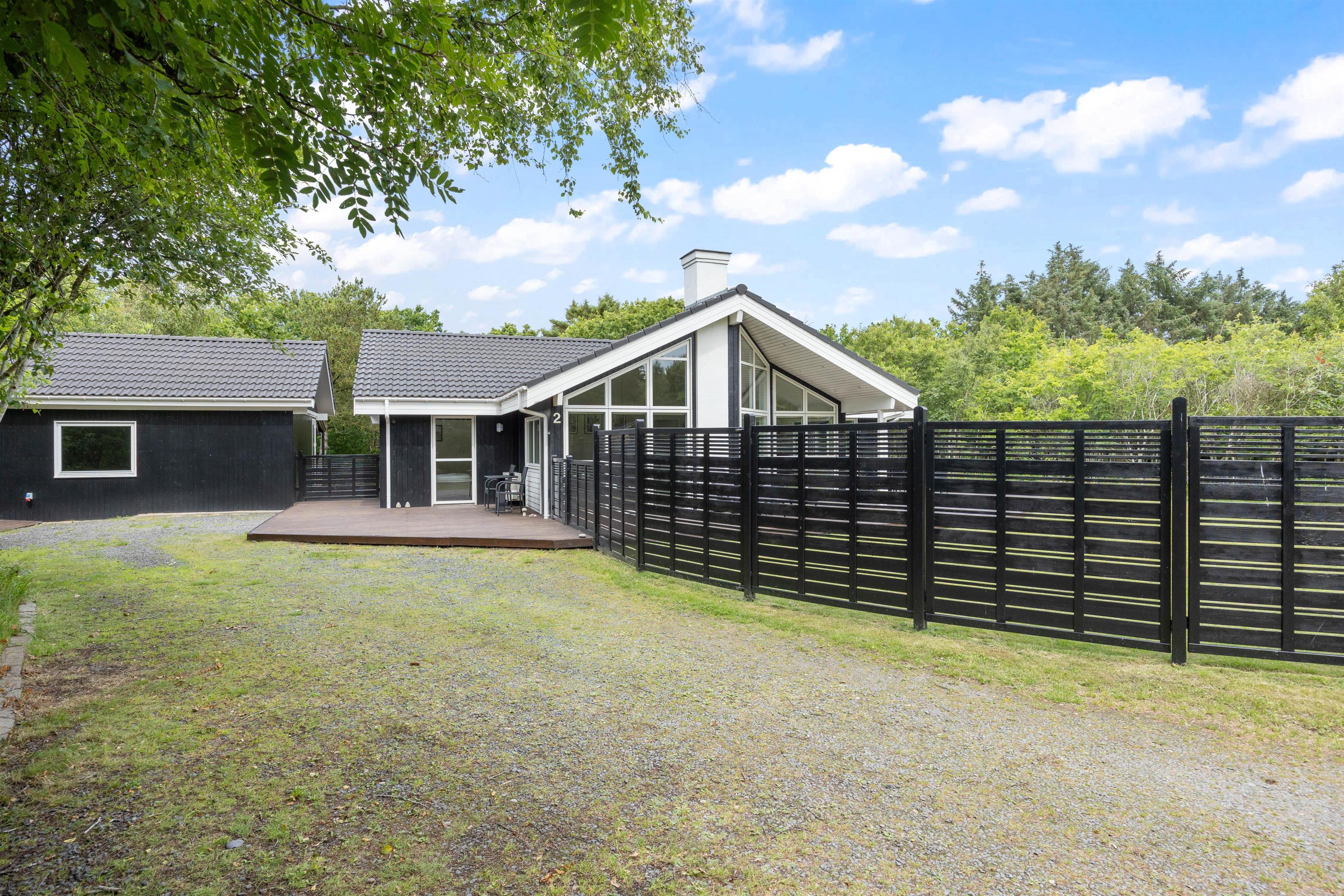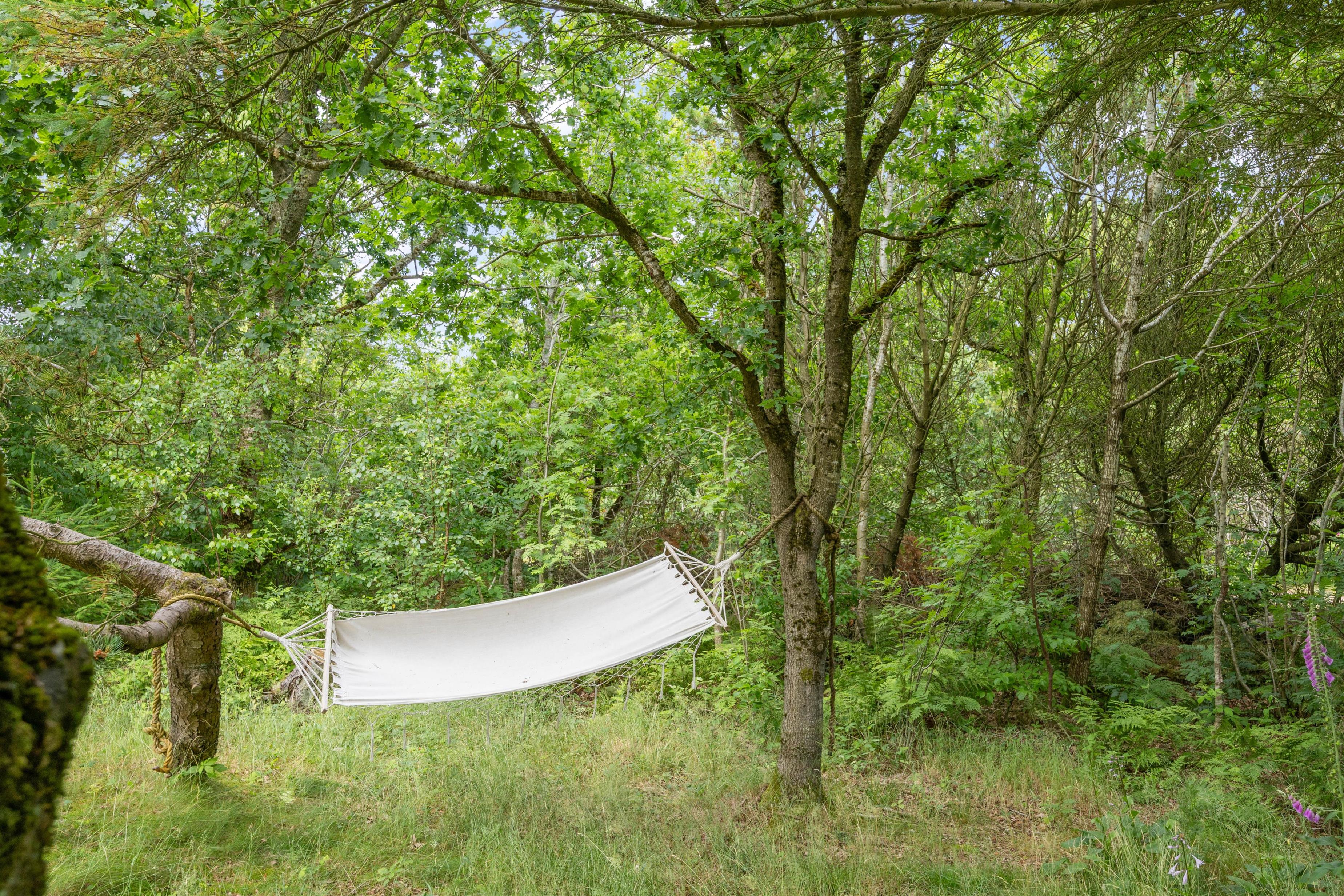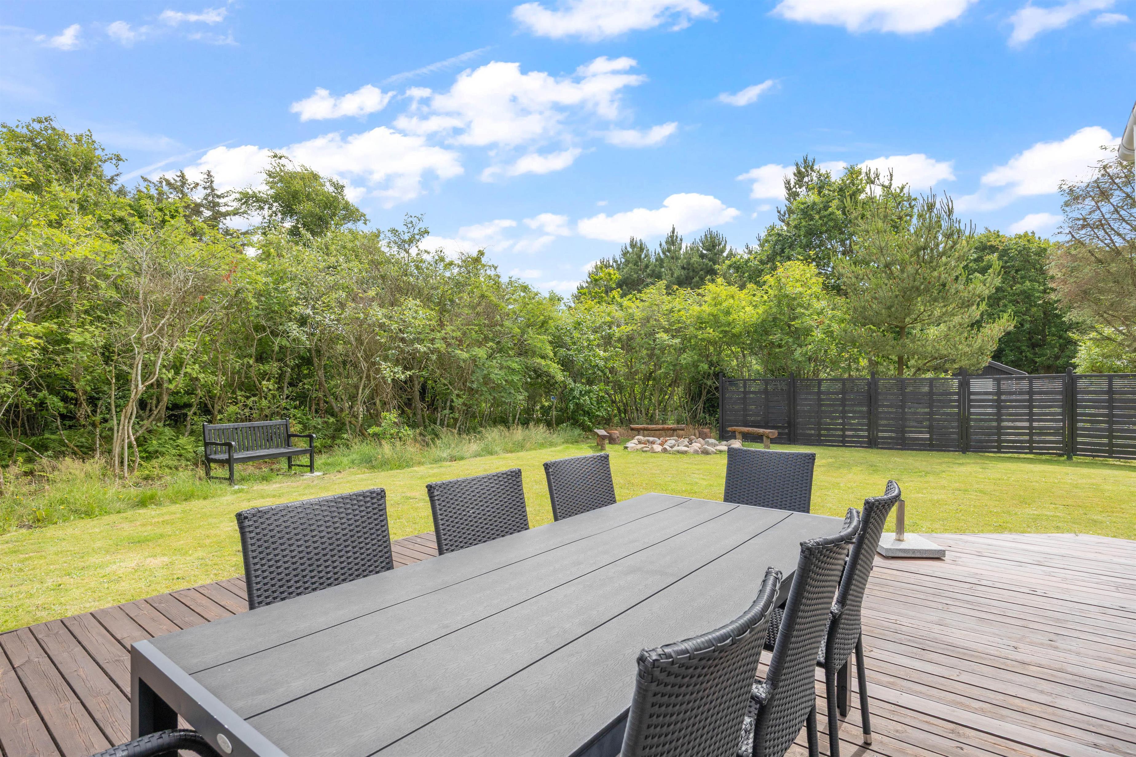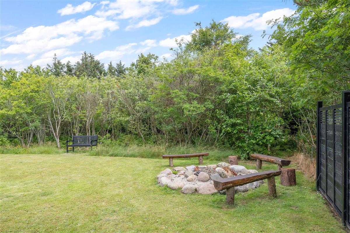 The holiday home sits on a fenced plot of over 2,200 square metres, surrounded by trees and dense shrubbery, ensuring complete privacy. Your dog can freely explore the garden, though please note the fence may not be secure for small dogs. There's also a fire pit where you can gather in the warm evening sun to enjoy a campfire experience.