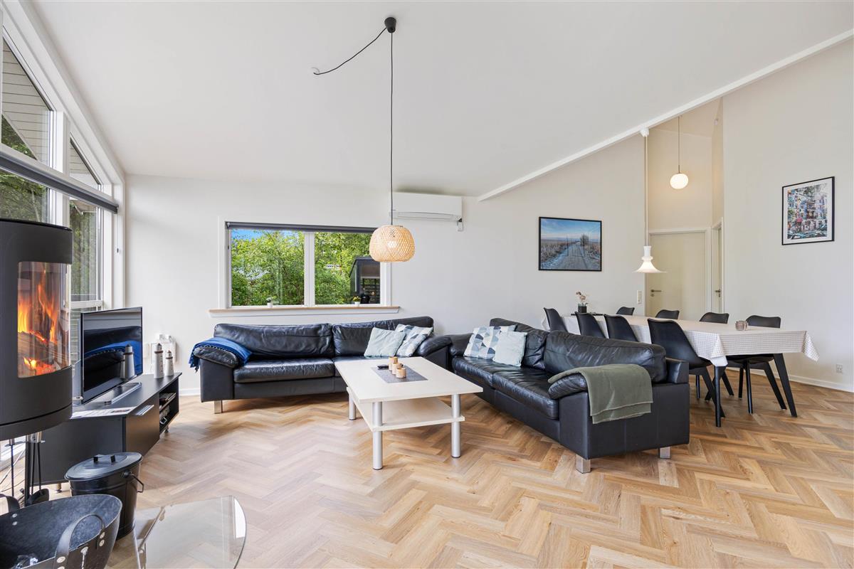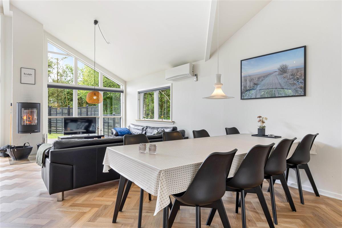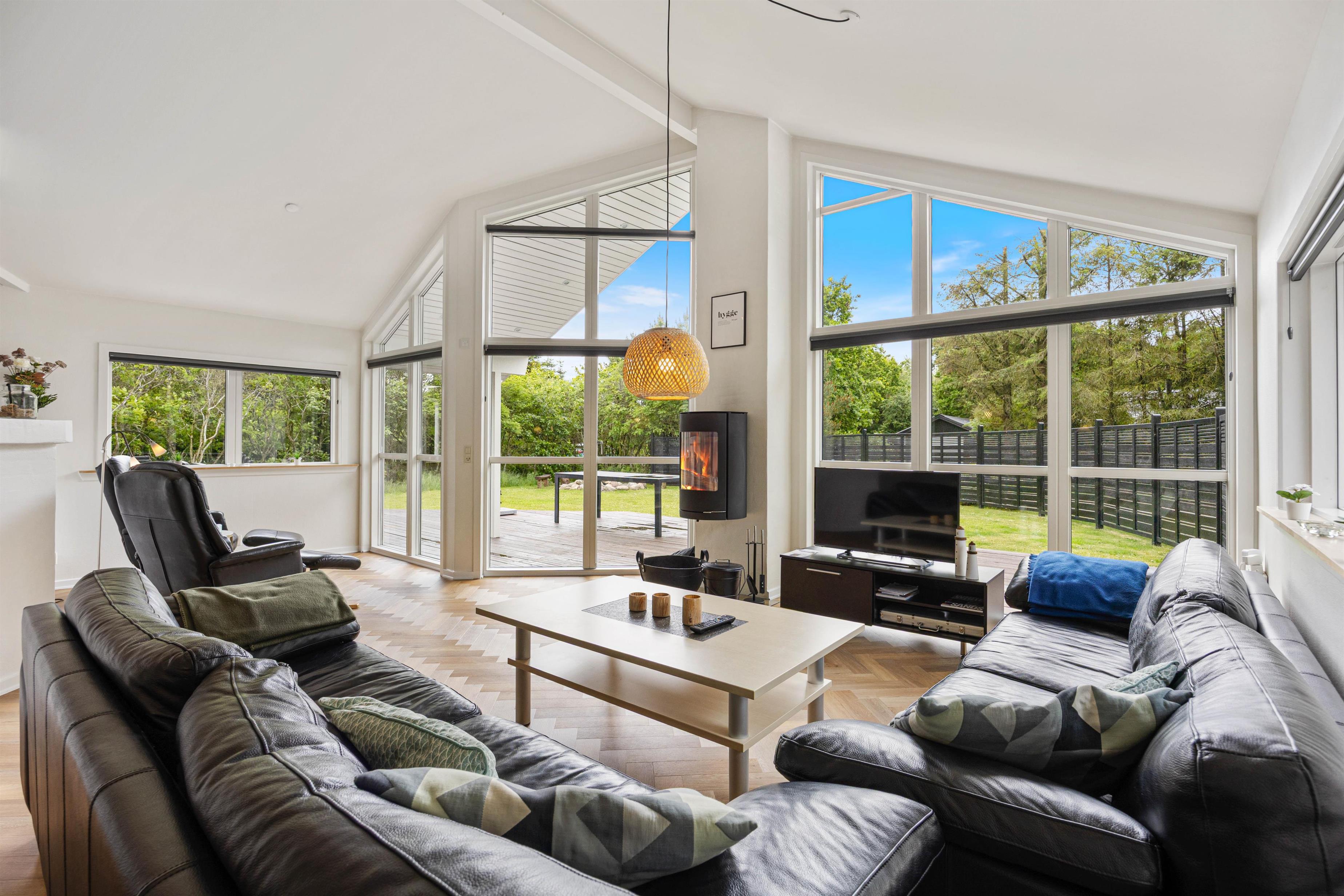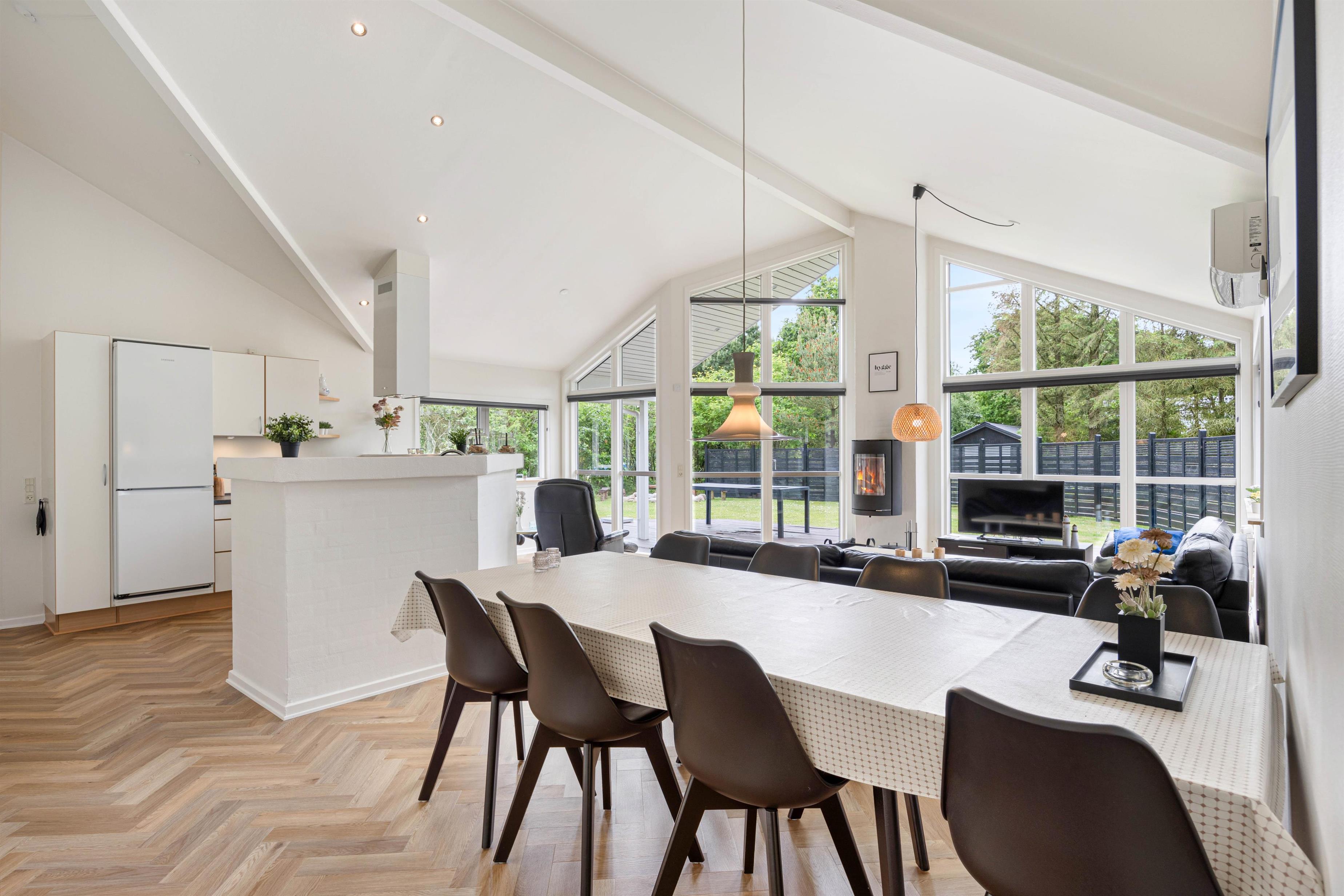 With 140 square metres of living space, there's plenty of room to spread out. The open-plan living and dining area allows the whole family to spend quality time together. The well-equipped kitchen is perfect for communal cooking, with a dishwasher to take care of the cleanup afterwards. Gather around the dining table for games or relax on the sofa and enjoy the crackling of the wood-burning stove, which adds extra cosiness, especially during the cooler months.