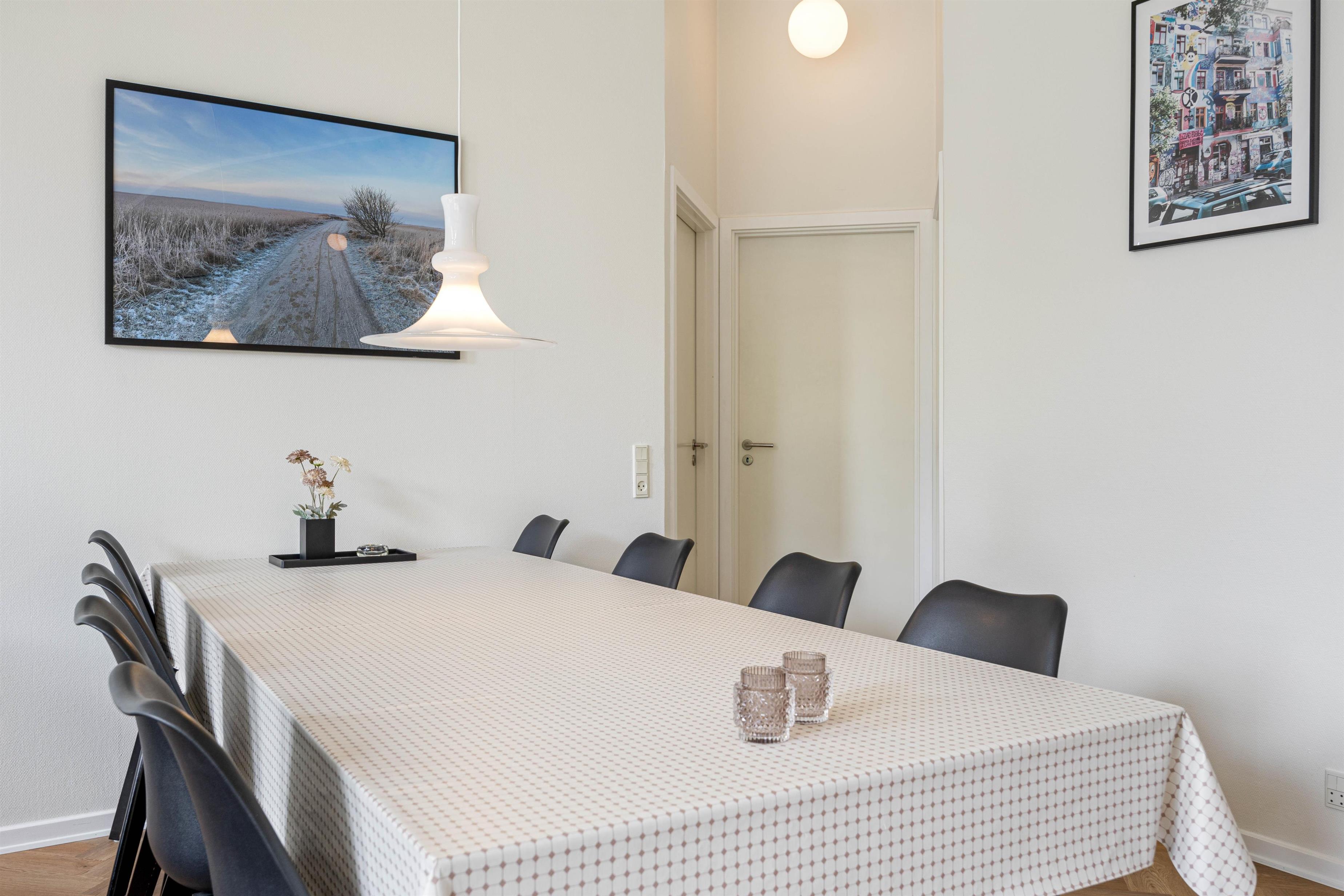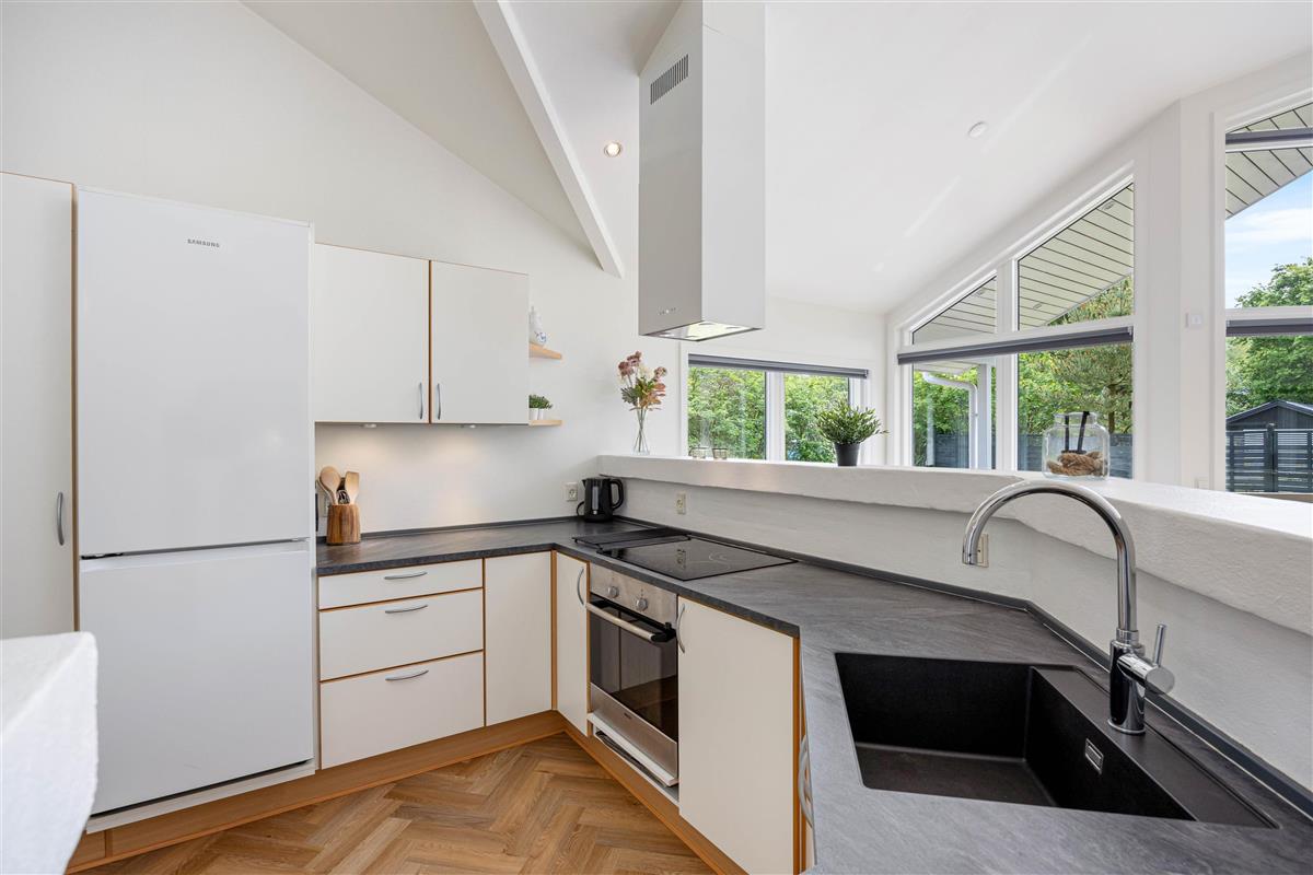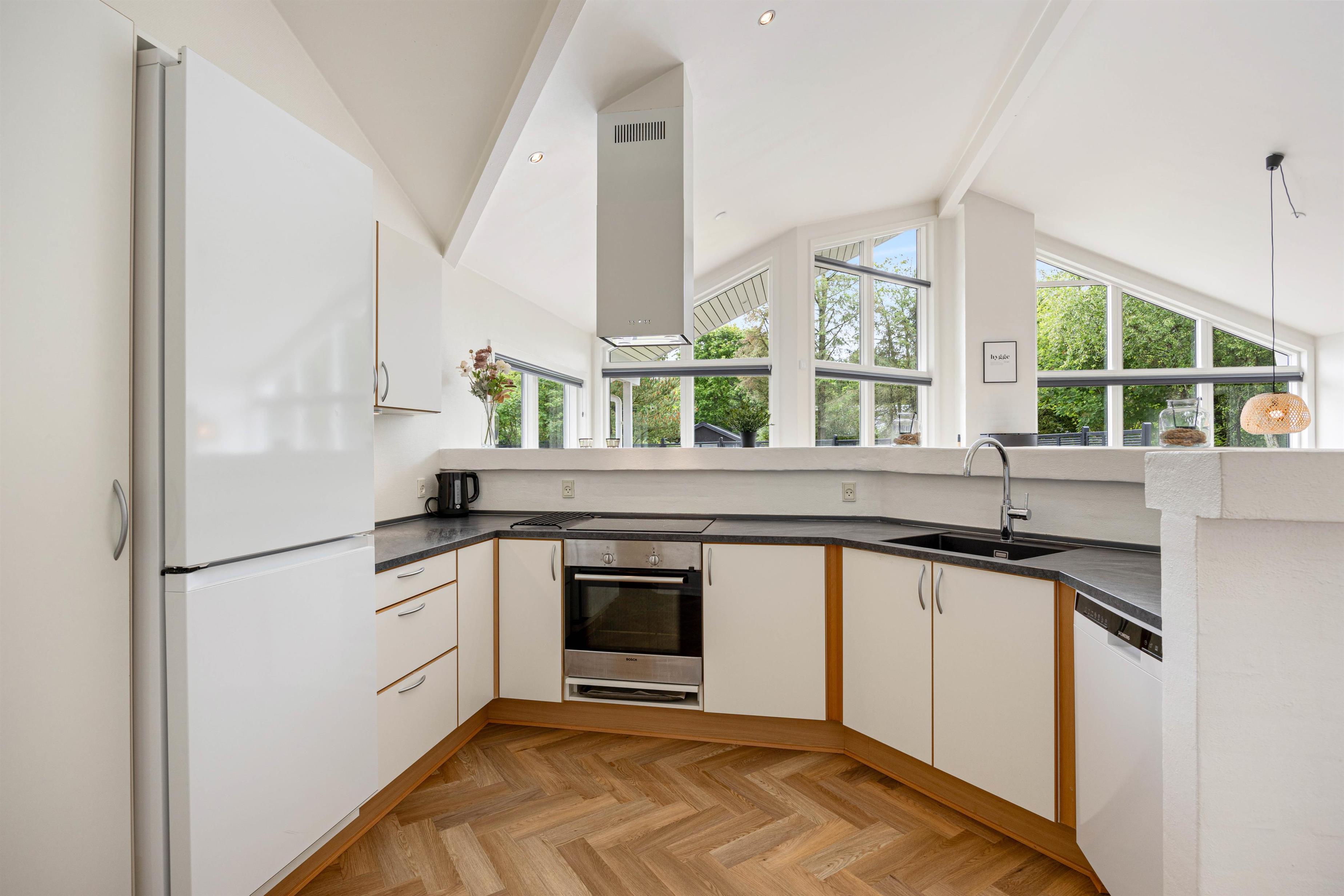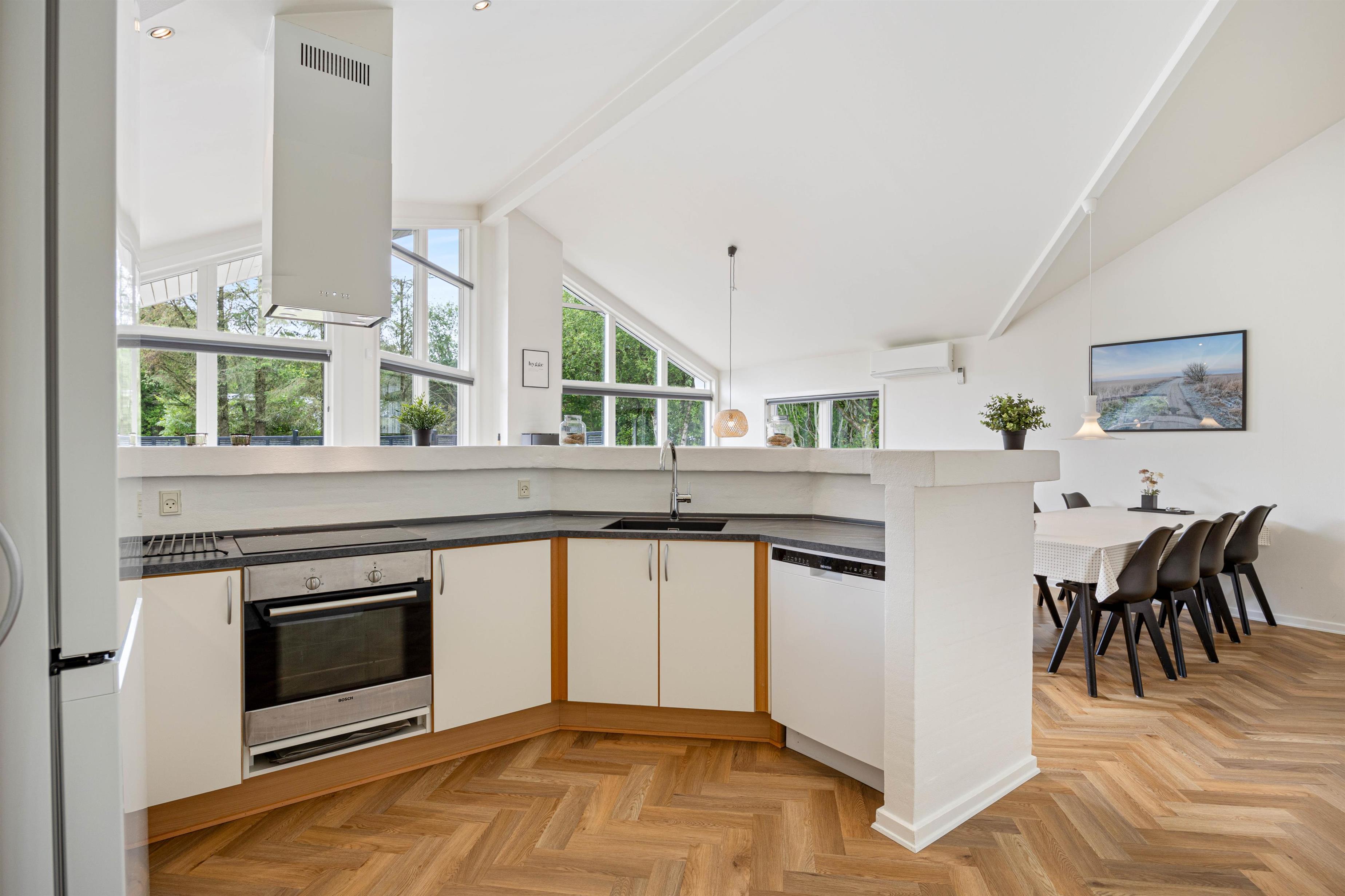 With 140 square metres of living space, there's plenty of room to spread out. The open-plan living and dining area allows the whole family to spend quality time together. The well-equipped kitchen is perfect for communal cooking, with a dishwasher to take care of the cleanup afterwards. Gather around the dining table for games or relax on the sofa and enjoy the crackling of the wood-burning stove, which adds extra cosiness, especially during the cooler months.