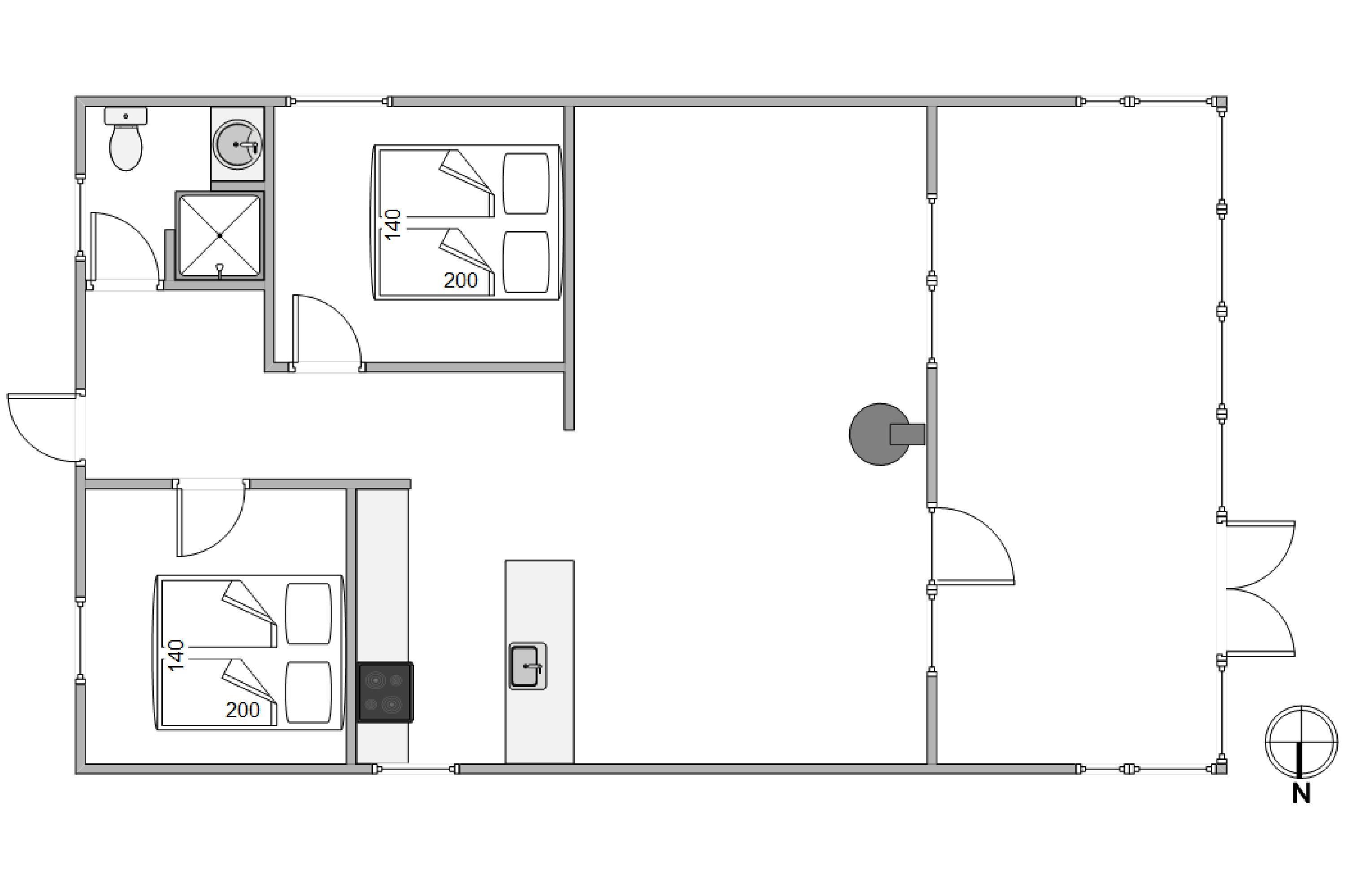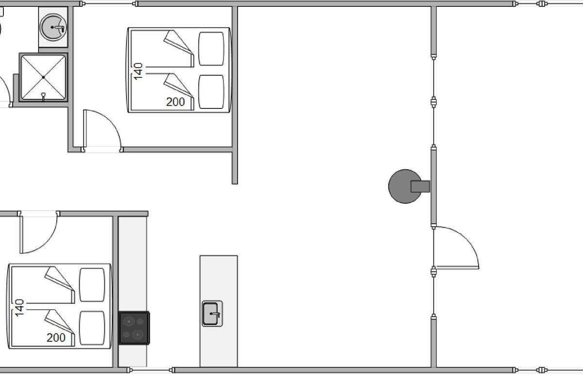 The beds are 140cm wide, and there are 2 bedrooms and 1 bathroom in total.