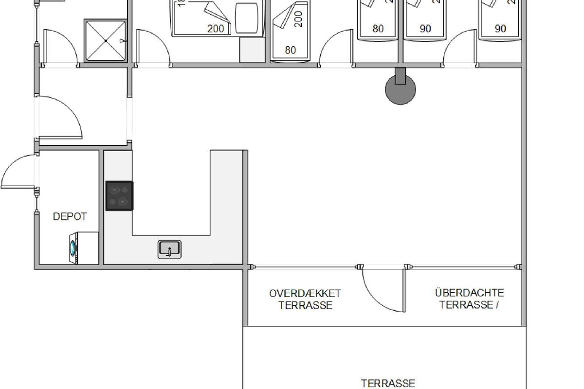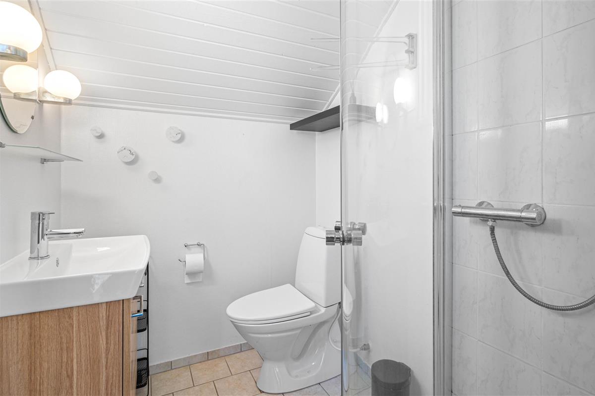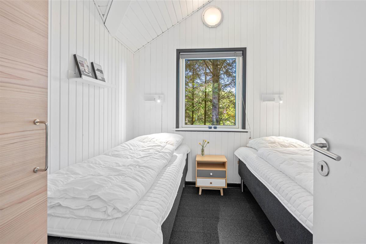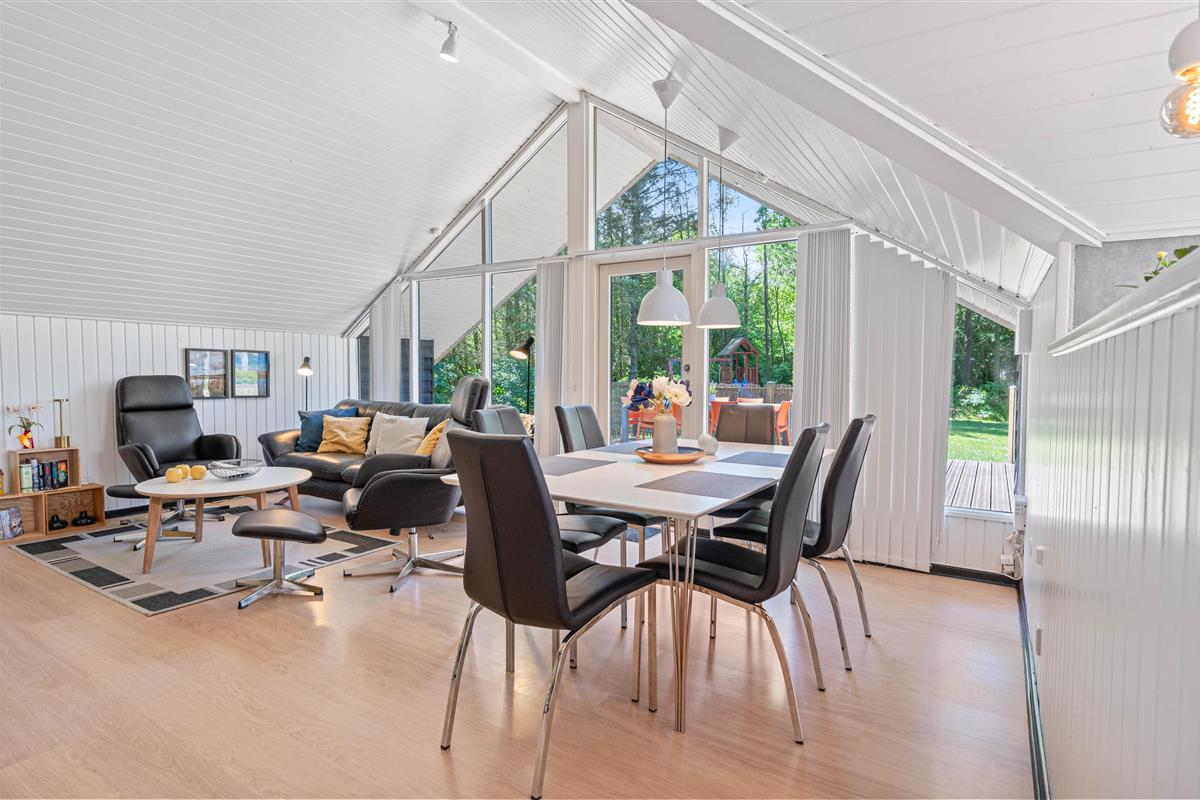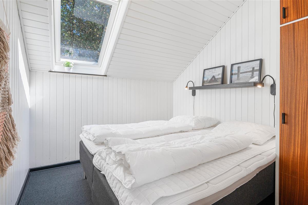 At the heart of the holiday home, you'll find the living room opening onto the kitchen, where you can enjoy many cosy holiday moments with the fireplace crackling in the background. Along with the warmth from the wood-burning stove, an efficient heat pump provides comfortable temperatures throughout.