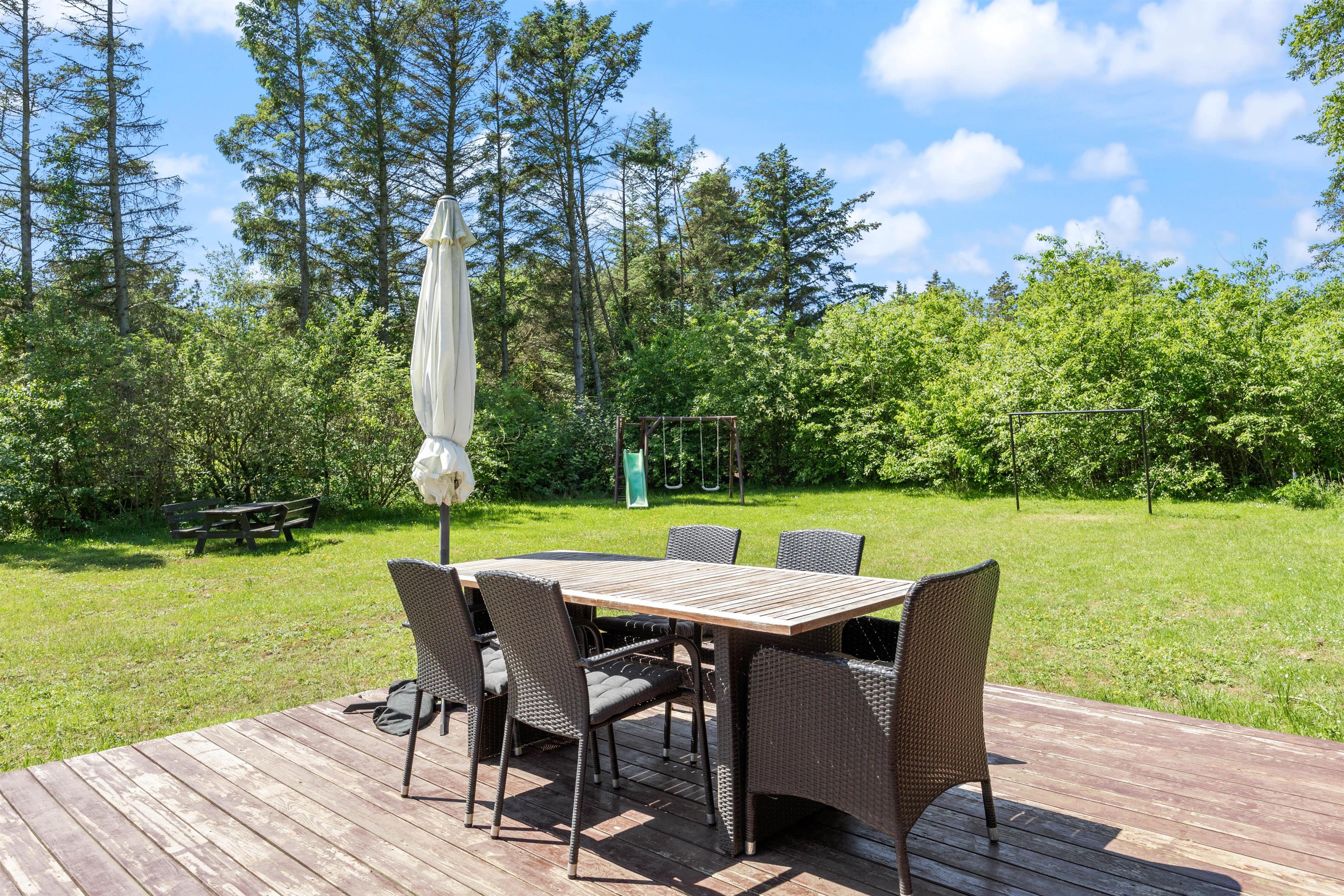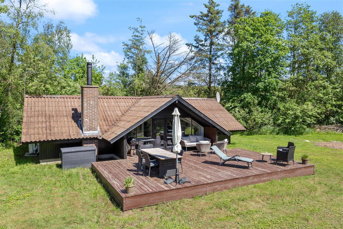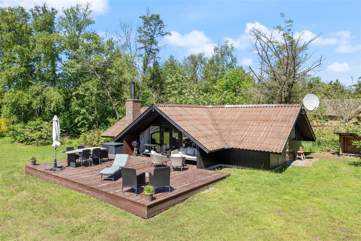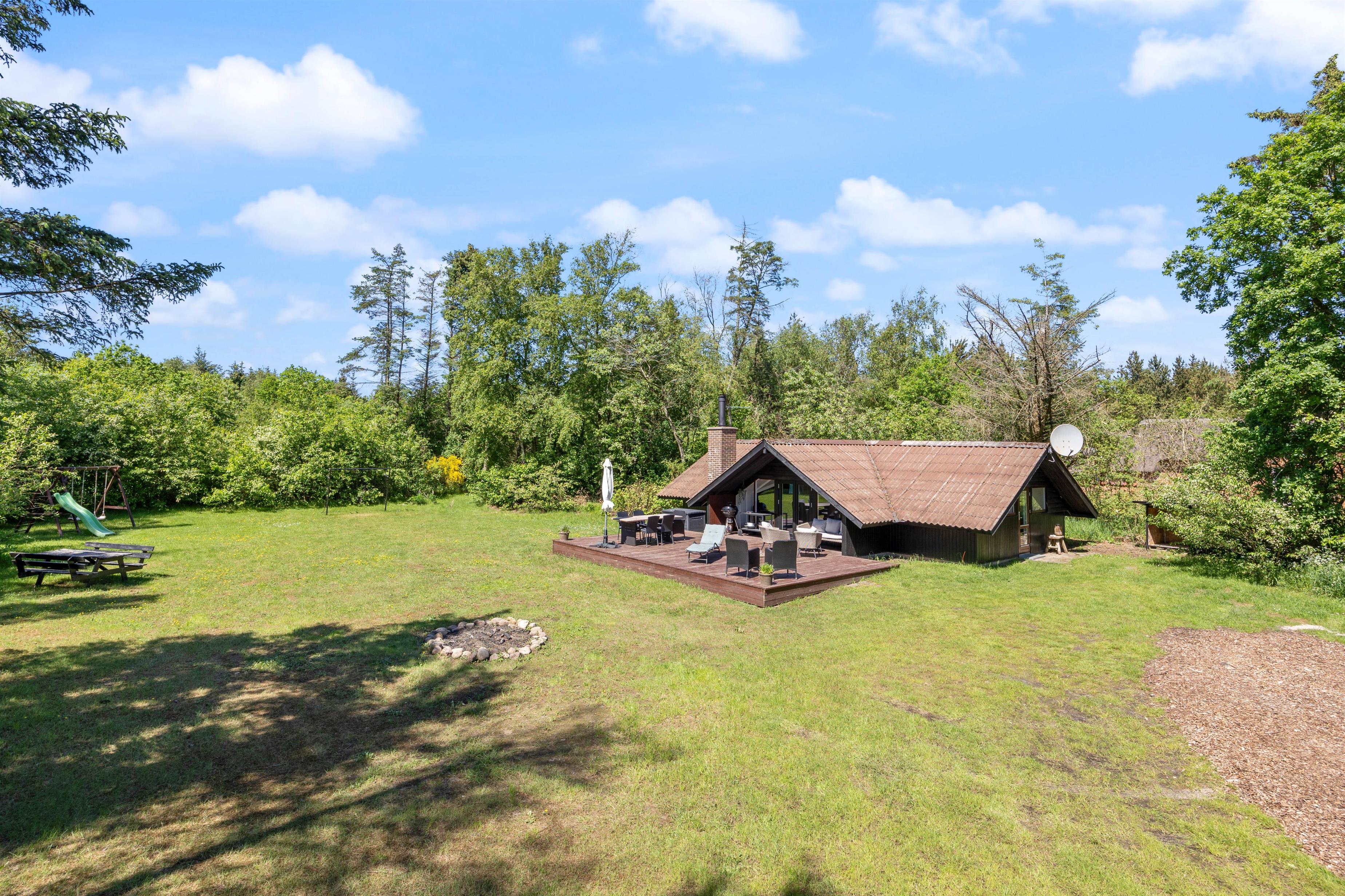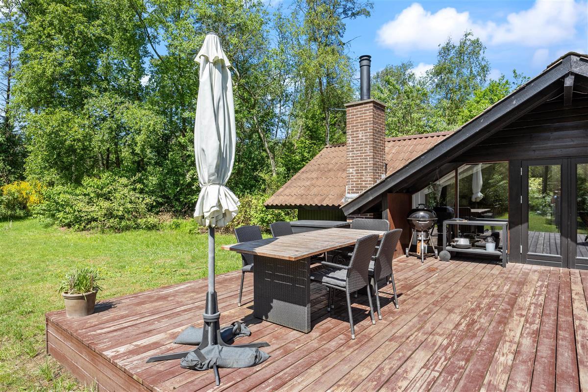 The holiday home sits within beautiful grounds of 2,280 square metres. Bordered by tall spruce trees, the plot invites outdoor living with a lovely terrace furnished with garden furniture and a sun lounger. Why not try an afternoon nap in the hammock?