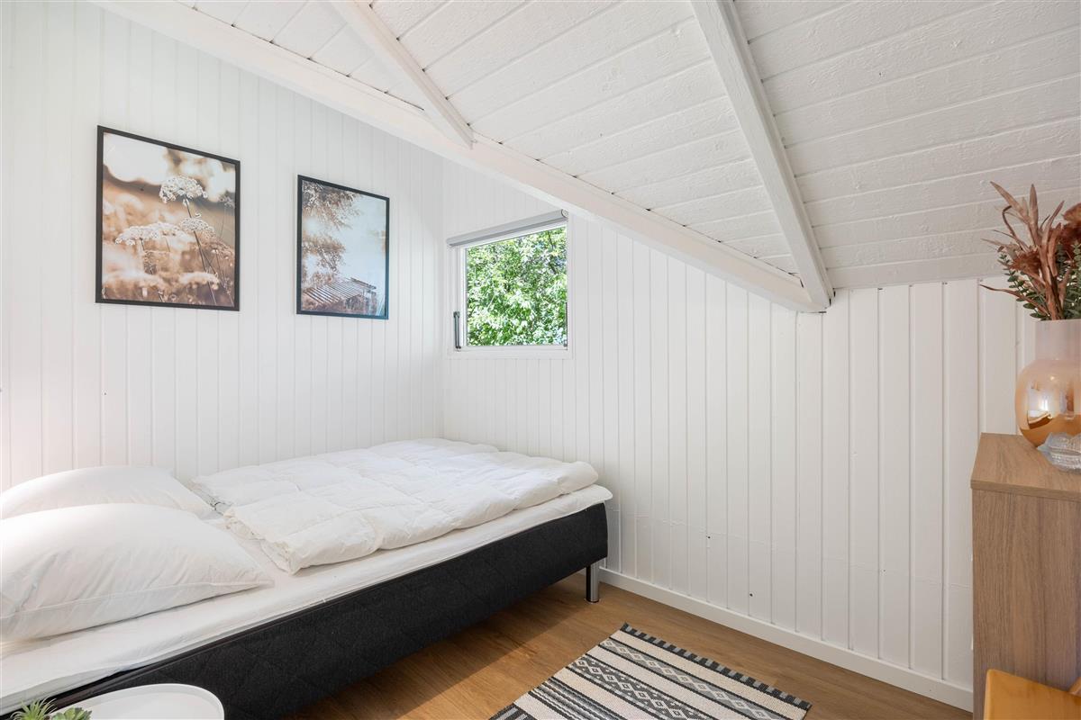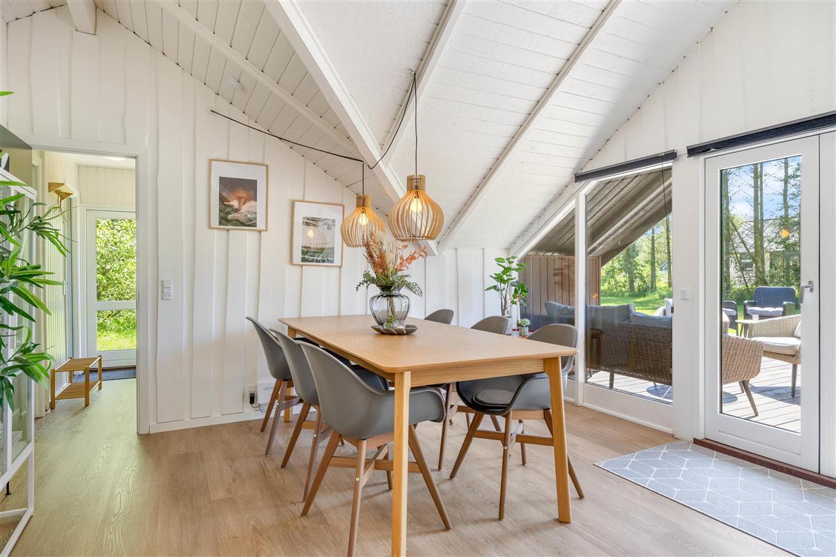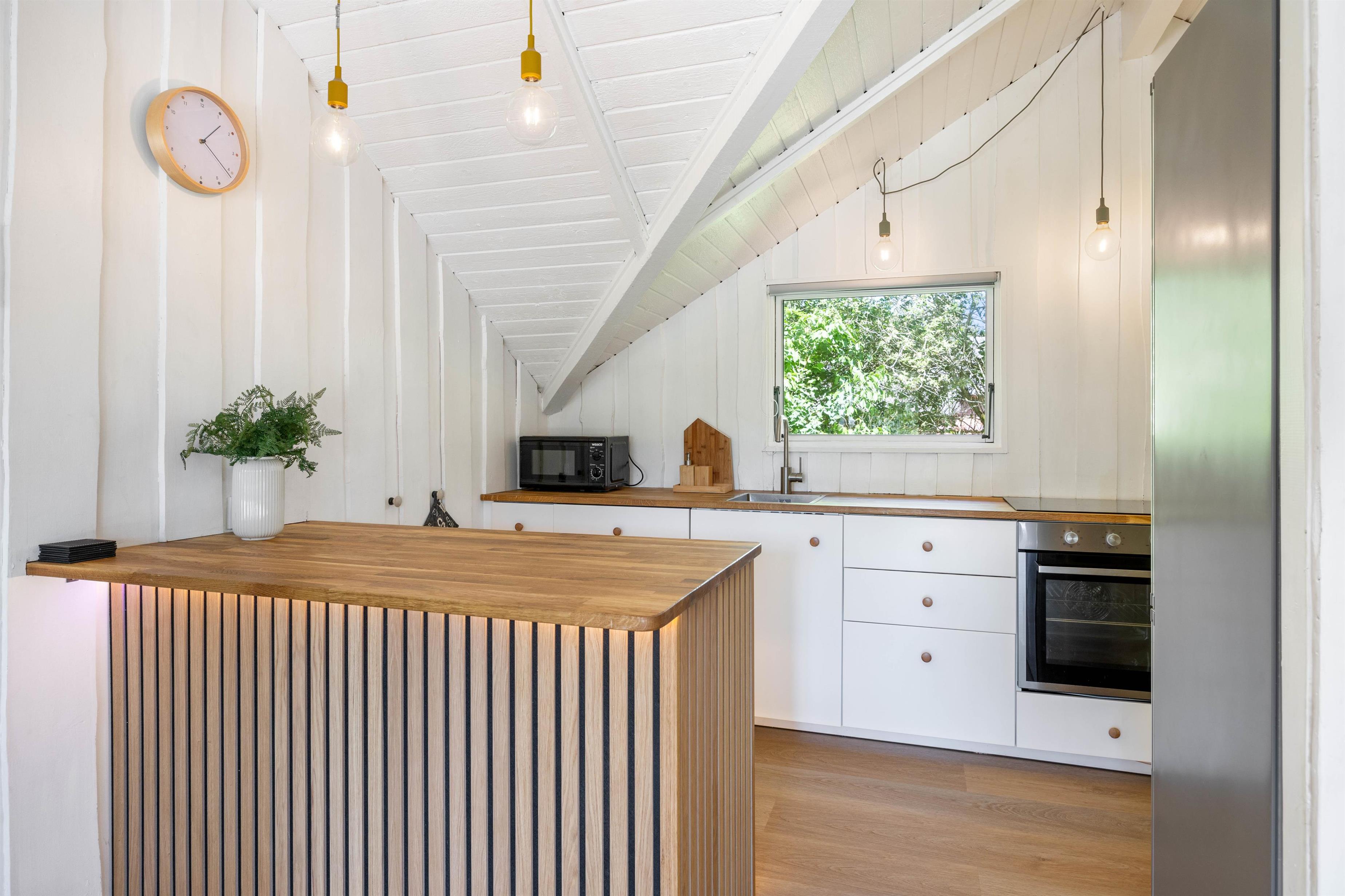You'll feel at home the moment you enter your holiday home, and you'll notice the attention to detail in the 2021 renovation. White wooden panelling runs throughout the house, while high ceilings in the living area and bright furnishings create an inviting and friendly atmosphere. The compact kitchen is well-equipped and practical, with a dishwasher making life easier.
