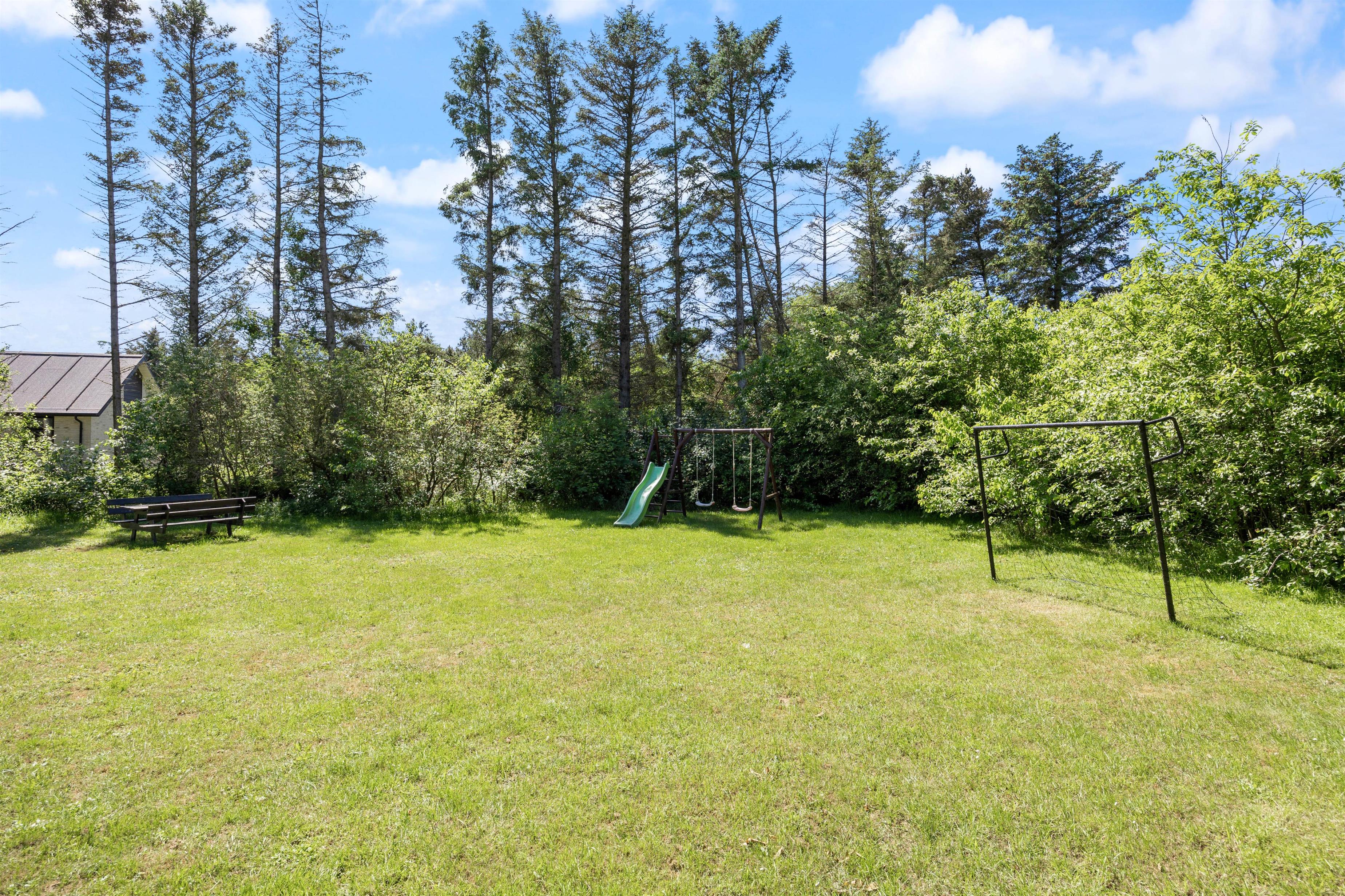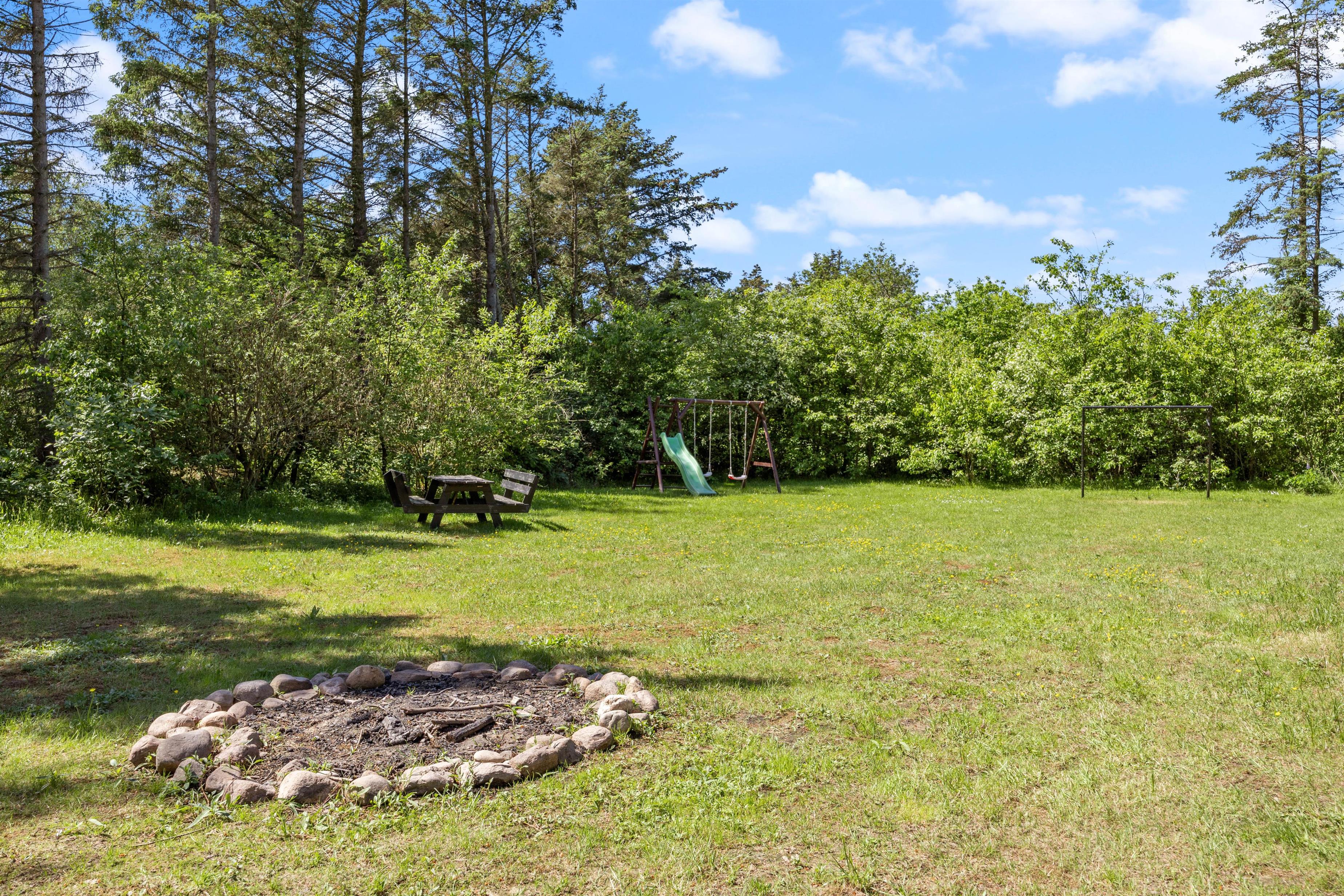 The grounds offer plenty of space for play and activities, perfect for both children and your dog. Along with a swing, slide, and football goal, there's a fire pit available. You might enjoy gathering around the fire on the benches, perhaps making campfire bread and relaxing as evening falls.