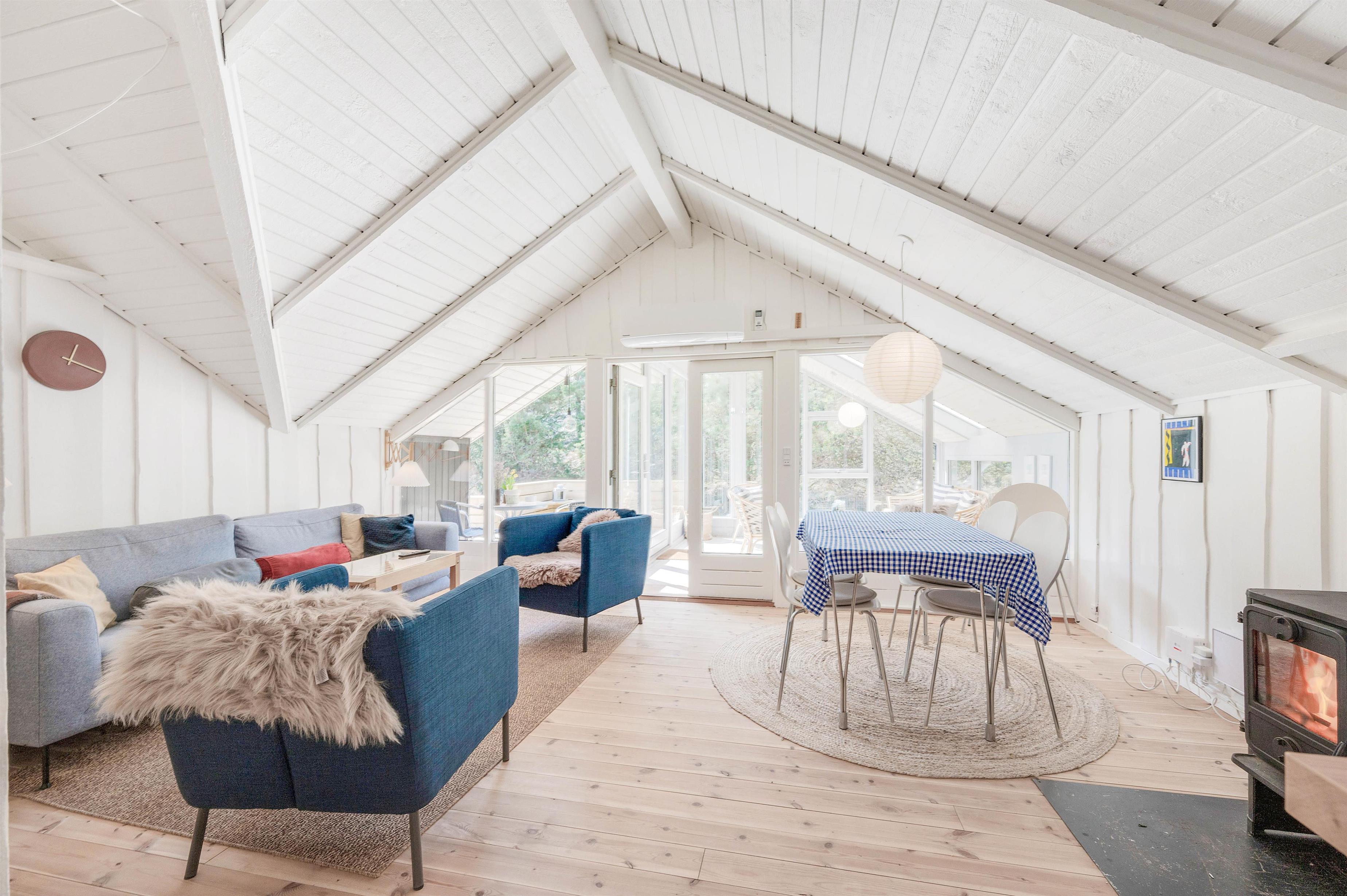 Bright and cosy interior with wood-burning stove
